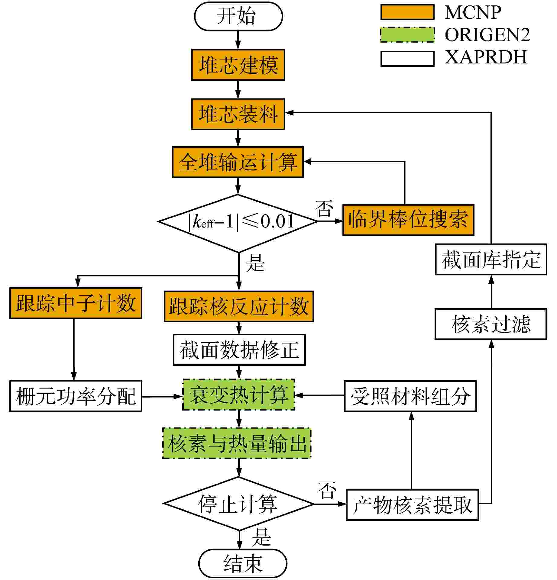摘要: 为了给脉冲堆的余热导出数值计算提供更为精细可信的能量源项,通过耦合MCNP程序和ORIGEN2程序,提出了计算方法XAPRDH以及开发了同名程序。方法实现上,首先将每个燃料元件的燃料部分(含控制棒跟随体)以轴向10等分、径向3等分的形式分割为30个独立单元,全堆共形成3180个单元;然后通过灵活调用MCNP程序和ORIGEN2程序获取每个单元的材料组分、核反应截面、中子通量密度和裂变功率,最终实现对各单元衰变热的独立计算和跟踪。分析表明,本文的燃耗评价数据与文献值符合较好,与实验值在测量误差范围内吻合,全堆衰变热计算结果也与行业标准符合,说明本文建立的衰变热精细化计算方法可行,计算结果可信。Abstract: In order to provide a more precise and reliable energy source term for the numerical calculation of waste heat export of pulsed reactor, the calculation method XAPRDH and the program with the same name are developed by coupling MCNP program and ORIGEN2 program. In terms of method realization, firstly, the fuel part of each fuel element (including the control rod follower) is divided into 30 independent units in the form of 10 equal parts in the axial direction and 3 parts in the radial direction, forming a total of 3180 units in the whole reactor; Then, the material composition, nuclear reaction cross section, neutron flux density and fission power of each unit are obtained by flexibly calling MCNP program and ORIGEN2 program, and finally the decay heat of each unit is calculated and tracked independently. The analysis shows that the burnup evaluation data in this paper are in good agreement with the literature values, and are consistent with the experimental values within the measurement error range. The decay heat calculation results of the whole reactor are also in line with the industry standards, indicating that the fine calculation method of decay heat established in this paper is feasible and the calculation results are reliable.-