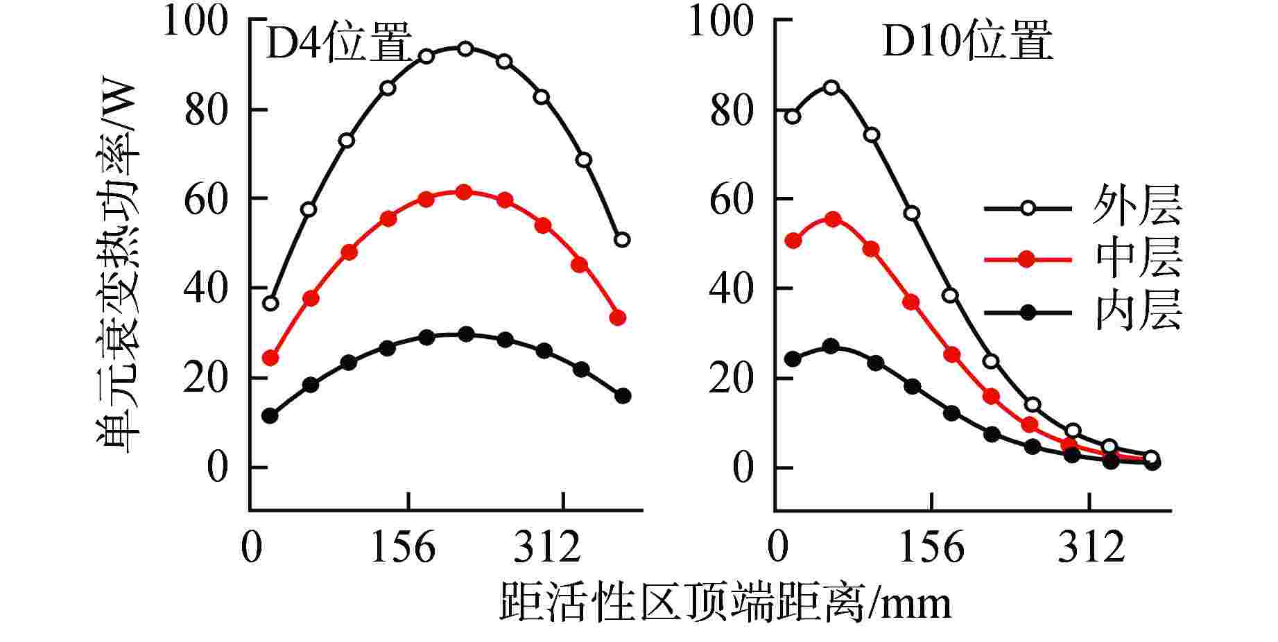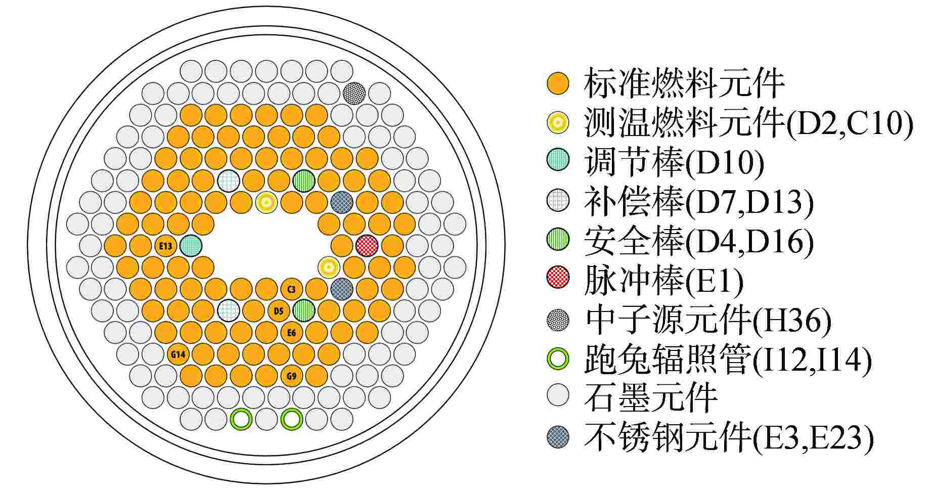 表 1 西安脉冲堆MCNP建模参数 Table 1. MCNP Modeling Parameters for XAPR 部件名称 结构体 材料 密度/(g·cm−3) 内径/cm 外径/cm 长度/cm 燃料元件 锆棒 Zr 6.44 0 0.46 39 燃料芯块 UZrH1.6 6.1792 0.46 3.61 39 上反射层 石墨 1.65 0 3.61 9.6 下反射层 石墨 1.65 0 3.61 9.75 气隙 4He 1.6094×10−4 3.61 3.62 58.35 上端塞 0Cr18Ni11Ti 7.9 0 3.62 1.6 下端塞 0Cr18Ni11Ti 7.9 0 3.62 1.45 包壳 0Cr18Ni11Ti 7.9 3.62 3.72 61.4 石墨元件 石墨芯块 石墨 1.65 0 3.4 58.5 气隙 4He 1.6094×10−4 3.4 3.5 58.5 上下端塞 Al 2.707 0 3.5 1.45 包壳 Al 2.707 3.5 3.7 61.4 稳态控制棒 吸收体 B4C 1.851 0 3.57 39 锆棒 Zr 6.44 0 0.46 39 燃料跟随体 UZrH1.6 6.1792 0.46 3.61 39 上反射层 石墨 1.65 0 3.61 16 下反射层 石墨 1.65 0 3.61 14 气隙 4He 1.6094×10−4 3.57/3.61 3.62 78 上下端塞 0Cr18Ni11Ti 7.9 0 3.62 2.25 包壳 0Cr18Ni11Ti 7.9 3.62 3.72 112.5 脉冲控制棒 吸收体 B4C 1.851 0 2.97 39 气隙 空气 1.293×10−3 2.97 3.02 39 下部气腔 空气 1.293×10−3 0 3.02 54.6 上部簧室 空气 1.293×10−3 0 3.02 15 上下端塞 0Cr18Ni11Ti 7.9 0 3.02 1.95 包壳 0Cr18Ni11Ti 7.9 3.02 3.12 112.5 中子源元件 源盒内腔 AmO2−Be 1.5 0 1.6 3 源盒外壁 0Cr18Ni11Ti 7.9 1.6 3.1 3 源盒上下端盖 0Cr18Ni11Ti 7.9 0 3.1 0.9 上部气腔 空气 1.293×10−3 0 3.1 6.85 下部气腔 空气 1.293×10−3 0 3.1 7.15 上下端塞 0Cr18Ni11Ti 7.9 0 3.1 6.63 外套管 0Cr18Ni11Ti 7.9 3.1 3.6 72.06 围筒及堆池 内层围筒 Al 2.699 69.8 72.2 71 水隙 水 0.9982 72.2 73.4 71 铝反射层 Al 2.699 73.4 75 71 铅屏蔽层 Pb 11.35 75 80 71 外层围筒 Al 2.699 80 81.6 71 堆池 水 0.9982 0 120 200