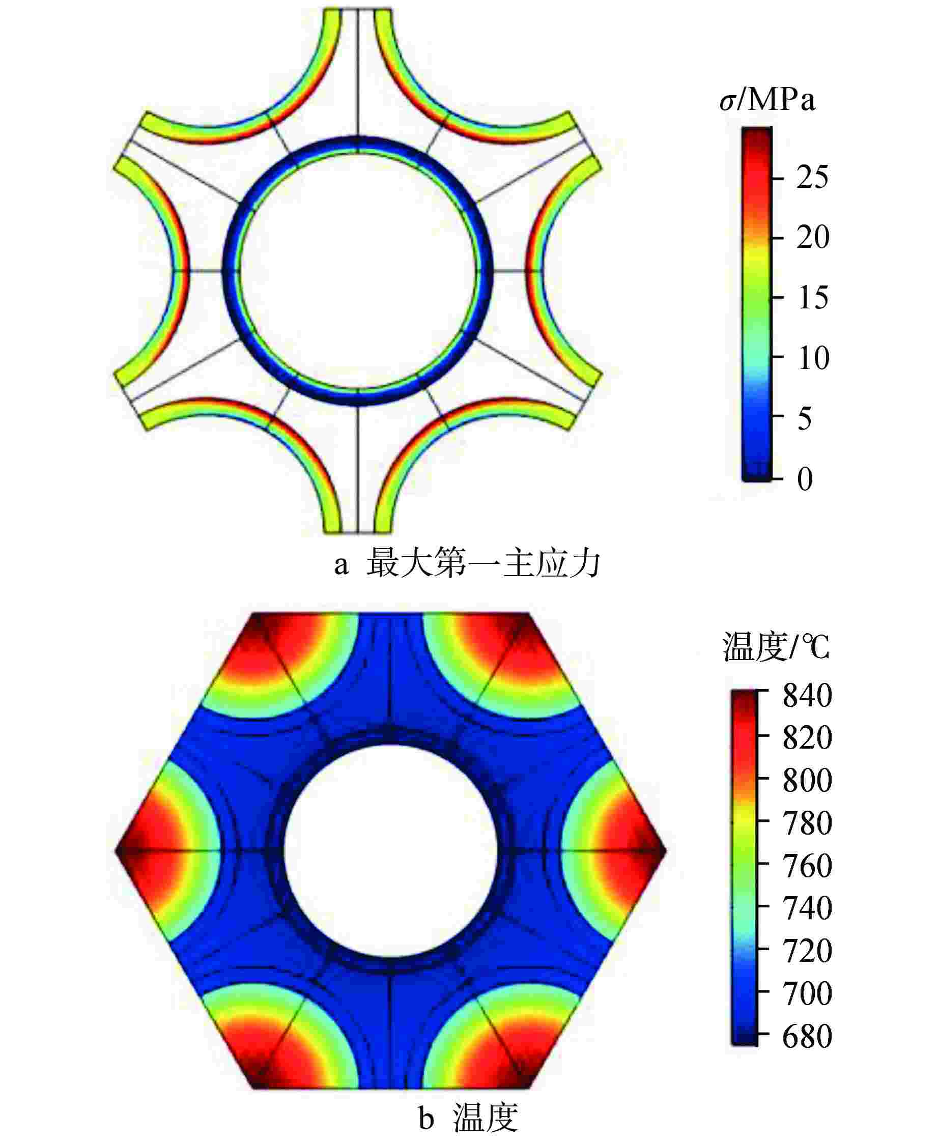 方案 优化变量 芯块 包壳/基体结构 a 填充物 燃料包壳外径/mm 装配间隙/mm 最高温度/℃ σ/MPa 最高温度/℃ σ0.2/MPa σ/σ0.2 氦气 16.185 0.10 910 45.2 779 90.36 0.50 液态钠 16.185 0.18 851 68.1 723 99.32 0.69 氟化盐 16.185 0.24 897 46.0 767 92.28 0.50 b 填充物 基体厚度/mm 装配间隙/mm 最高温度/℃ σ/MPa 最高温度/℃ σ0.2