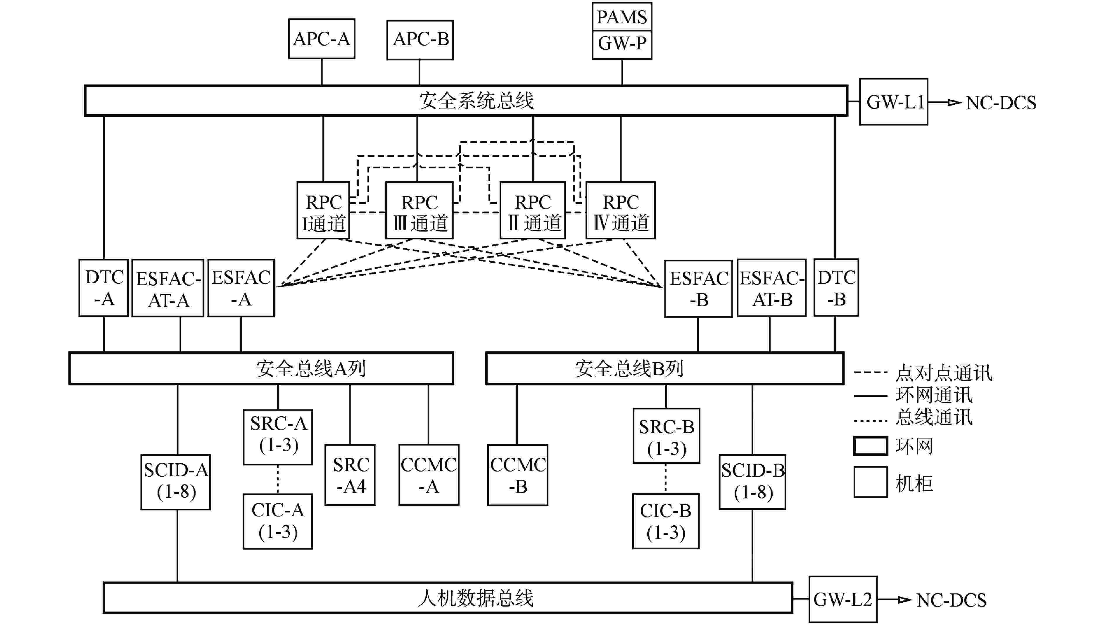 序号 名称 简介 1 RPC 反应堆停堆保护系统机柜,通常使用PxCy代表x通道y子组,每组包含A/B两个网络节点 2 ESFAC 专设安全设施驱动系统机柜,分A/B两列,每列包含1/2两个网络节点 3 ESFAC-AT 自动试验柜,包含A/B两个网络节点 4 DTC 数据传输柜,分A/B两列,每列包含1/2两个网络节点 5 SRC 安全相关系统机柜,分A/B两列,A列分四组,B列分三组,每组包含A/B两个网络节点 6 CCMC 堆芯冷却监视系统机柜,分A/B两列,每列包含A/B两个网络节点 7 APC 安全级报警系统机柜,分A/B两列,每列包含A/B两个网络节点 8 GW 网关系统机柜,分L1/L2两层网关,每层网关分A/B两个网络节点 9 GW-P 事故后监视系统(PAMS系统)网关柜,包含A/B两个网络节点 10 SCID 安全控制显示系统操作盘台,分A/B两列,每列包含1~8共八个网络节点 表 2 安全系统总线共因故障表