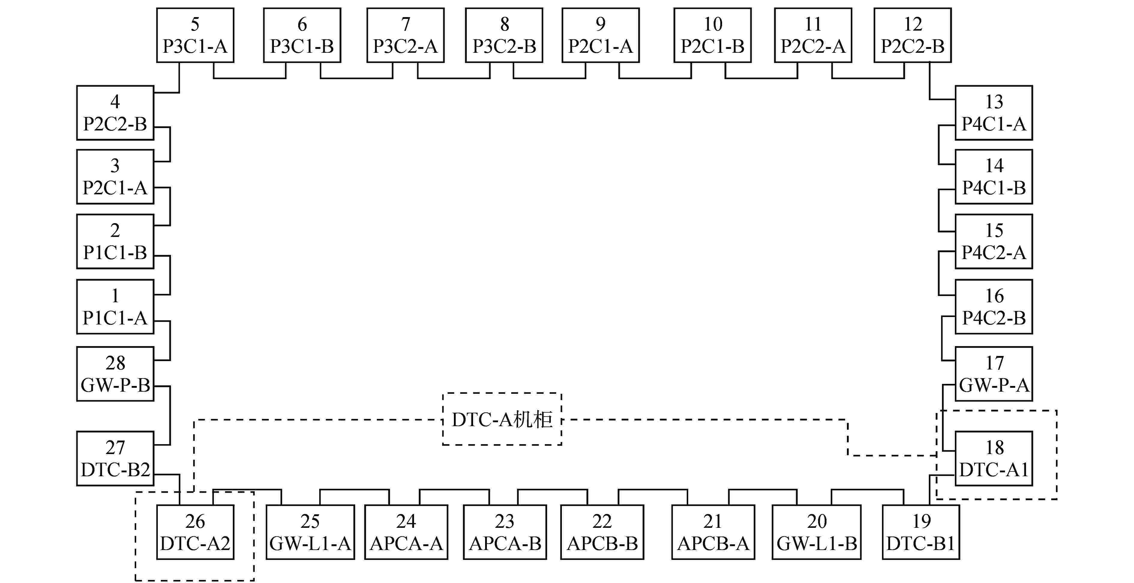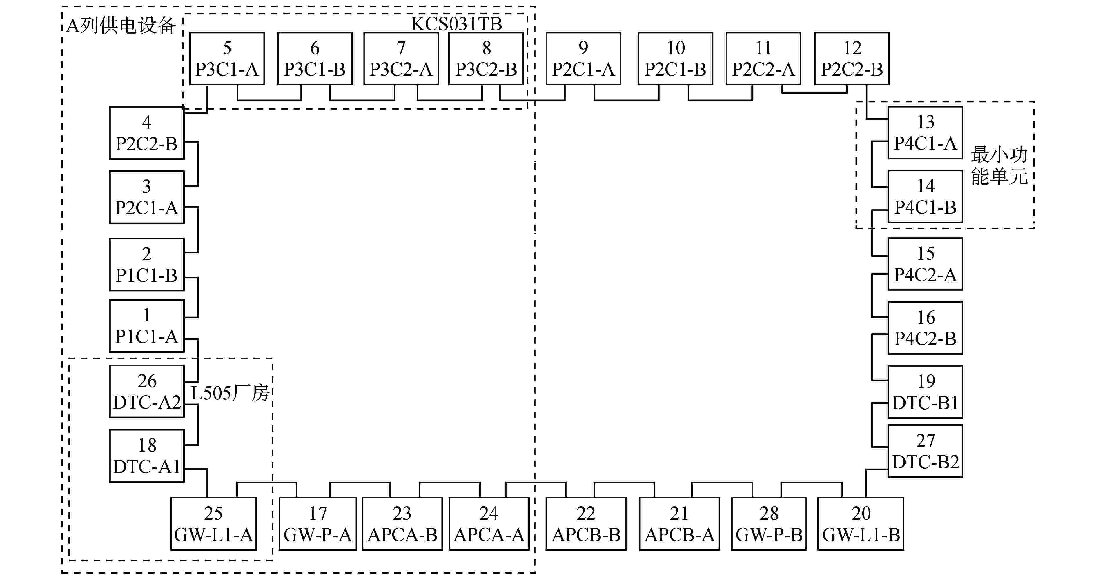 节点序号 节点名称 电源 实体位置 功能 母电源 子电源柜 厂房 机柜/盘台 24 APCA-A A列 KCS403TB L507 KCS321AR 功能14:A列报警处理功能 23 APCA-B 功能14:A列报警处理功能备用 17 GW-P-A KCS311AR 功能9:A列PAMS网关 25 GW-L1-A L505 KCS301AR 功能15:A列L1网关 18 DTC-A1 KCS401TB/403TB KCS211AR 功能10:A列数据传输功能 26 DTC-A2 功能10:A列数据传输功能 1 P1C1-A KCS011TB W609 KCS011AR 功能1:停堆保护1通道子组1功能 2 P1C1-B 功能1:停堆保护1通道子组1功能备用 3 P1C2-A KCS014AR 功能2:停堆保护1通道子组2功能 4 P1C2-B 功能2:停堆保护1通道子组2功能备用 5 P3C1-A KCS031TB W603 KCS031AR 功能5:停堆保护3通道子组1功能 6 P3C1-B 功能5:停堆保护3通道子组1功能备用 7 P3C2-A KCS034AR 功能6:停堆保护3通道子组2功能 8 P3C2-B 功能6:停堆保护3通道子组2功能备用 9 P2C1-A B列 KCS021TB W607 KCS021AR 功能3:停堆保护2通道子组1功能 10 P2C1-B 功能3:停堆保护2通道子组1功能备用 11 P2C2-A KCS024AR 功能4:停堆保护2通道子组2功能 12 P2C2-B 功能4:停堆保护2通道子组2功能备用 13 P4C1-A KCS041TB W602 KCS041AR 功能7:停堆保护4通道子组1功能 14 P4C1-B 功能7:停堆保护4通道子组1功能备用 15 P4C2-A KCS043AR 功能8:停堆保护4通道子组2功能 16 P4C2-B 功能8:停堆保护4通道子组2功能备用 19 DTC-B1 KCS400TB/404TB L509 KCS210AR 功能11:B列数据传输功能 27 DTC-B2 功能11:B列数据传输功能 20 GW-L1-B KCS402TB KCS300AR 功能12:B列L1网关 28 GW-P-B KCS310AR 功能16:B列PAMS网关 21 APCB-A KCS320AR 功能13:B列报警处理功能 22 APCB-B 功能13:B列报警处理功能备用 -