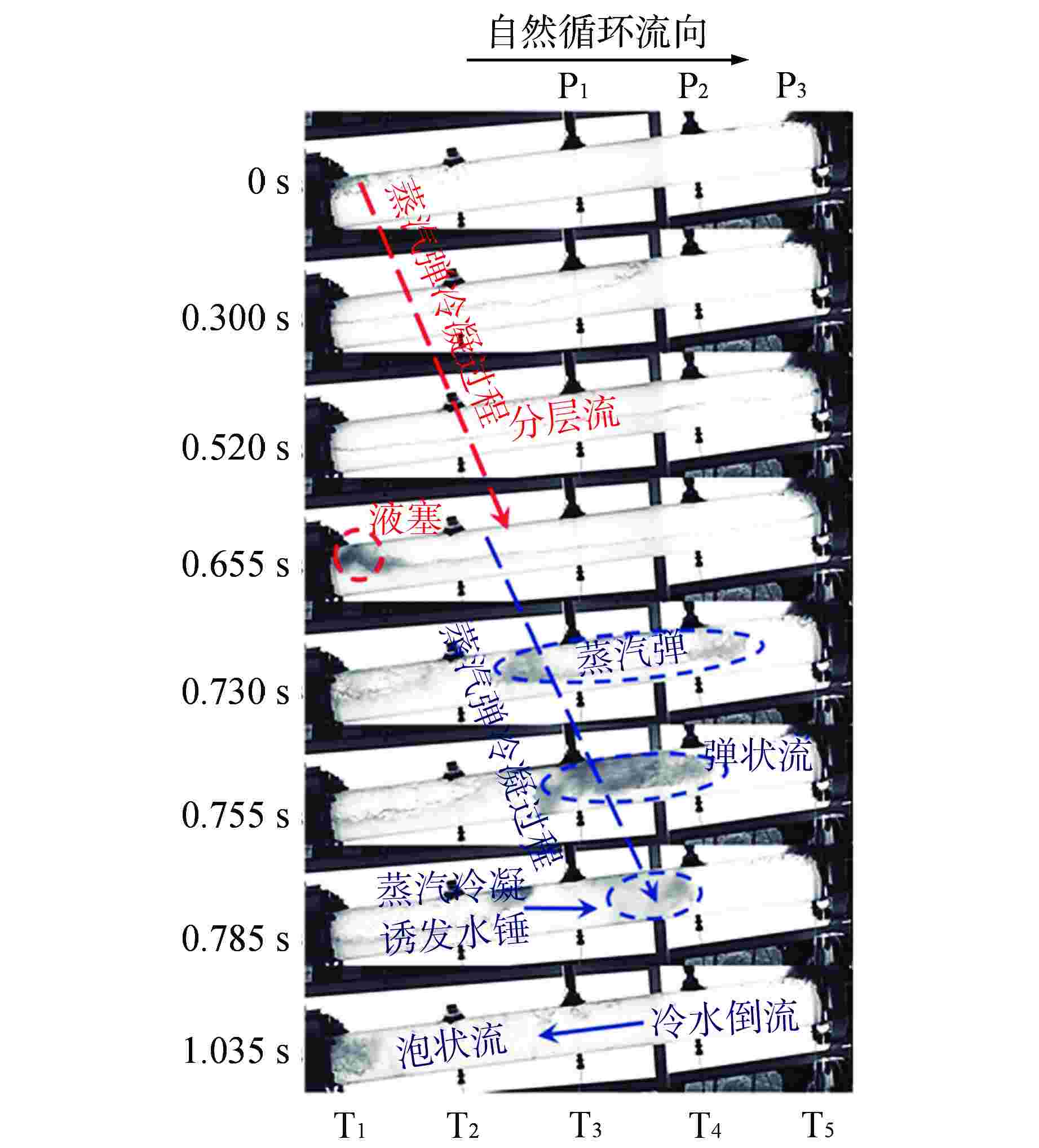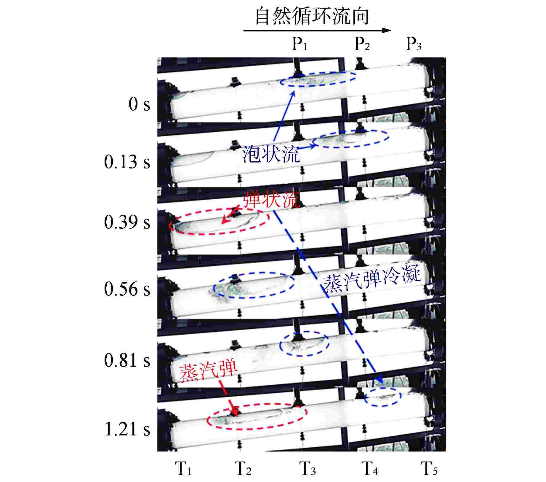摘要: 对浮动式核电站中一类具有倾斜热管段的低压低高差自然循环系统的两相流动特性进行了实验研究,分析了加热功率对两相流动特性的影响。结果表明,不同功率条件下系统存在两相稳定冷凝和伴随蒸汽冷凝诱发水锤两相振荡2种流动模式,热管段内过冷水倒流和蒸汽与低温过冷水直接接触冷凝是导致2种流动模式的内在机制。此外,蒸汽冷凝诱发水锤的发生会产生较大压力脉冲,并导致过冷水倒流长度显著增加,进而加剧系统流动不稳定。进一步研究表明,加热段出口含气率可以作为流动不稳定判断依据。Abstract: Two-phase flow characteristics of a kind of natural circulation system with low height difference and inclined heat pipe section in floating nuclear power plants are experimentally studied at low pressure. The influences of heating power on the two-phase flow characteristics are analyzed. The results show that there are two flow modes in the system under different power conditions: two-phase stable condensation and two-phase oscillation along with steam condensation induced water hammer. The backflow of subcooled water in the heat pipe section and the direct contact condensation of steam and low-temperature subcooled water are the internal mechanisms resulting in the two flow modes. In addition, the occurrence of steam condensation induced water hammer will generate large pressure pulses and cause a significant increase in the backflow length of subcooled water, which further aggravates flow instability. Further research shows that the gas content at the outlet of the heating section can be used as a basis for judging the flow instability.