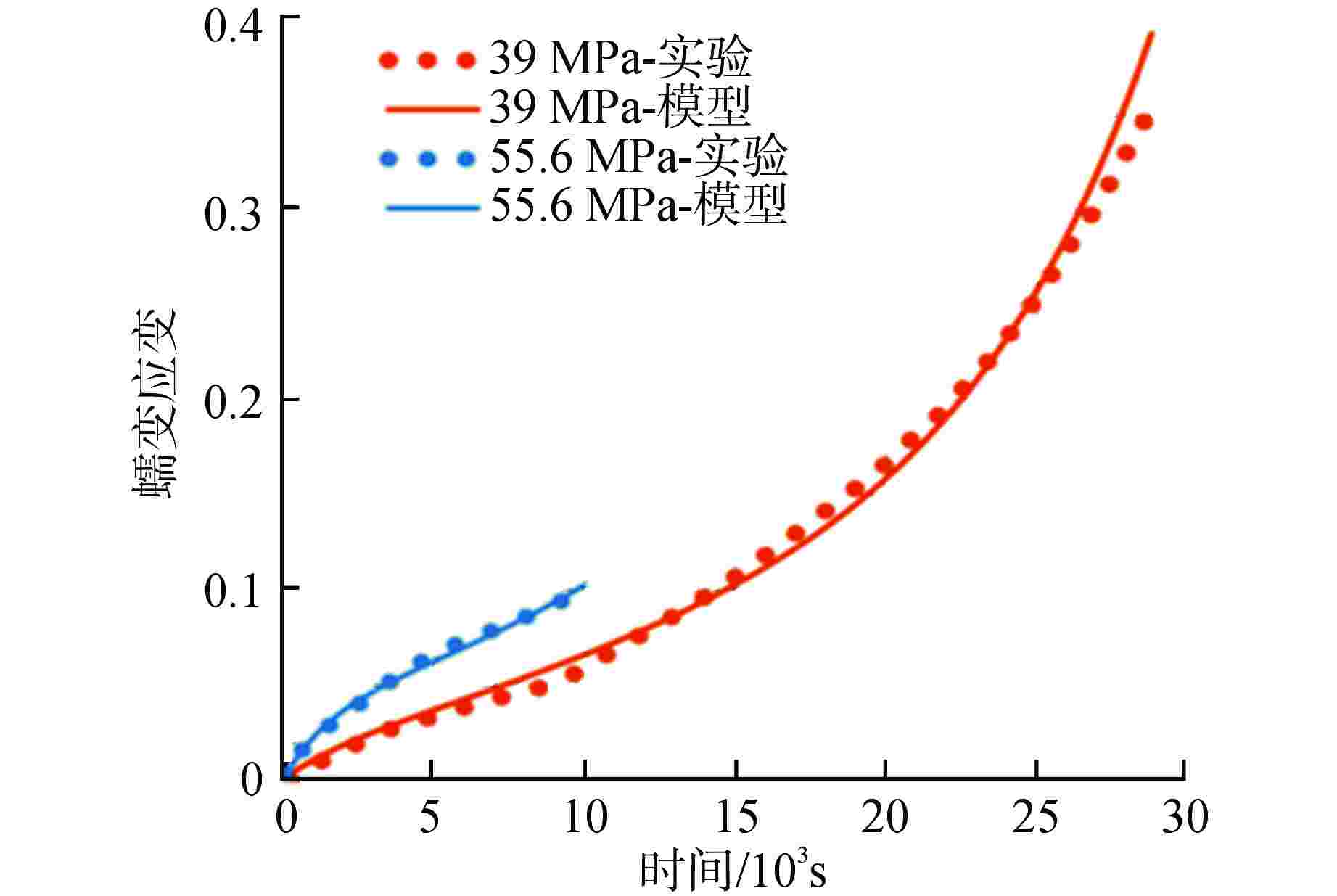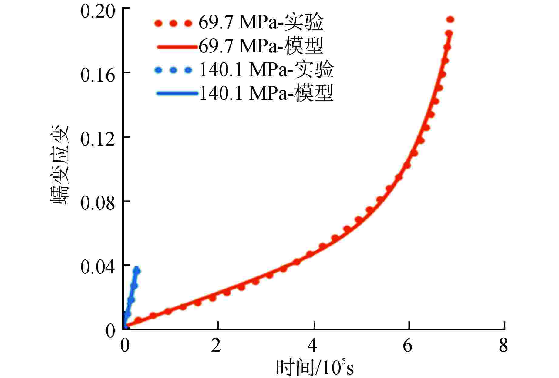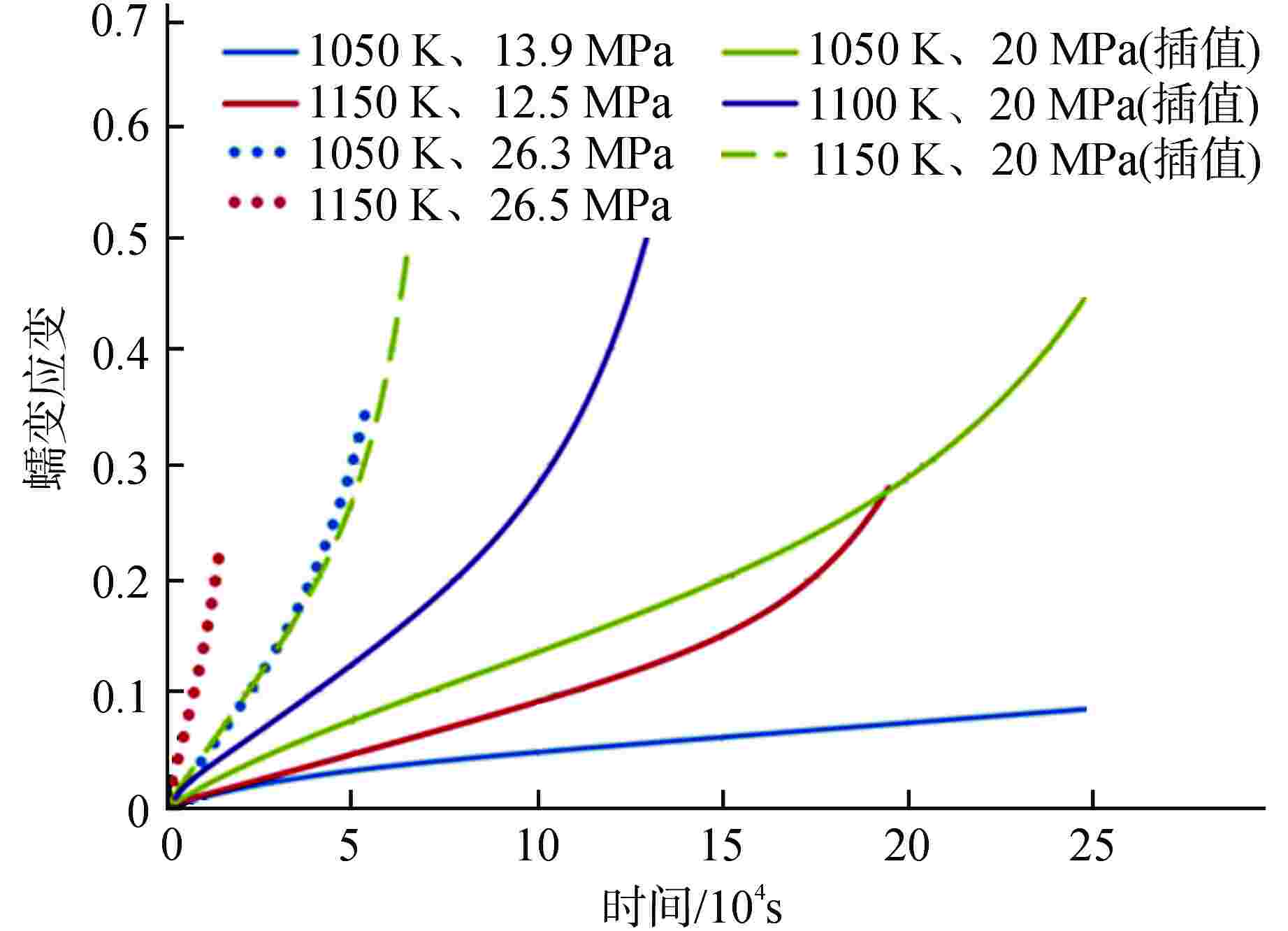 序号 温度/K 应力/MPa θ1 θ2 θm θ3 θ4 1 900 69.7 1.508×10−3 5.273×10−4 1.040×10−7 5.313×10−5 1.120×10−5 2 900 140.1 1.885×10−3 1.318×10−3 8.388×10−7 1.389×10−3 8.446×10−5 3 1000 39 1.261×10−2 5.725×10−4 4.353×10−6 2.348×10−3 1.629×10−4 4 1000 55.6 3.331×10−2 7.038×10−4 4.960×10−6 3.391×10−3 1.937×10−4 5 1050 13.9 2.431×10−2 3.287×10−5 2.438×10−7 6.799×10−5 8.315×10−6 6 1050 26.3 3.329×10−2 3.395×10−5 3.023×10−6 5.174×10−3 6.418×10−5 7 1150 12.5 2.076×10−3 5.992×10−4 8.784×10−7 2.901×10−5 4.202×10−5 8 1150 26.5 1.084×10−2 9.838×10−3 1.129×10−5 4.107×10−3 1.949×10−4 9 1250 8 7.841×10−3 2.692×10−4 1.075×10−6 2.804×10−4 3.056×10−5 10 1250 12.6 1.904×10−2 2.296×10−3 9.741×10−6 1.056×10−2 4.336×10−4 11 1250 26.5 1.156×10−1 3.931×10−2 8.290×10−5 5.506×10−3 2.542×10−2 12 1373 3.5 1.188×10−2 2.467×10−5 1.018×10−6 1.594×10−4 4.164×10−5 13 1373 7 3.308×10−2 8.674×10−3 5.000×10−5 3.369×10−3 1.965×10−3 -