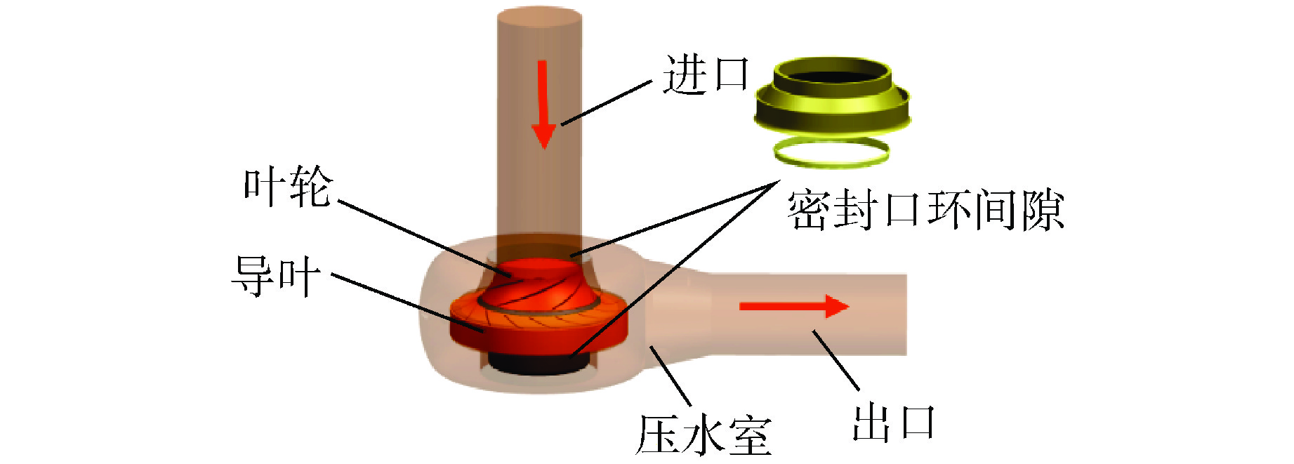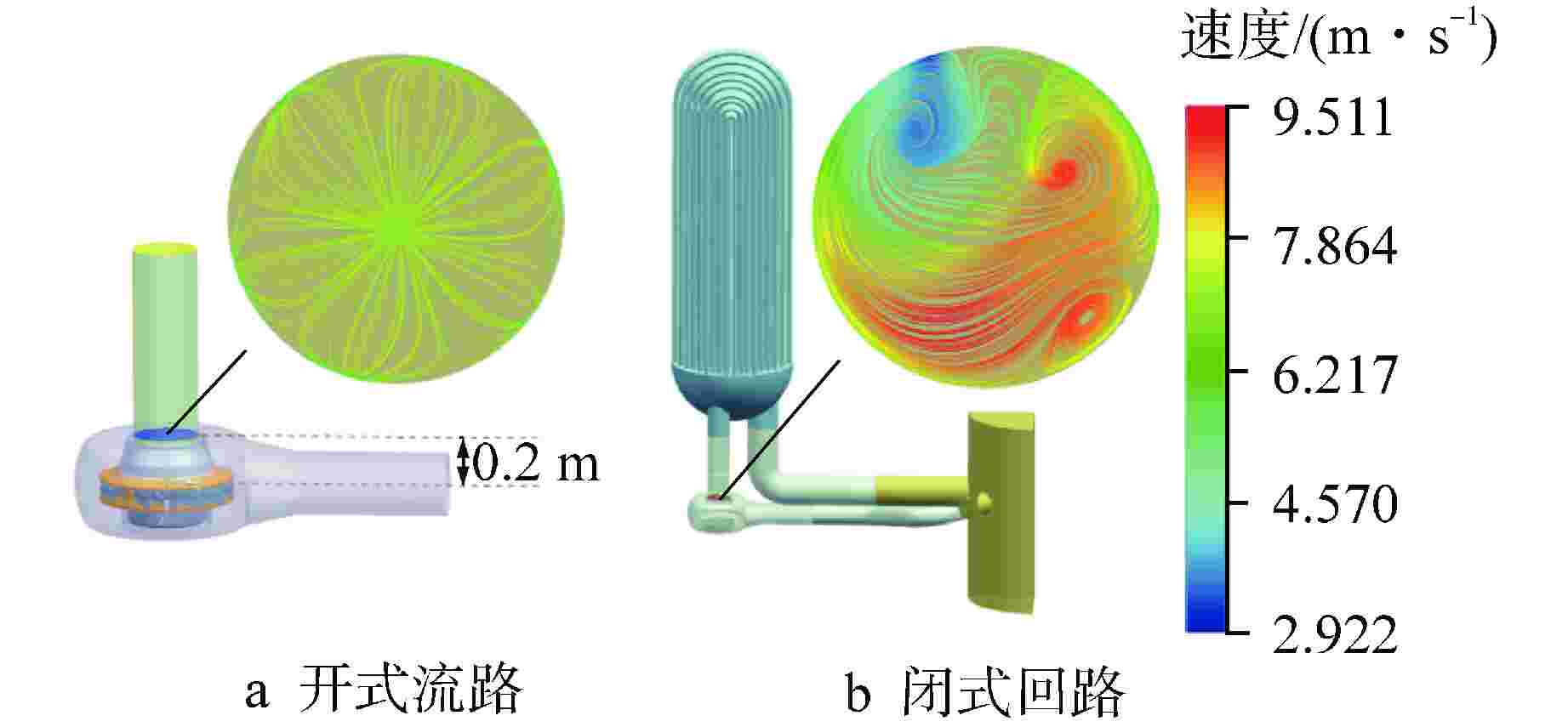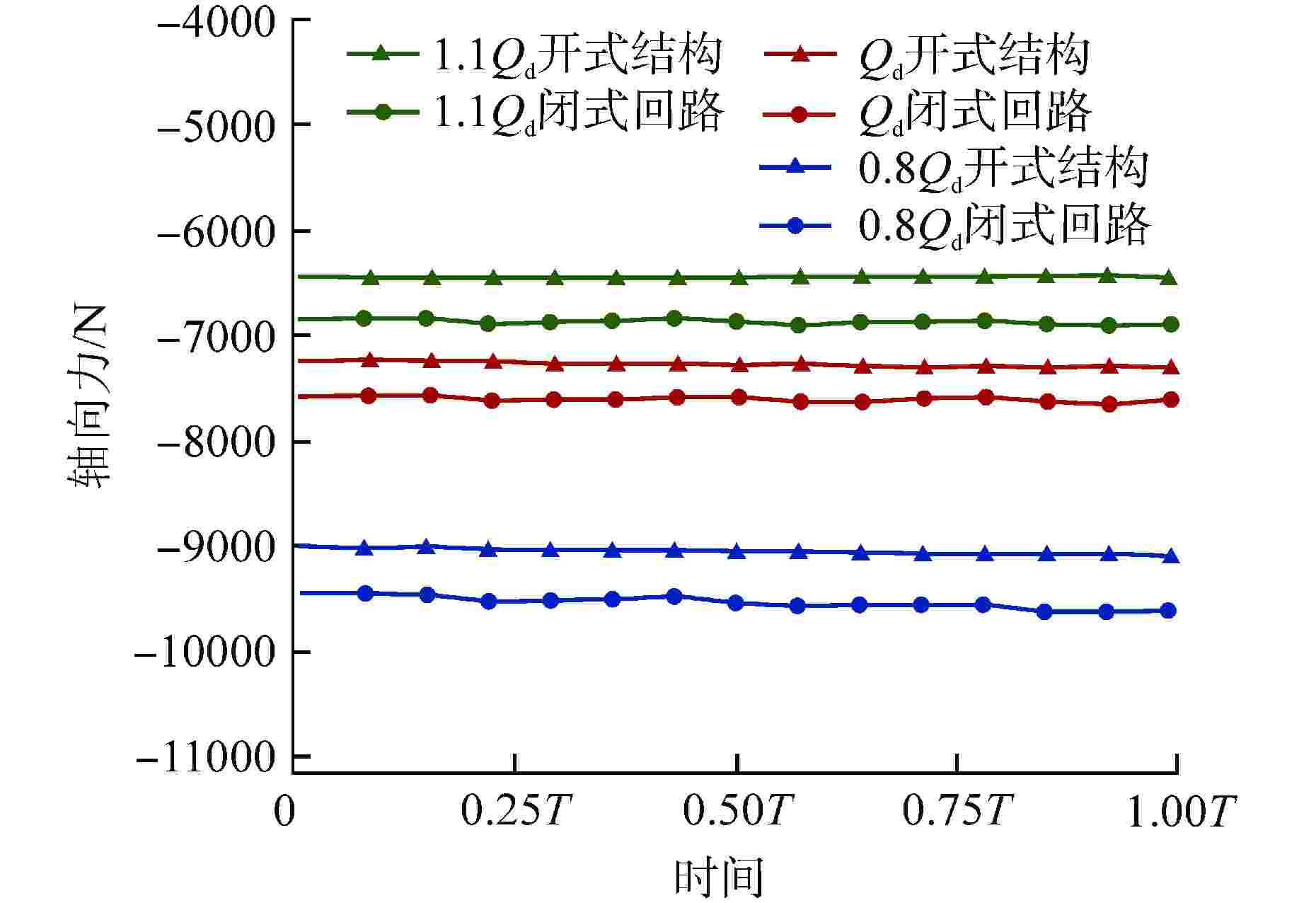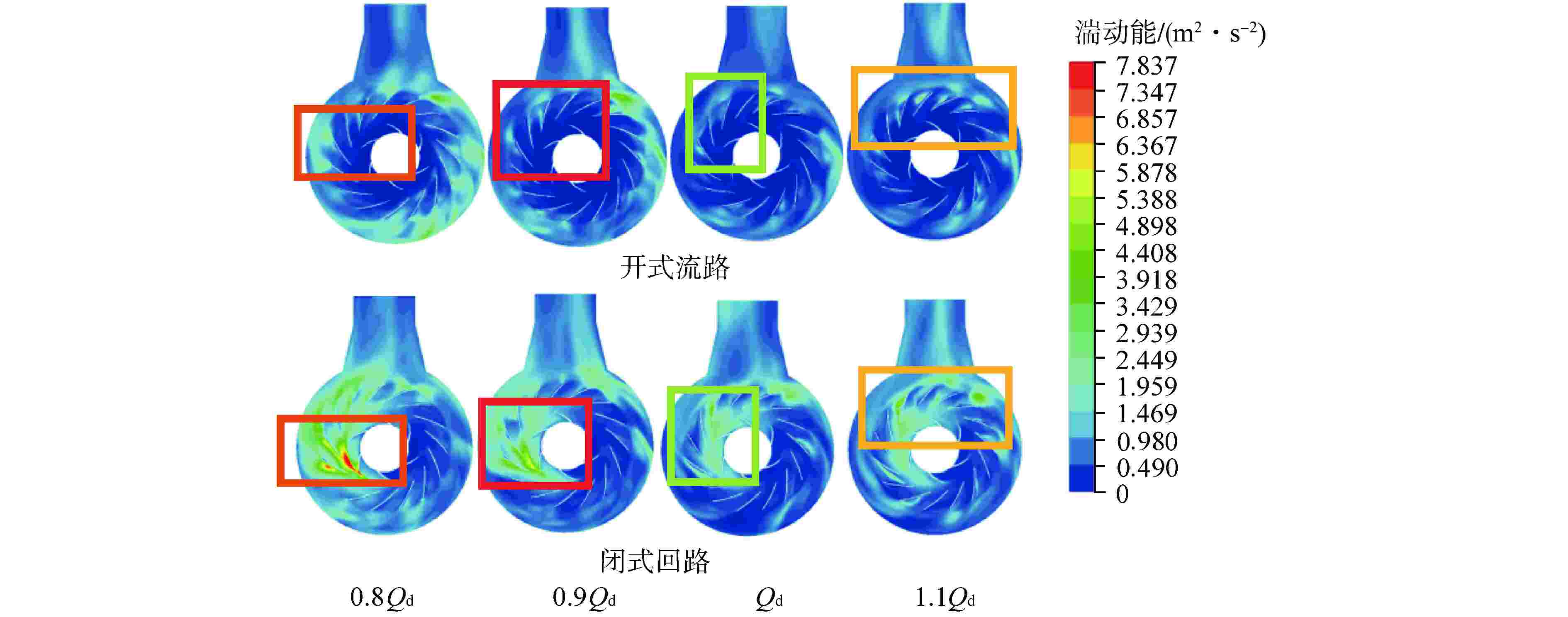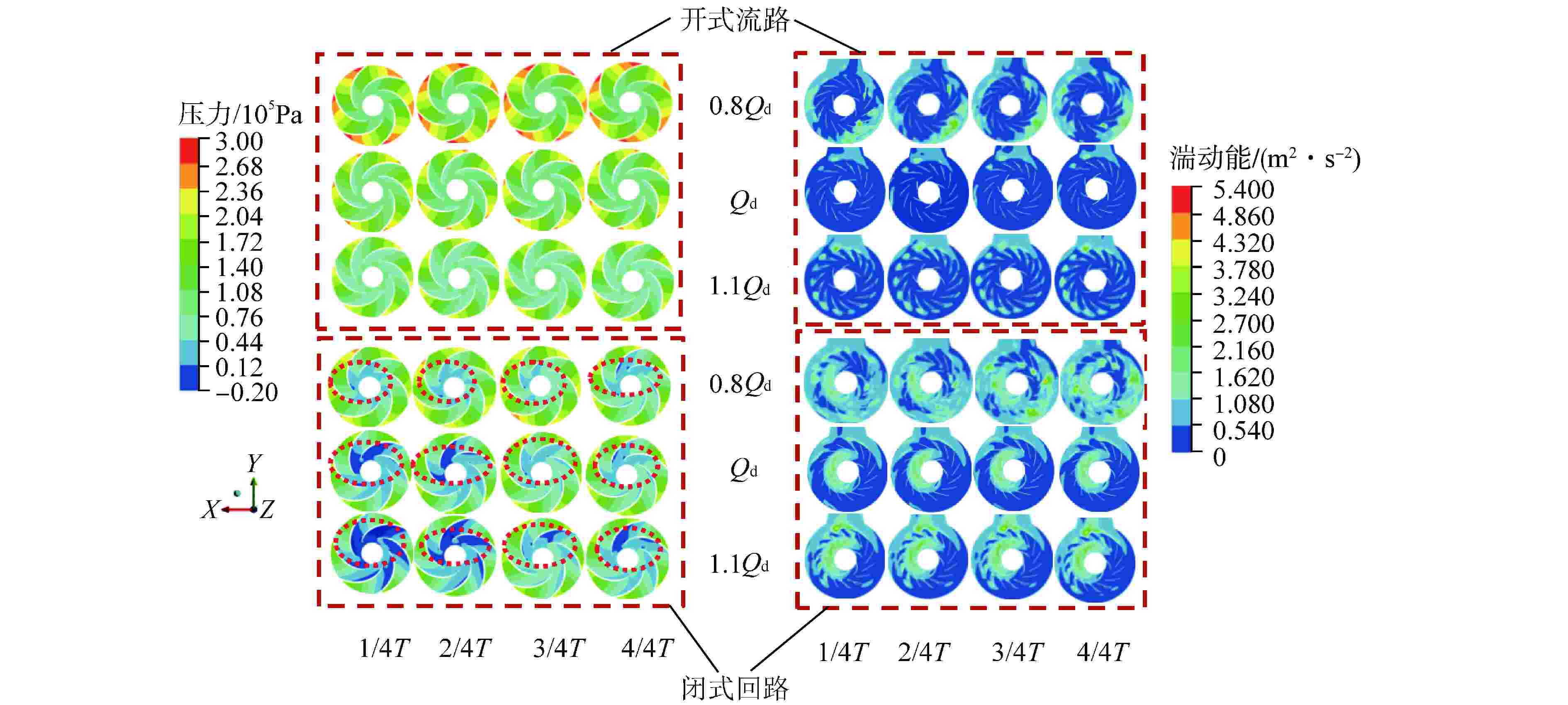 摘要: 传统的主泵流动分析平台多为简化的开式流路,与真实闭式回路运行工况存有较大差异。为探究主泵在真实回路中的流动特性与机理,以包含密封口环间隙的主泵全通道水力模型为研究对象,采用源项法进行稳态、瞬态计算分析研究。稳态计算结果表明:闭式循环回路中形成漩涡流态,致使主泵进口处发生预旋,产生入流畸变,导致湍动能有所增加,能量分布不均匀;瞬态计算结果表明:相较于开式流路,闭式回路入流畸变带来流场压力、速度、湍动能、压力脉动等特性的变化,导致泵体扬程、效率均有所下降,所受径向力、轴向力增大。闭式循环回路架构针对主泵流动性能的分析更接近真实流动。Abstract: The traditional main pump flow analysis platform is mostly a simplified open flow path, which is quite different from the real closed loop operation conditions. In order to explore the flow characteristics and mechanism of the main pump in the real loop, this paper takes the full-channel hydraulic model of the main pump with seal ring clearance as the research object, and uses the source term method for steady-state and transient calculation and analysis. The steady-state calculation results show that the vortex flow pattern is formed in the closed circulation loop, which leads to pre-swirl at the inlet of the main pump and inflow distortion, resulting in the increase of turbulent kinetic energy and uneven energy distribution. The transient calculation results show that compared with the open flow path, the inflow distortion of the closed loop brings changes in the characteristics of flow field pressure, velocity, turbulent kinetic energy and pressure fluctuation, which leads to the decrease of pump head and efficiency and the increase of radial force and axial force. The analysis of the flow performance of the main pump based on the closed loop structure is closer to the real flow.