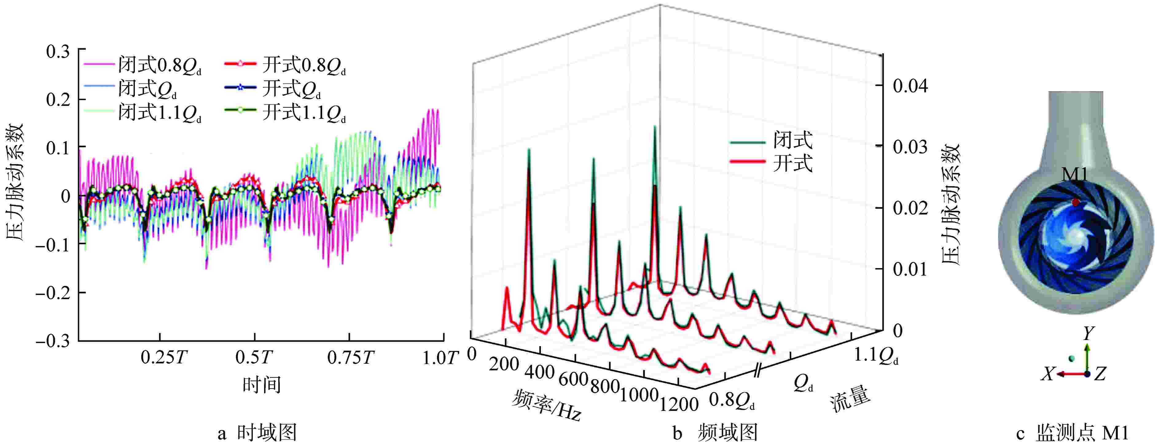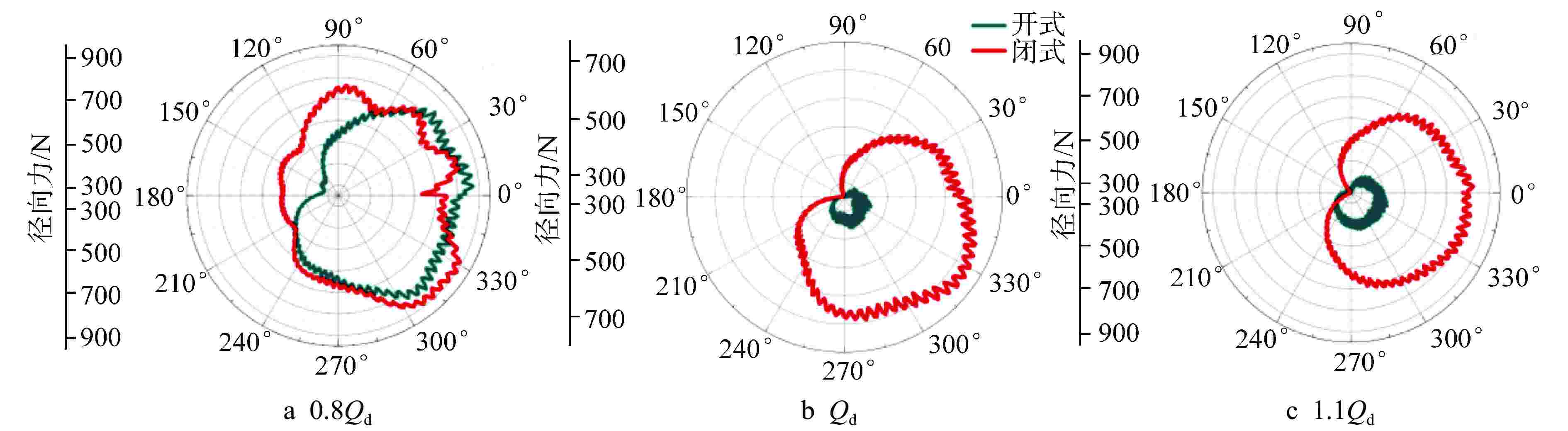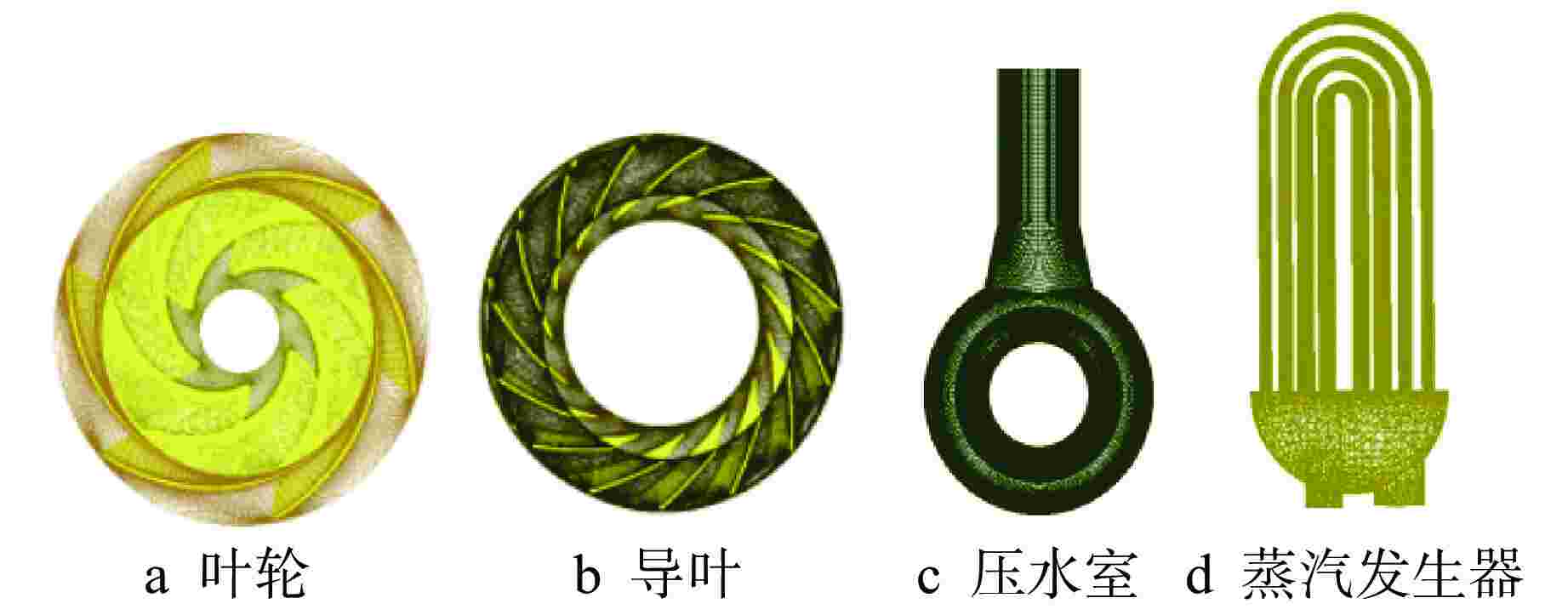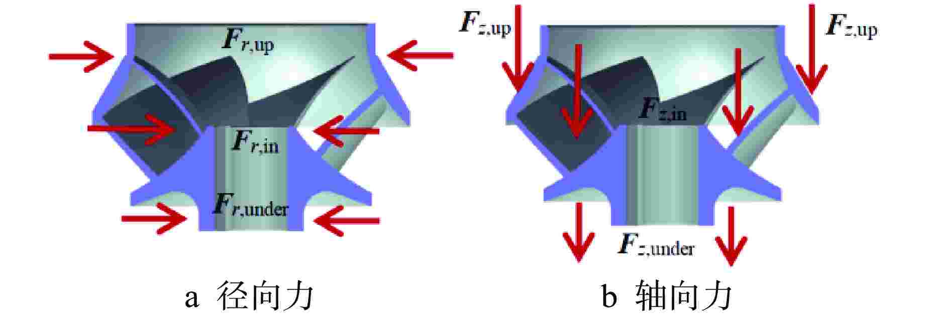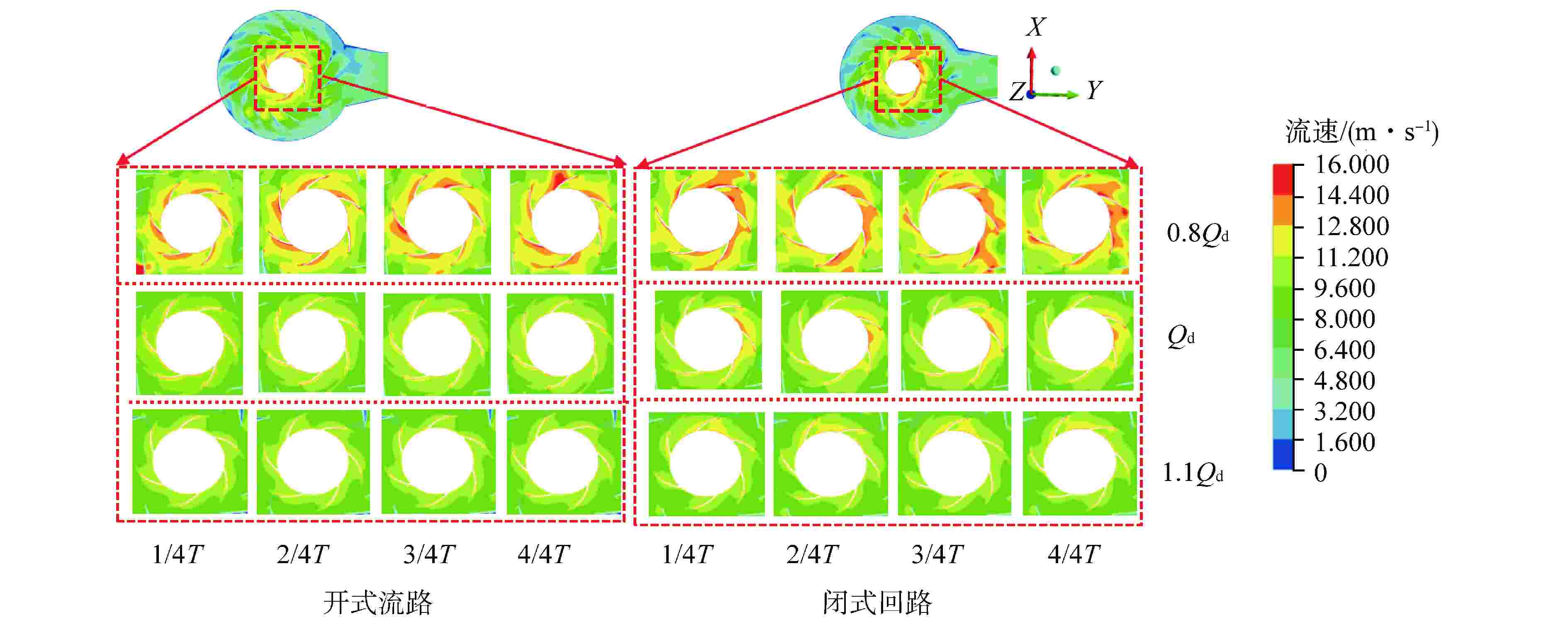 摘要: 传统的主泵流动分析平台多为简化的开式流路,与真实闭式回路运行工况存有较大差异。为探究主泵在真实回路中的流动特性与机理,以包含密封口环间隙的主泵全通道水力模型为研究对象,采用源项法进行稳态、瞬态计算分析研究。稳态计算结果表明:闭式循环回路中形成漩涡流态,致使主泵进口处发生预旋,产生入流畸变,导致湍动能有所增加,能量分布不均匀;瞬态计算结果表明:相较于开式流路,闭式回路入流畸变带来流场压力、速度、湍动能、压力脉动等特性的变化,导致泵体扬程、效率均有所下降,所受径向力、轴向力增大。闭式循环回路架构针对主泵流动性能的分析更接近真实流动。Abstract: The traditional main pump flow analysis platform is mostly a simplified open flow path, which is quite different from the real closed loop operation conditions. In order to explore the flow characteristics and mechanism of the main pump in the real loop, this paper takes the full-channel hydraulic model of the main pump with seal ring clearance as the research object, and uses the source term method for steady-state and transient calculation and analysis. The steady-state calculation results show that the vortex flow pattern is formed in the closed circulation loop, which leads to pre-swirl at the inlet of the main pump and inflow distortion, resulting in the increase of turbulent kinetic energy and uneven energy distribution. The transient calculation results show that compared with the open flow path, the inflow distortion of the closed loop brings changes in the characteristics of flow field pressure, velocity, turbulent kinetic energy and pressure fluctuation, which leads to the decrease of pump head and efficiency and the increase of radial force and axial force. The analysis of the flow performance of the main pump based on the closed loop structure is closer to the real flow.