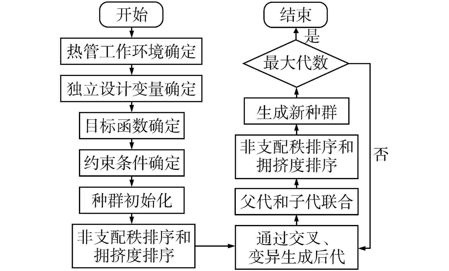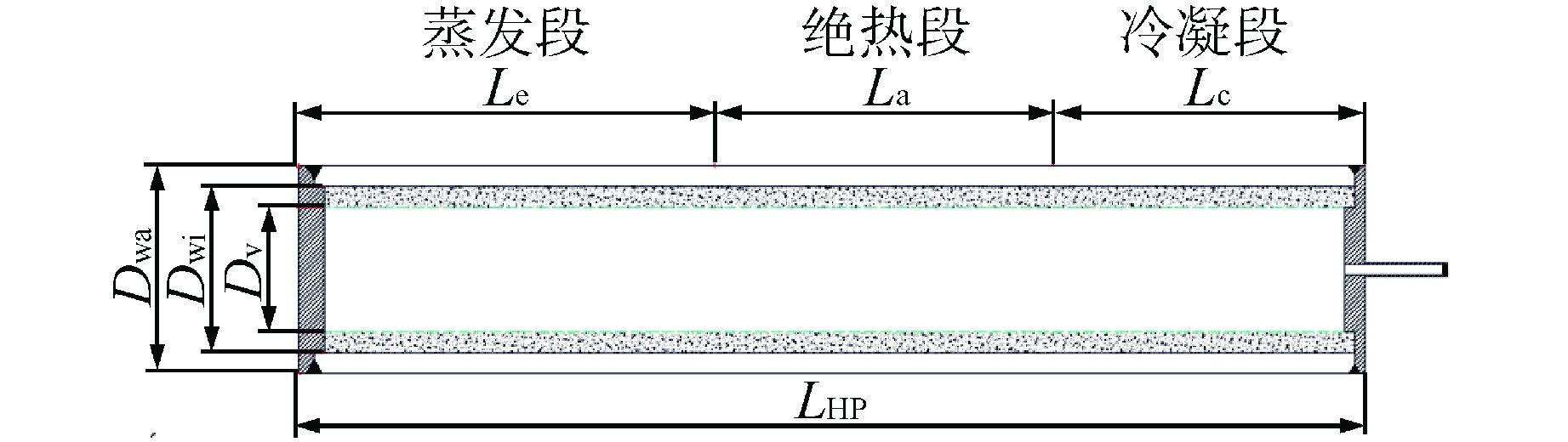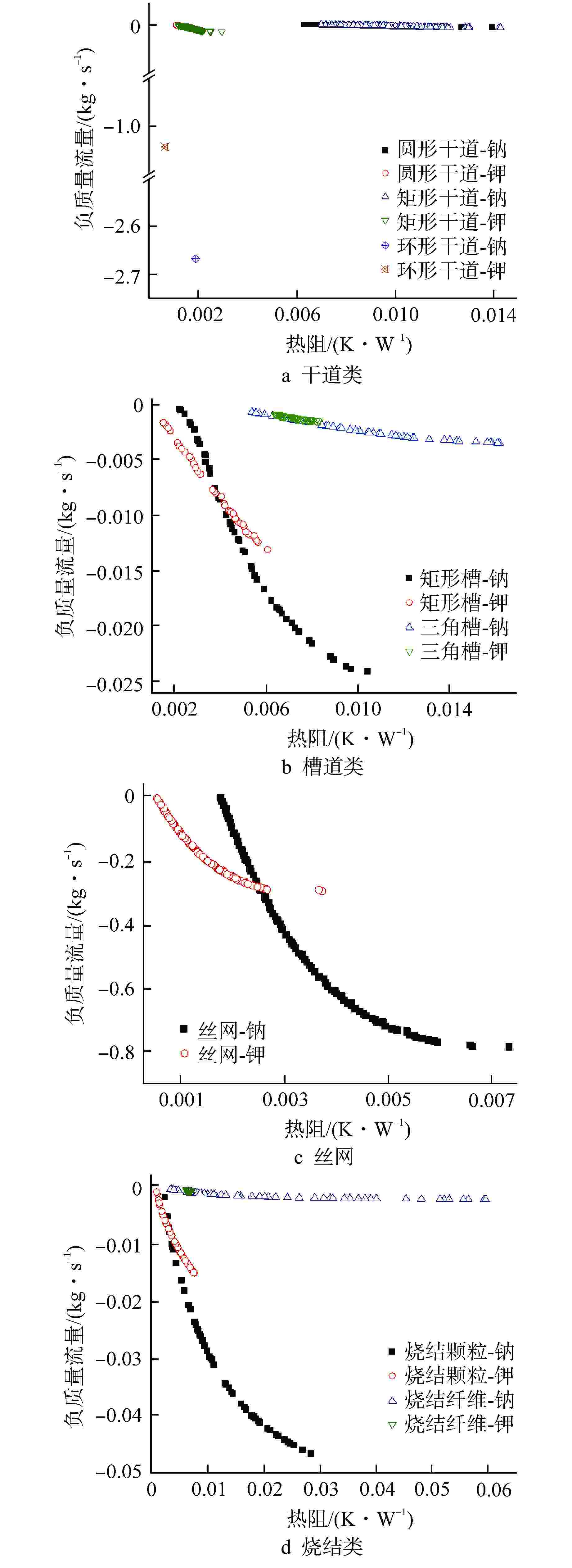 吸液芯结构 rcap Dh ε K 圆形干道 D/2 D 1 D2/32 矩形干道 $ \dfrac{{WDg}}{{W + Dg}} $ $\dfrac{{2WDg}}{{W + Dg}}$ 1 $\dfrac{ {D_{_{\text{h}} }^{^{\text{2} }} } }{ {2{F_{_{ {\text{RA} }} } } } }$ 环形干道 ro−ri 2(ro−ri) 1 $\dfrac{ {D_{_{\text{h} }}^{^{\text{2} }} } }{ {2{F_{_{ {\text{AA} }} } } } }$ 矩形槽 W $ \dfrac{{4WDg}}{{W + 2Dg}} $ $\dfrac{W}{ { {D_{_{ {\text{is} }} } } } }$ $\dfrac{ {\varepsilon D_{_{\text{h} }}^{^{\text{2} }} } }{ {2{F_{_{ {\text{RG} }} } } } }$ 三角槽 $\dfrac{W}{{\cos \psi }}$ $W\cos \psi $ $\dfrac{W}{ {2{D_{_{ {\text{is} }} } } } }$ $\dfrac{ {\varepsilon D_{_{\text{h} }}^{^{\text{2} }} } }{ {2{F_{_{ {\text{IG} } }} } } }$ 丝网 $\dfrac{{W + D}}{2}$ $\dfrac{\varepsilon }{{1 - \varepsilon }}D$ $1 - \dfrac{ {1.05{\text{π } }N_{_{\text{mesh} }} D} }{4}$ $\dfrac{ { {D^{^2}}{\varepsilon ^{^3}} } }{ {122{ {\left( {1 - \varepsilon } \right)}^{^2}} } }$ 烧结颗粒 $0.21{D_{_{\text{p} }} }$ $\dfrac{ {2\varepsilon } }{ {3\left( {1 - \varepsilon } \right)} }{D_{_{\text{p} }} }$ 0.27~0.66 $\dfrac{ {D_{\text{p} }^{^{\text{2}} }{\varepsilon ^{^3}} } }{ {150{ {\left( {1 - \varepsilon } \right)}^{^2}} } }$ 烧结纤维 $\dfrac{ { {D_{_{\text{f} }} } }}{ {2\left( {1 - \varepsilon } \right)} }$ $\dfrac{\varepsilon }{ {1 - \varepsilon } }{D_{_{\text{f} }} }$ 0.6~0.9 FSF Nmesh—丝网目数;FSF、FAA、 FRA、FIG、FRG关系式详见文献[16] 表 2 液态金属高温热管设计参数