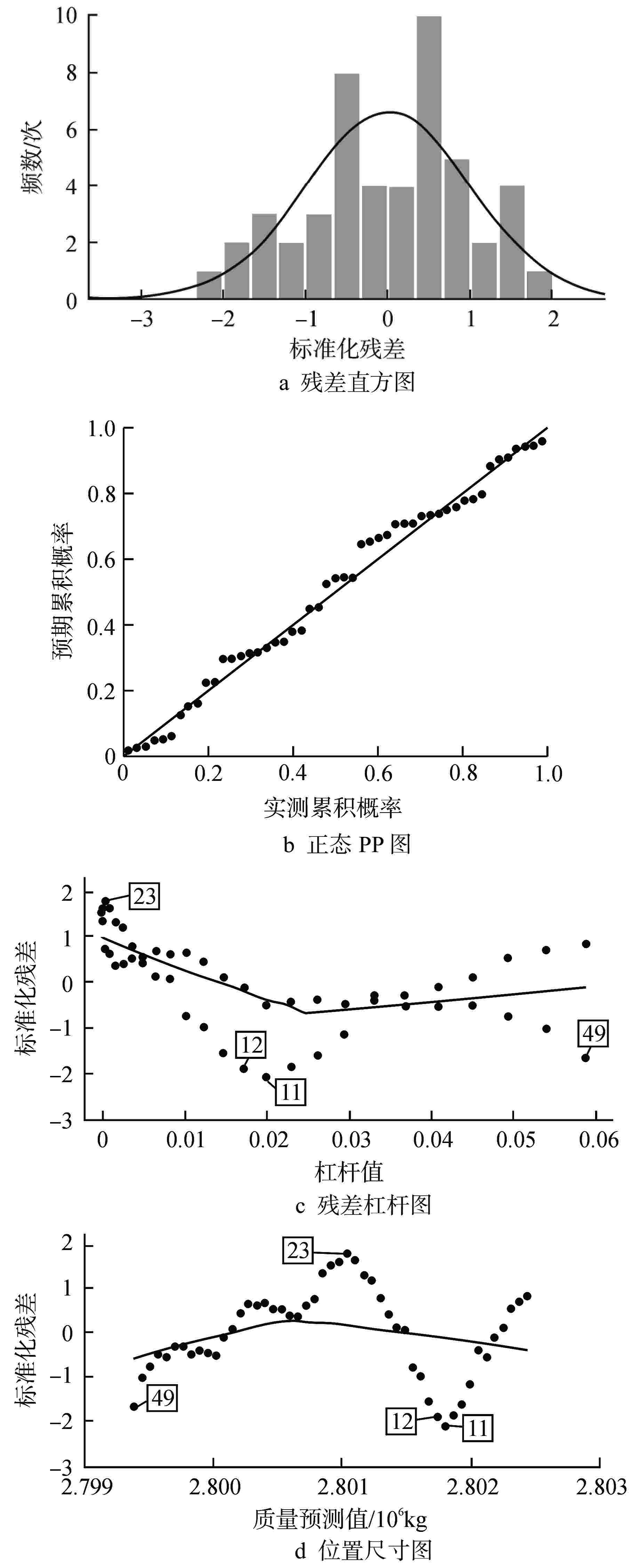 参数 去除极端样本点前 去除极端样本点后 A B 整体显著性 A B 整体显著性 估计值 −127.699267 2802441.675127 −128.820616 2802493.679714 标准差 9.091085 126.624164 8.354202 116.518745 t检验值 −14.046647 22131.965941 −15.419858 24051.869699 F检验统计量 197.308303 237.772031 P值 1.9304×10−18 1.3866×10−166 1.9304×10−18 3.9538×10−19 6.4991×10−155 3.9538×10−19 R2 0.807620 0.846851 调整R2 0.803527 0.843289 自由度 48 44 表 2 残差加权后的结果