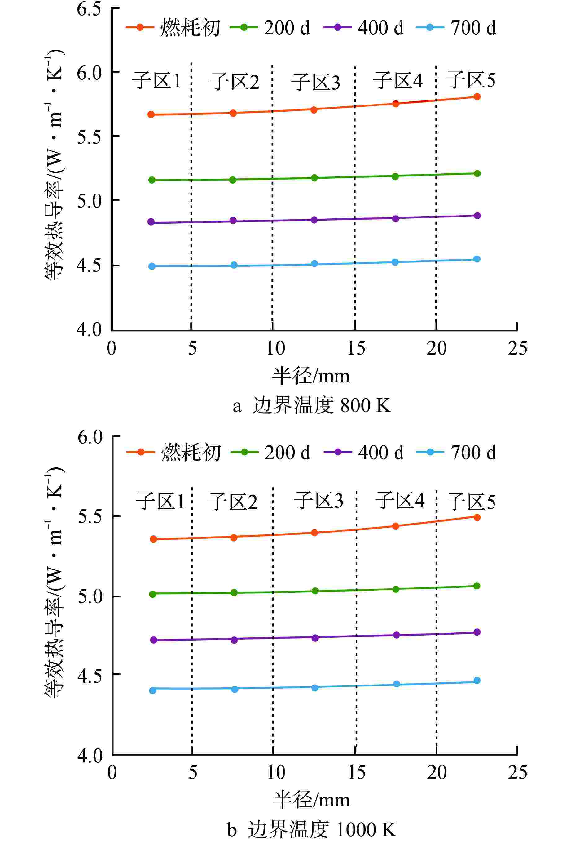 摘要: 由于三层各向同性(TRISO)颗粒弥散型燃料元件结构复杂且其材料性能随着辐照水平不断变化,不同燃耗下燃料元件的等效热导率不易确定。本研究基于COMSOL软件完成了TRISO颗粒性能分析程序开发,并与BISON程序预测值进行了对比分析。随后,基于COMSOL软件与MATLAB联合仿真建立了球形燃料元件等效热导率的计算方法,实现了球形燃料元件和TRISO颗粒模型间的在线耦合计算。在此基础上,获得了不同边界温度、燃耗条件下燃料元件径向等效热导率分布及温度场分布。计算结果表明,快中子注量达到3×1025 m–2时,TRISO等效导热率下降约20%,燃料等效热导率下降约15 W/(m·K)。为了验证本研究方法的有效性,用微分-有效介质理论模型(D-EMT)计算燃料的等效导热率,得到的球形燃料中心温度预测值相比本研究方法的预测值低约25 K。本文研究方法更能真实反映球形燃料元件在反应堆内的温度场变化。Abstract: Due to the complex structure of TRI-Structural Isotropic (TRISO) dispersion fuel elements and its material properties that change under irradiation, it is difficult to determine the equivalent thermal conductivity (ETC) of fuel element under different burnup. In this study, the TRISO particle performance analysis program is developed based on COMSOL software, and compared with the predicted value of BISON program. Then, based on the joint simulation of COMSOL and MATLAB, the calculation method of equivalent thermal conductivity of spherical fuel element is established, and the online coupling calculation between spherical fuel element and TRISO particle model is realized. On this basis, the radial equivalent thermal conductivity distribution and temperature field distribution of fuel element under different boundary temperature and burnup conditions are obtained. The calculation results show that when the fast neutron flux reaches 3×1025 m–2, the equivalent thermal conductivity of TRISO decreases by about 20%, and the equivalent thermal conductivity of fuel decreases by about 15 W/(m·K). In order to demonstrate the effectiveness of this method, the equivalent thermal conductivity of fuel is calculated by differential-effective medium theory model (D-EMT). The predicted value of spherical fuel center temperature is about 25 K lower than that of this method. The research method in this paper can more truly reflect the temperature field change of spherical fuel element in the reactor.