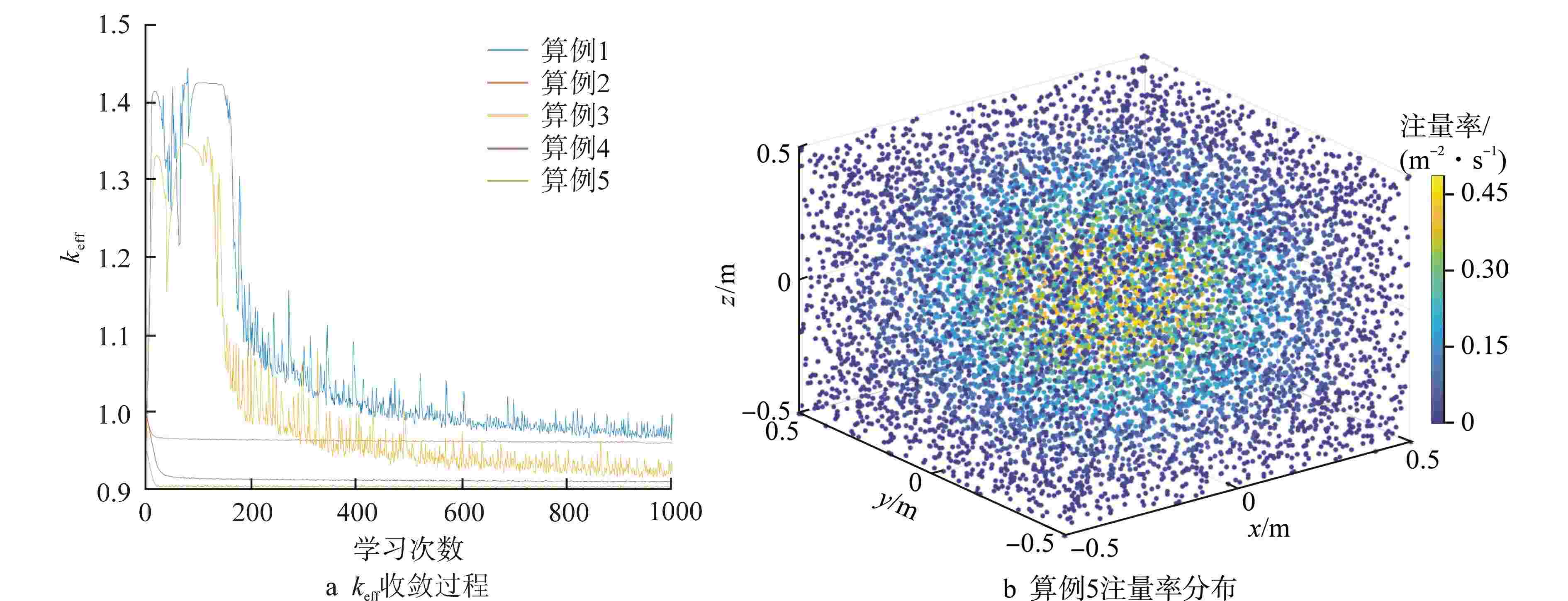 算例 k∞ keff_r Pb Pt keff_s keff_rel DLoss σMSE σSEi,max 1 1.425 0.95 50 50 0.9777 0.0292 0.0179 1.0054×10−4 4.4461×10−4 2 1.425 0.95 30 30 0.9856 0.0375 0.0229 2.1839×10−4 9.7300×10−4 3 1.425 0.95 10 10 0.9852 0.0371 0.0110 3.1139×10−4 0.00142 4 1.425 0.95 50 10 0.9596 0.0101 0.0035 1.7543×10−5 5.2826×10−5 5 1.425 0.95 10 50 0.9886 0.0406 0.0108 4.4073×10−4 0.0018 6 1.425 0.95 10~50* 10~50* 0.9499 −1.0526×10−4 1.2418×10−4 2.3044×10−8 1.0789×10−7 7 1.575 1.05 50 50 1.0983 0.0460 0.0439 2.3015×10−4 0.0011 8 1.575 1.05 30 30 1.0546 0.0044 9.5737×10−4 3.6342×10−6 1.5015×10−5 9 1.575 1.05 10 10 1.0522 0.0021 1.7608×10−4 1.266×10−6 5.2569×10−6 10 1.575 1.05 50 10 1.0674 0.0166 0.0075 3.3881×10−5 1.4986×10−4 11 1.575 1.05 10 50 1.0538 0.0036 2.7161×10−4 3.9332×10−6 1.5473×10−5 12 1.575 1.05 10~50* 10~50* 1.0501 9.5238×10−5 1.7485×10−4 1.3314×10−8 5.7686×10−8 *—权重随机;keff_r —keff理论值;keff_s— keff实际求解值;keff_rel —keff相对偏差,keff_rel =(keff_s−keff_r)/keff_r;σMSE—中子注量率平均方差,即机器学习方法求出的各空间离散点注量率数值解与解析解的方差平均值;σSEi,max—中子注量率最大方差,即空间离散点中注量率数值解与解析解方差的最大值 表 2 两维圆柱几何单群单材料扩散问题计算结果