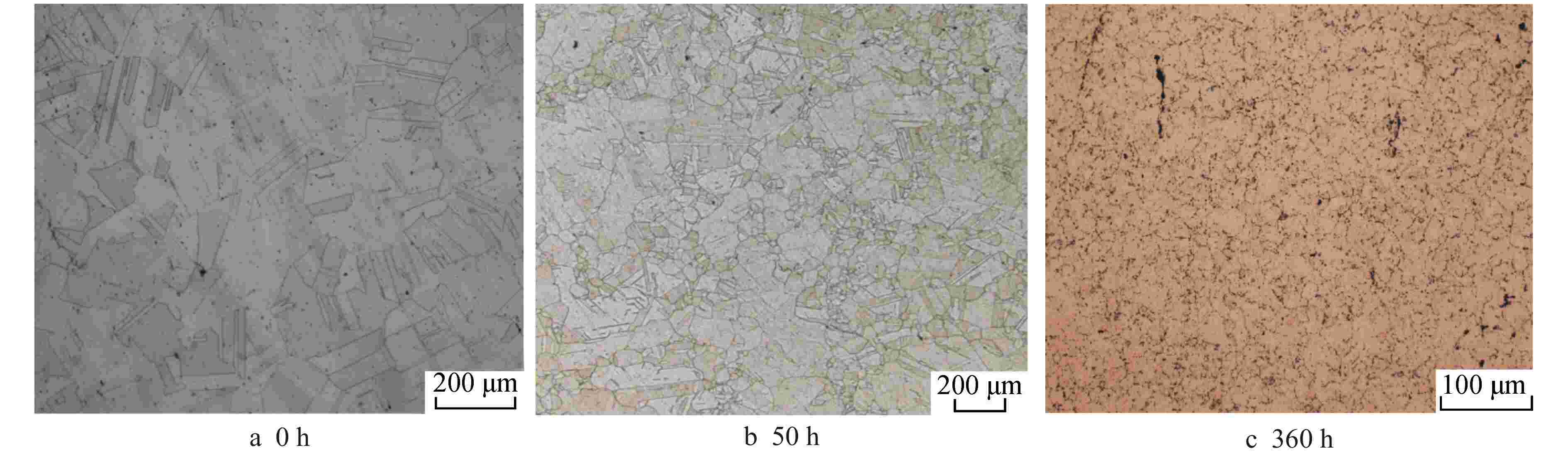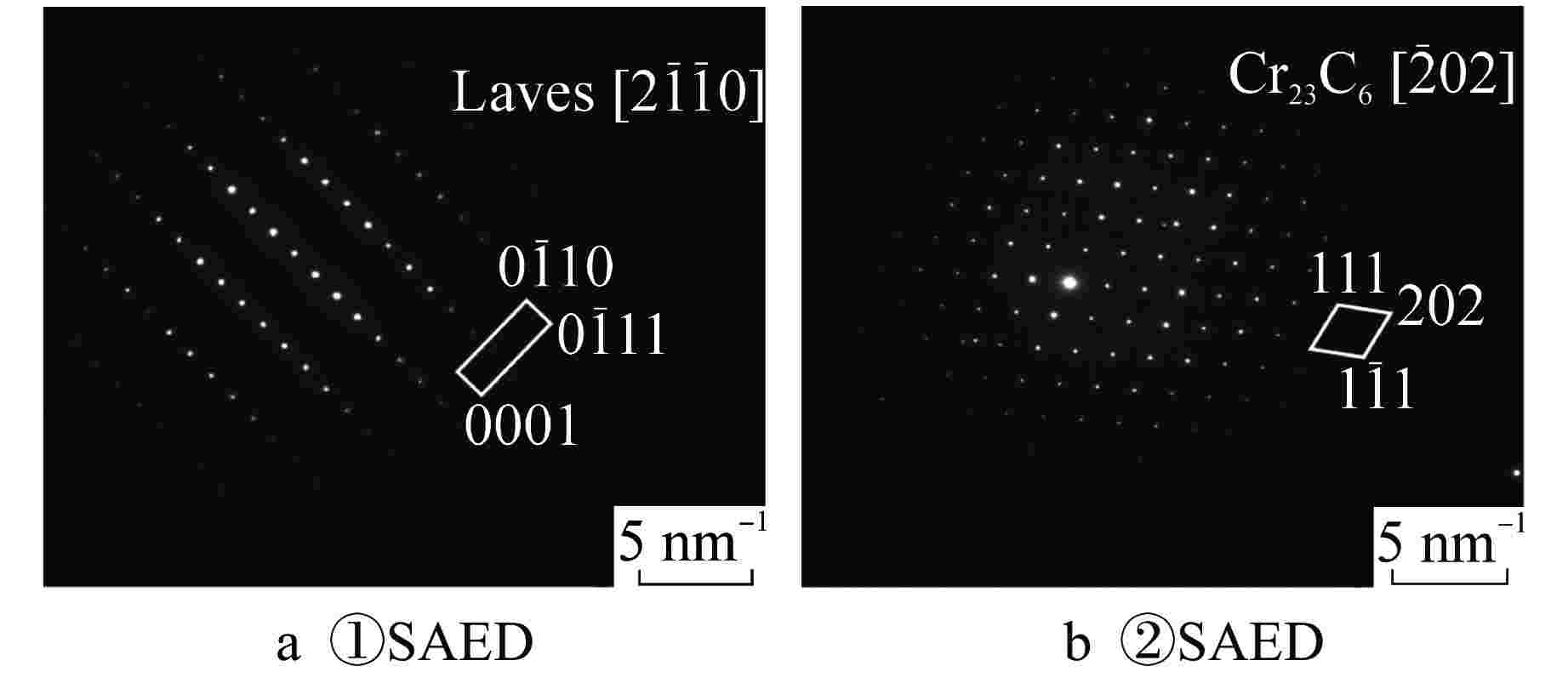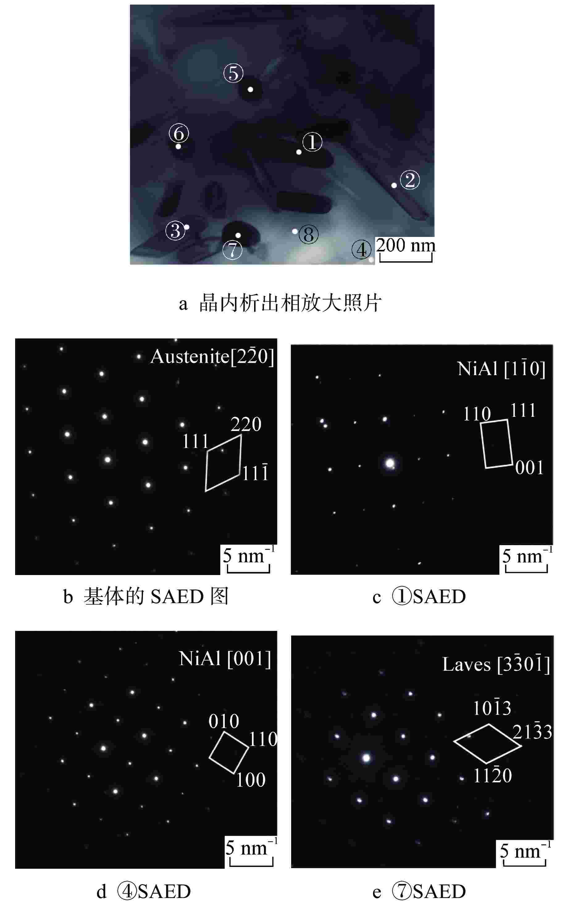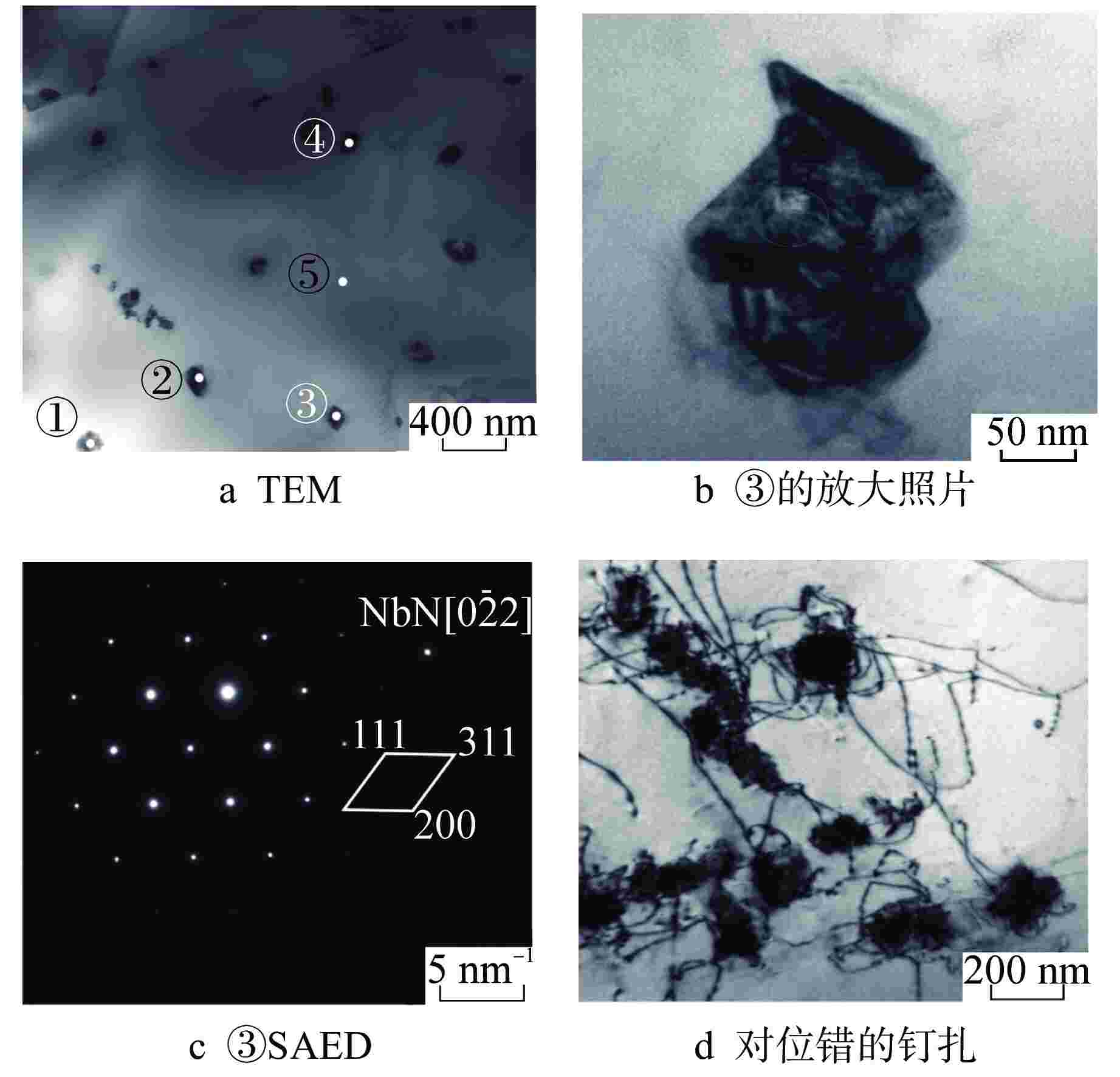 标记 元素原子百分比/% C N Cr Fe Ni Nb Mo ① 0 6.28 7.28 5.25 1.50 79.69 0 ② 0 2.43 18.43 5.01 1.64 66.81 5.69 ③ 0.15 3.30 17.64 26.00 12.24 39.36 1.32 ④ 0.83 2.74 10.08 9.71 3.26 72.57 0.81 ⑤ 0 2.60 20.09 50.22 24.59 0.10 2.39 表 3 时效360 h后3Al钢晶内析出相的EDS结果
