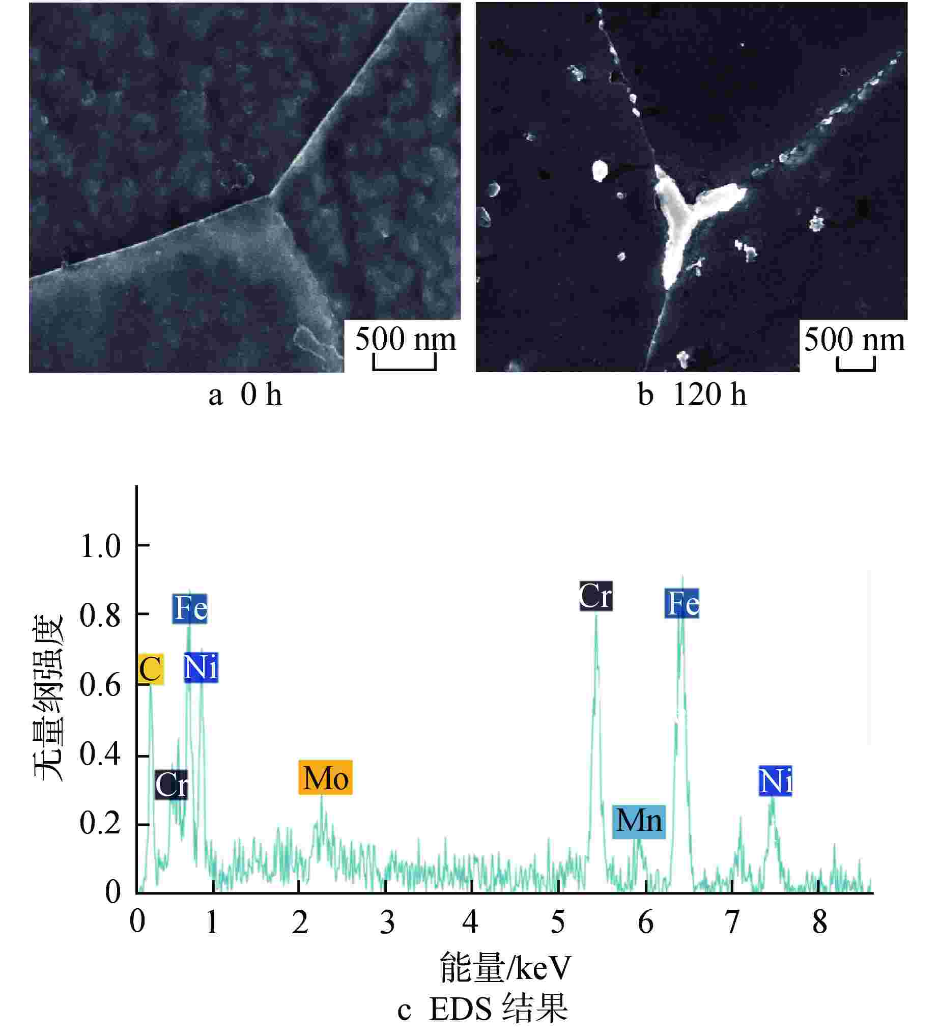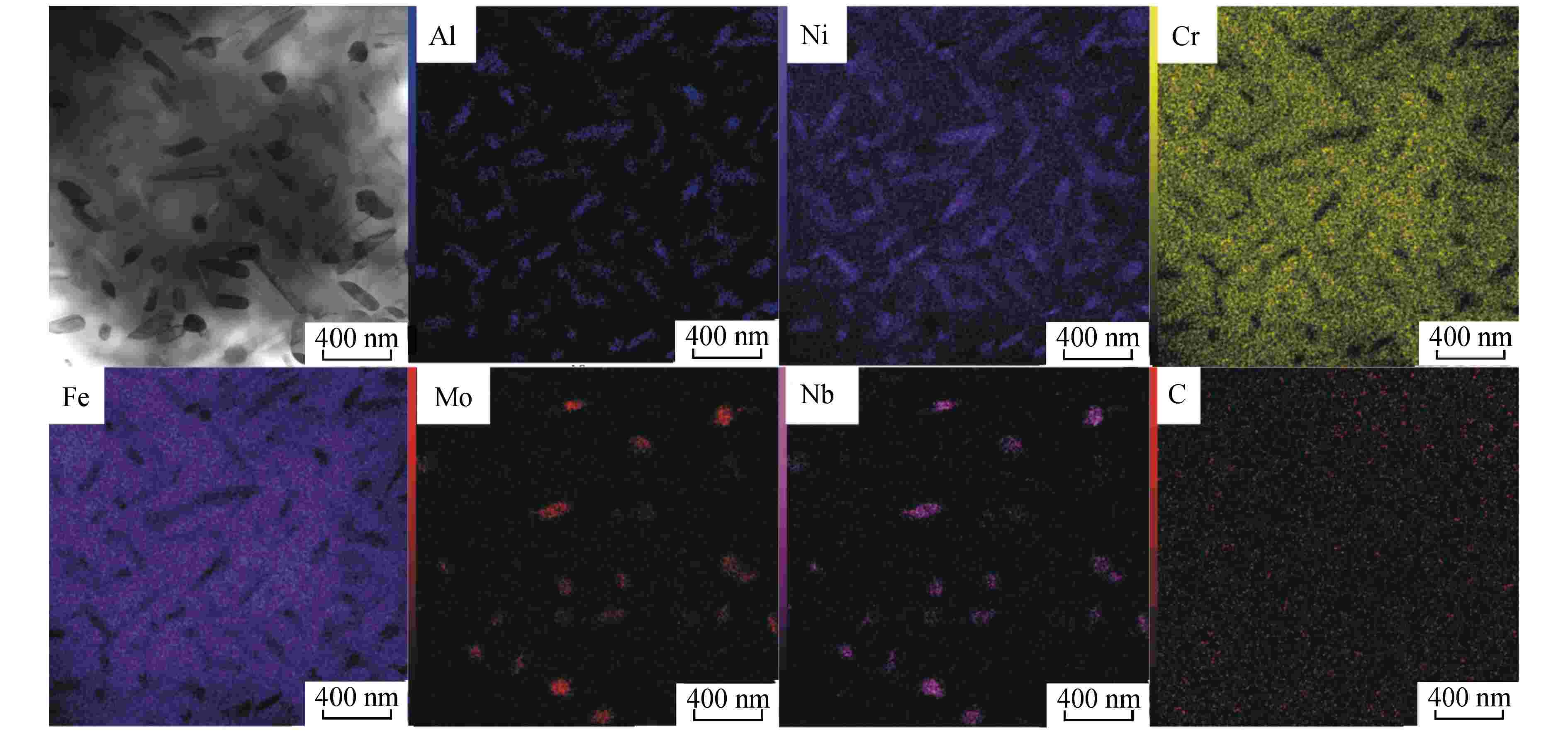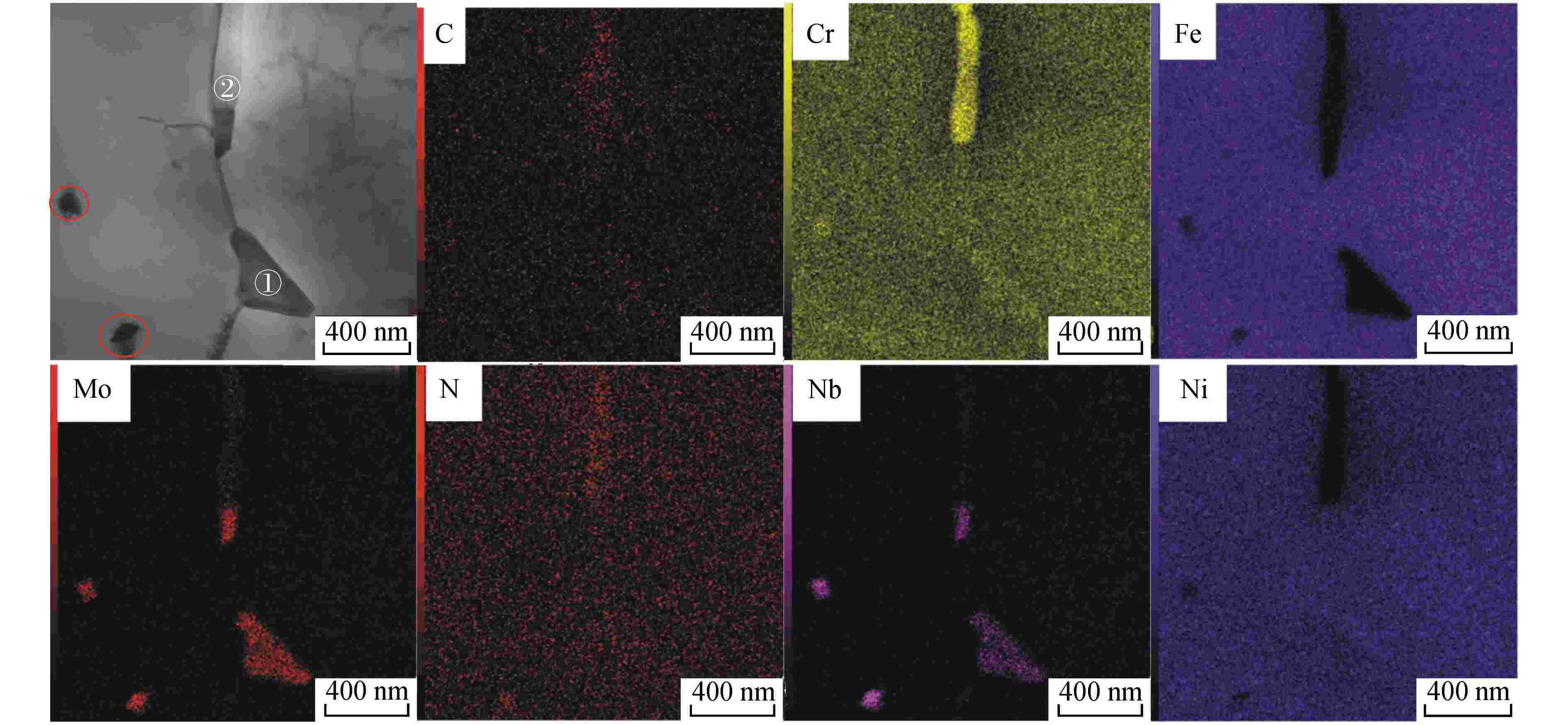 实验钢 元素质量分数/% Cr Ni Nb Al Si C Mo N Ti Fe N钢 19.59 24.20 0.77 0.02 0.4 0.03 1.69 0.1 0.04 Bal. 3Al钢 17.31 28.51 0.58 3.11 0.1 0.04 2.28 0 0.02 Bal. Bal.—Fe元素占比余量 表 2 时效360 h后N钢晶内析出相的EDS结果