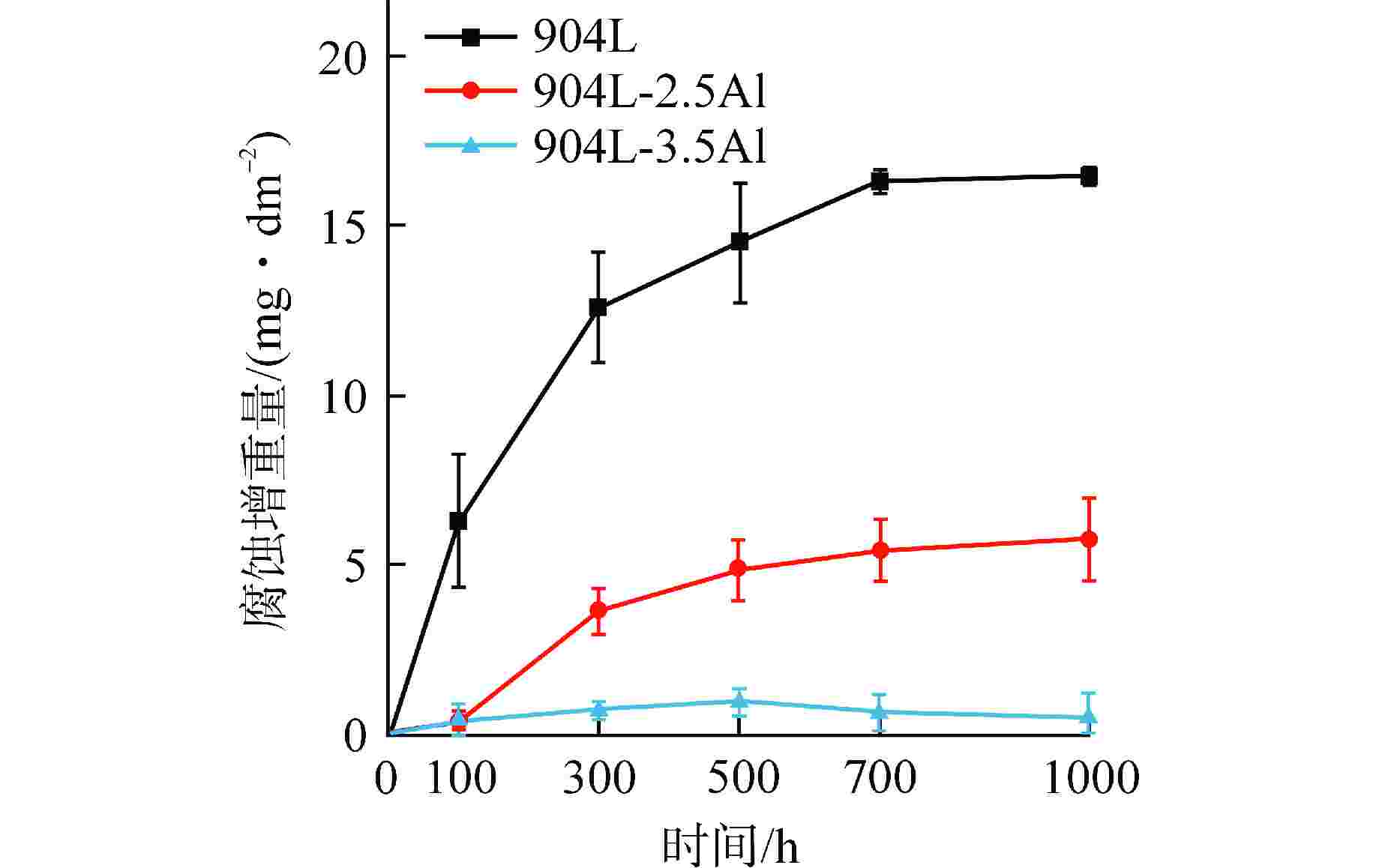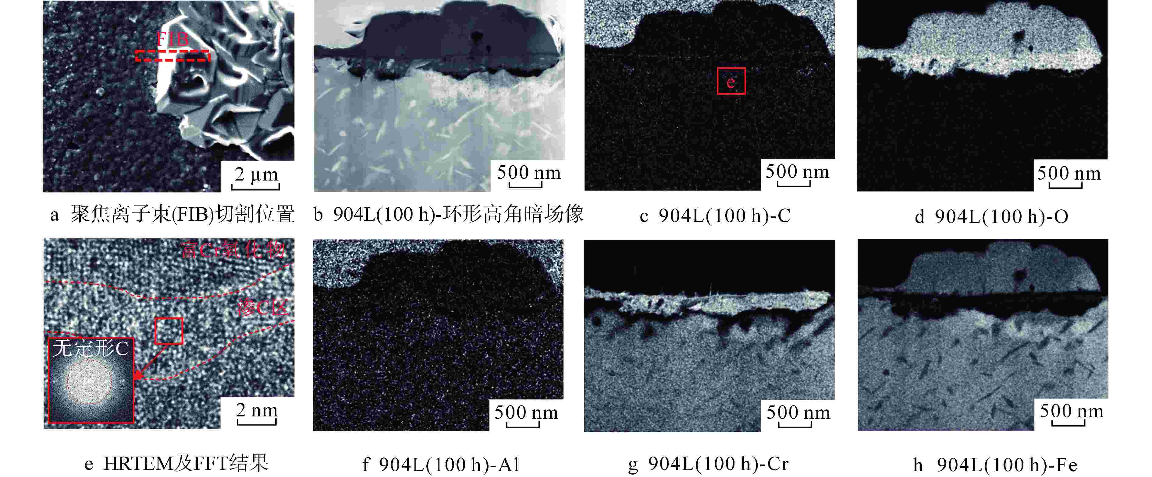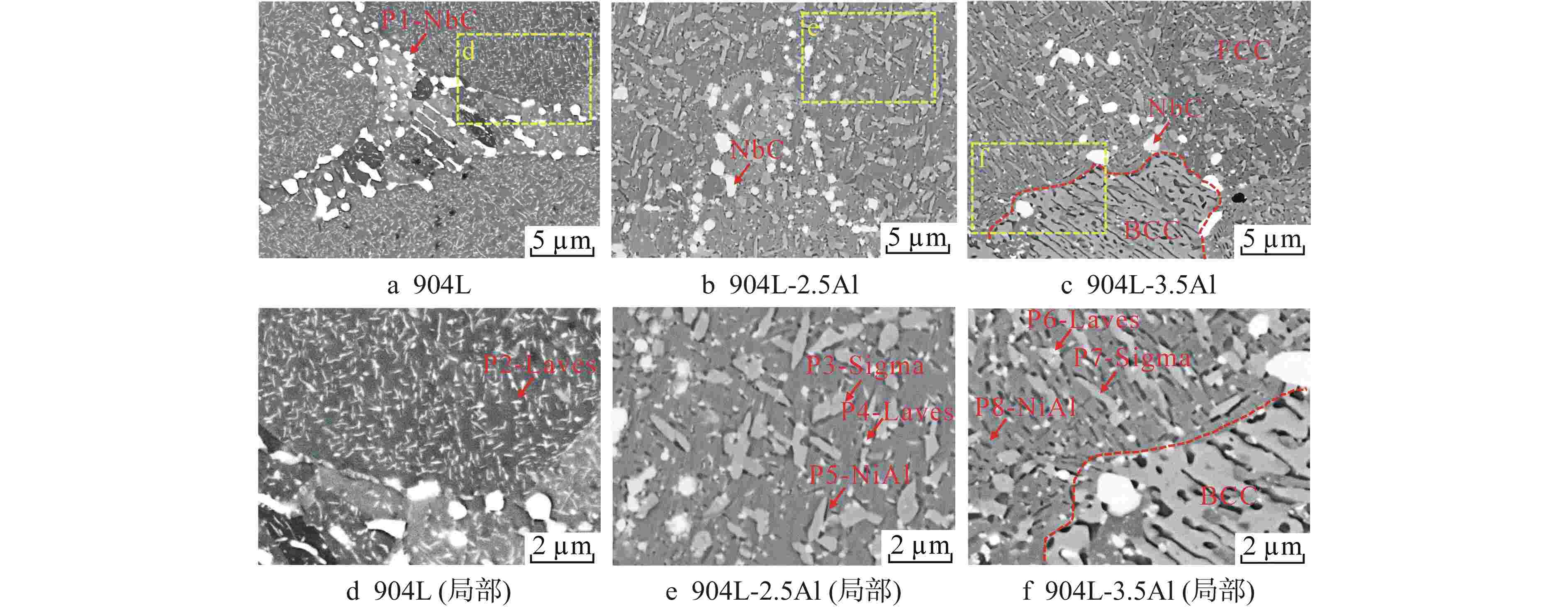 材料 wC wAl wSi wS wCr wMn wFe wNi wCu wNb wMo 904L 0.076 0.036 1.373 0.001 19.082 1.874 余量 25.376 1.481 0.870 3.691 904L-2.5Al 0.079 2.212 1.263 — 19.509 2.006 余量 25.634 1.591 0.821 3.406 904L-3.5Al 0.079 3.236 1.181 0.001 19.705 1.872 余量 25.090 1.602 0.900 3.891 w—质量分数 表 2 图1中析出相化学成分 %