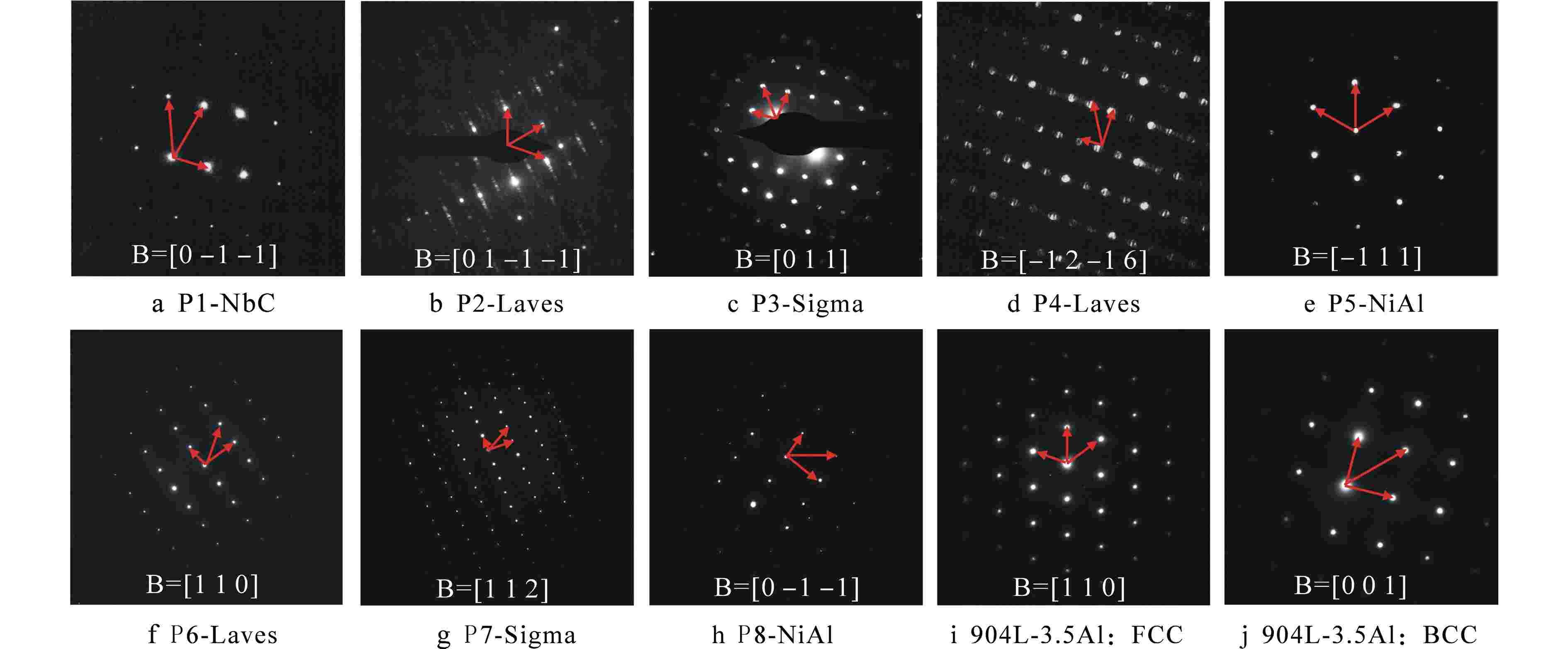 析出相 wC wAl wSi wCr wFe wNi wNb wMo P1-NbC 19.9 — — — 0.1 — 77.3 2.7 P2-Laves — — 3.8 16.6 34.9 18.2 4.0 22.5 P3-Sigma — — 2.8 39.2 39.9 6.8 — 11.9 P4-Laves — — 6.9 11.1 30.0 11.8 6.3 33.9 P5-NiAl — 23.0 — — 9.5 67.5 — — P6-Laves — — 5.5 17.2 31.1 15.2 — 30.9 P7-Sigma — — 1.7 44.0 39.6 8.4 — 6.3 P8-NiAl — 15.0 — — 14.5 70.6 — — -