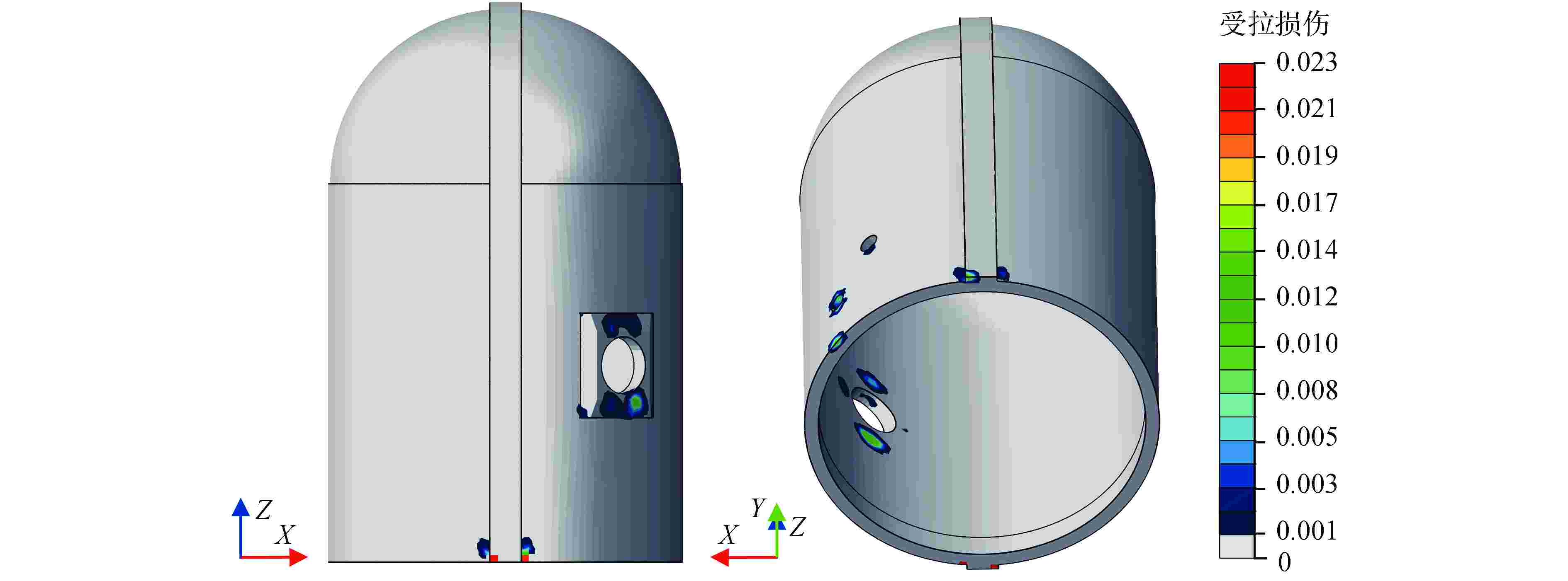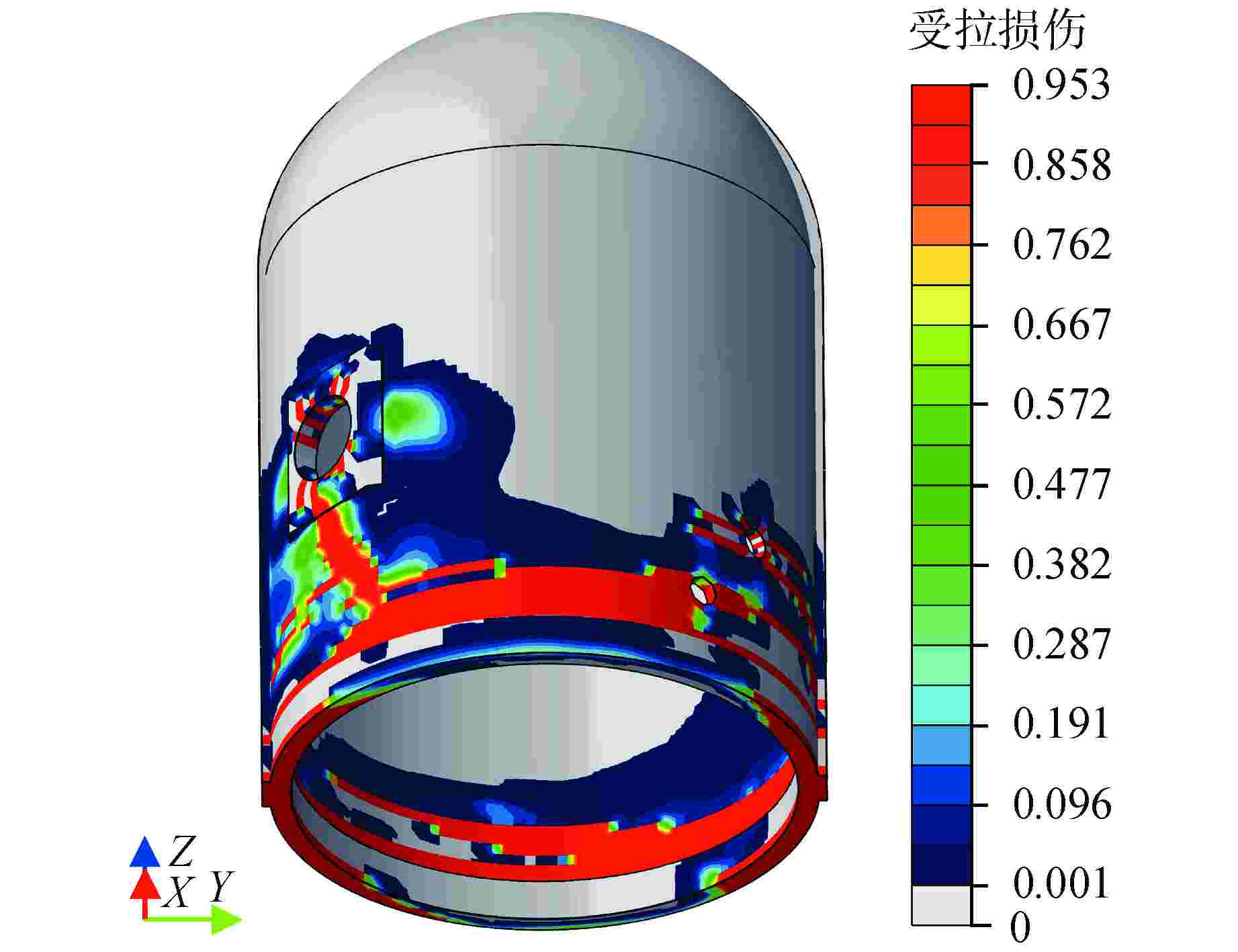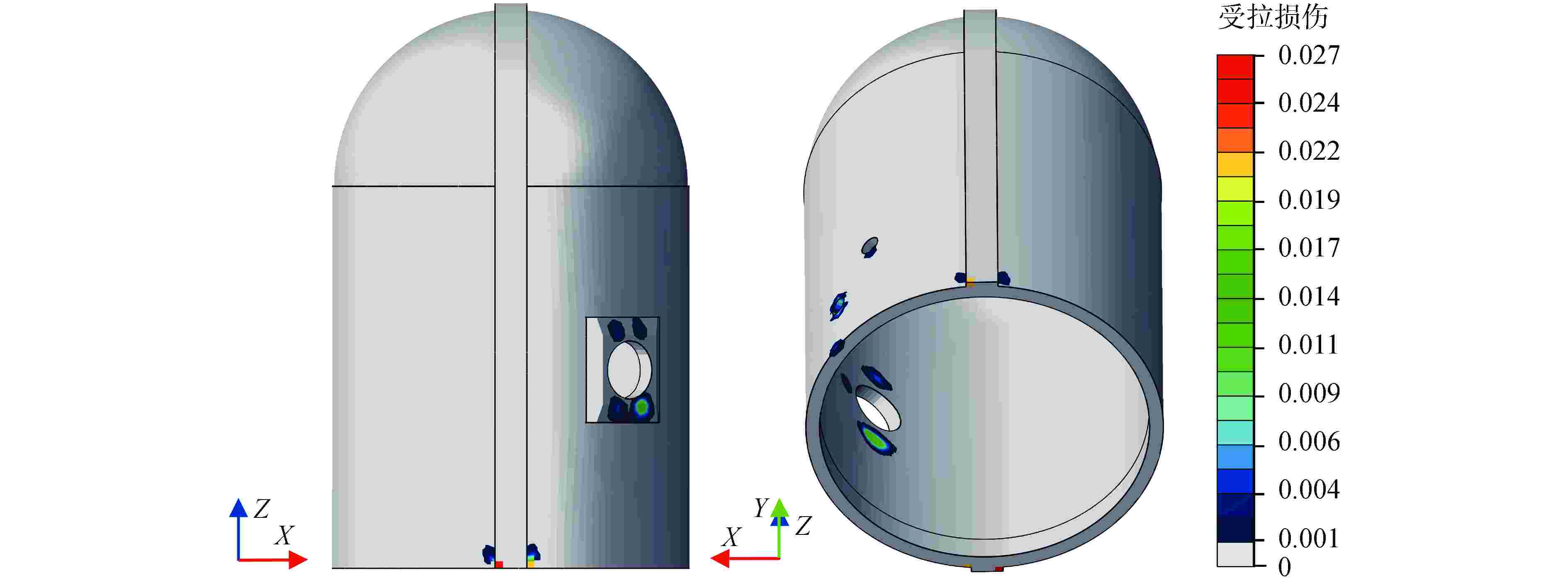 膨胀角 偏心率 fb0/fc0 k 粘性系数 30° 0.1 1.16 0.667 0.001 fb0—混凝土双轴极限抗压强度;fc0—混凝土单轴极限抗压强度;k—拉伸子午面上与压缩子午面上的第二应力不变量之比[6] 表 2 安全壳混凝土损伤参数取值