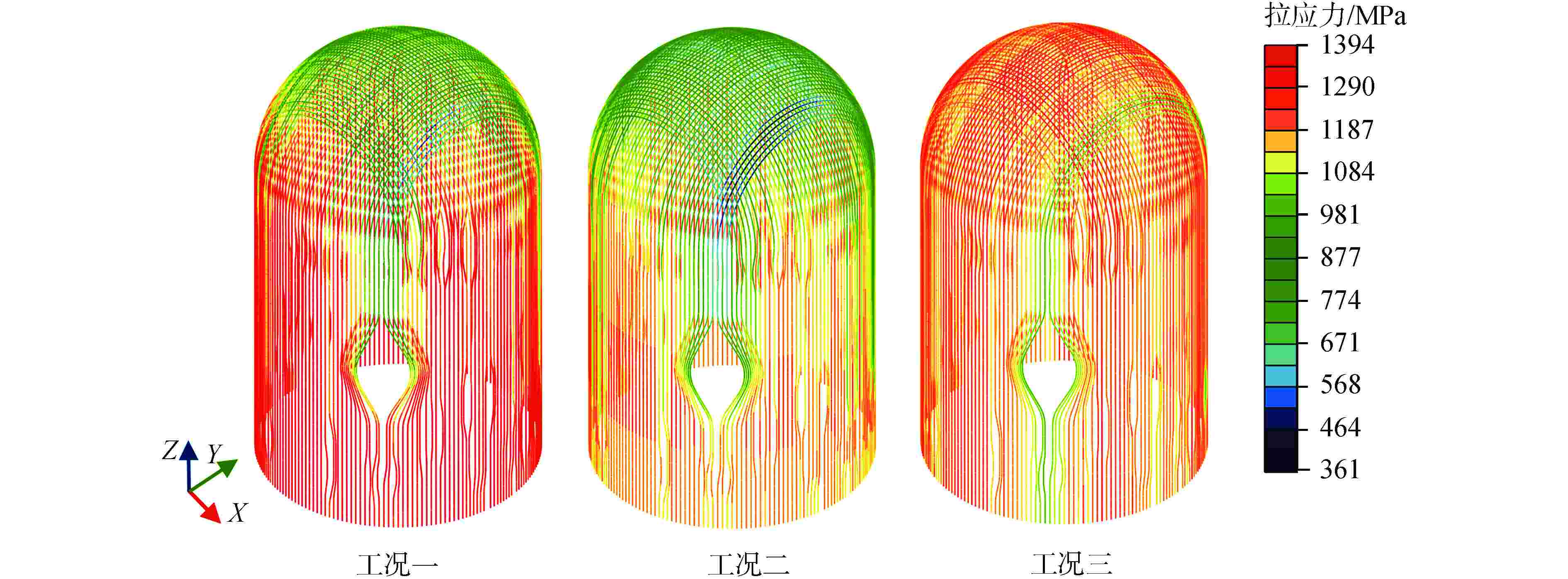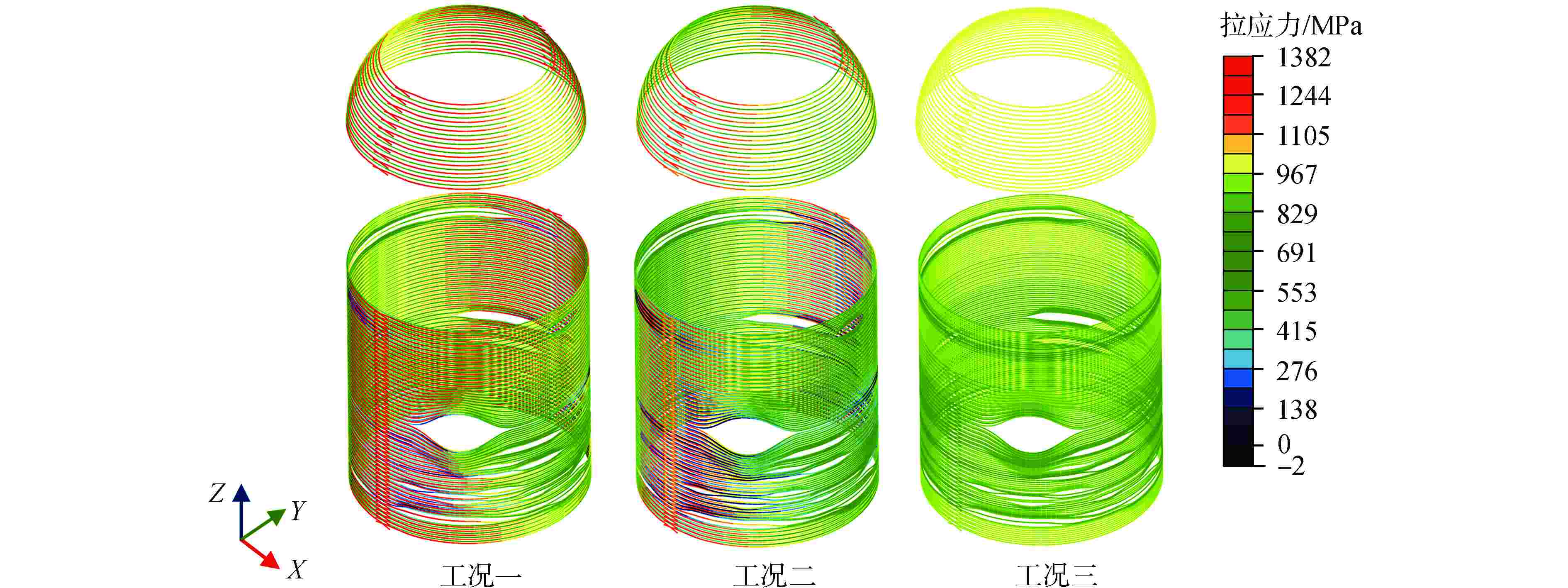 预应力工况 主拉应变峰值/10−4 A1 A2 A3 A4 A5 B1 B2 B3 B4 B5 C1 C2 C3 C4 D1 D2 D3 D4 工况一 1.00 0.51 0.29 0.34 0.54 0.90 0.41 0.23 0.35 0.56 0.82 0.42 0.35 0.54 1.12 1.46 2.27 1.86 工况二 1.01 0.49 0.29 0.32 0.49 0.94 0.39 0.23 0.34 0.49 0.79 0.42 0.33 0.48 0.84 1.10 1.65 1.40 工况三 1.43 0.44 0.29 0.36 0.52 1.16 0.38 0.24 0.35 0.53 1.57 0.68 0.43 0.55 1.27 1.57 2.39 1.97 位置编号中数字表示在径向上由外至内的单元次序,例如:A1表示位置A最外层单元 -