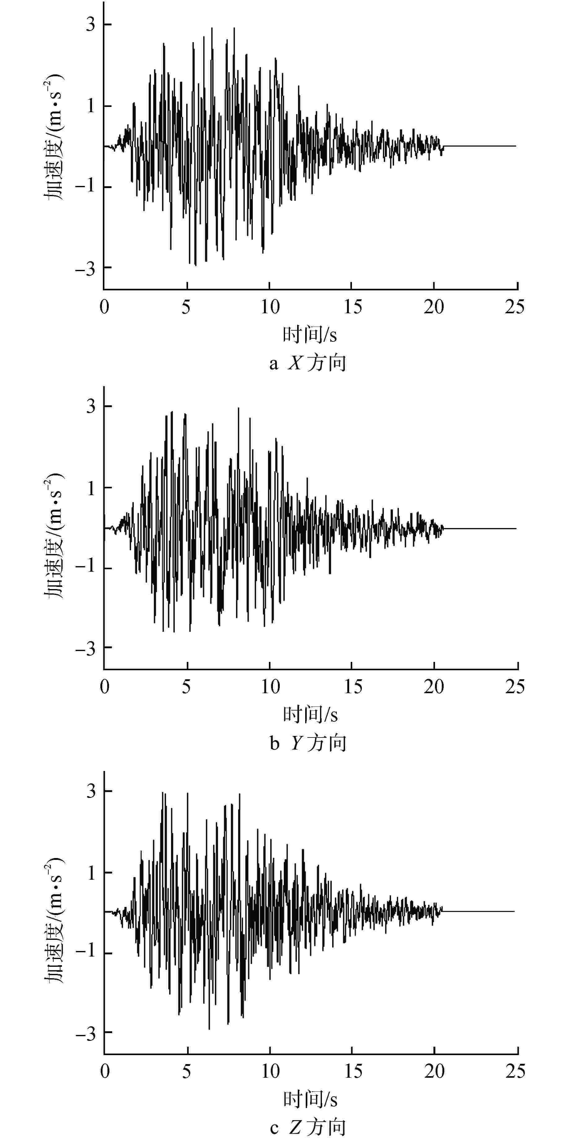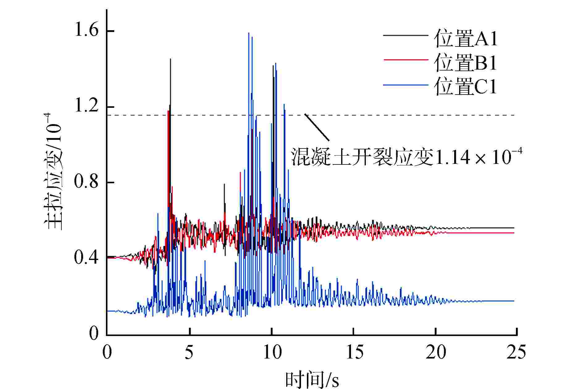 率//Hz振型特征 1 4.086 梁式一阶振型 11 10.593 局部振动 2 4.117 梁式一阶振型 12 11.404 局部振动 3 5.694 局部振动 13 11.679 局部振动 4 5.733 局部振动 14 11.693 局部振动 5 6.541 局部振动 15 11.772 局部振动 6 6.582 局部振动 16 11.966 梁式二阶振型 7 7.216 局部振动 17 12.094 梁式二阶振型 8 7.331 局部振动 18 12.215 Z向一阶振型 9 8.661 绕Z轴扭转 19 13.553 局部振动 10 10.436 局部振动 20 13.680 局部振动 表 5 代表性位置主拉应变峰值