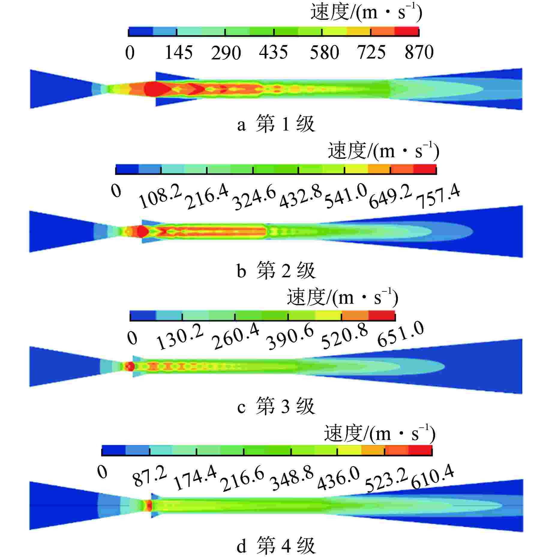 项目设置 选项及取值 气体模型 real-gas-soave-redlich-kwong 对称模式 轴对称 入口边界 压力入口 出口边界 压力出口 求解器 SIMPLE算法 对流项 二阶迎风 扩散项 二阶中心差分 收敛精度 1×10−5 表 4 多级喷射器尺寸参数 mm