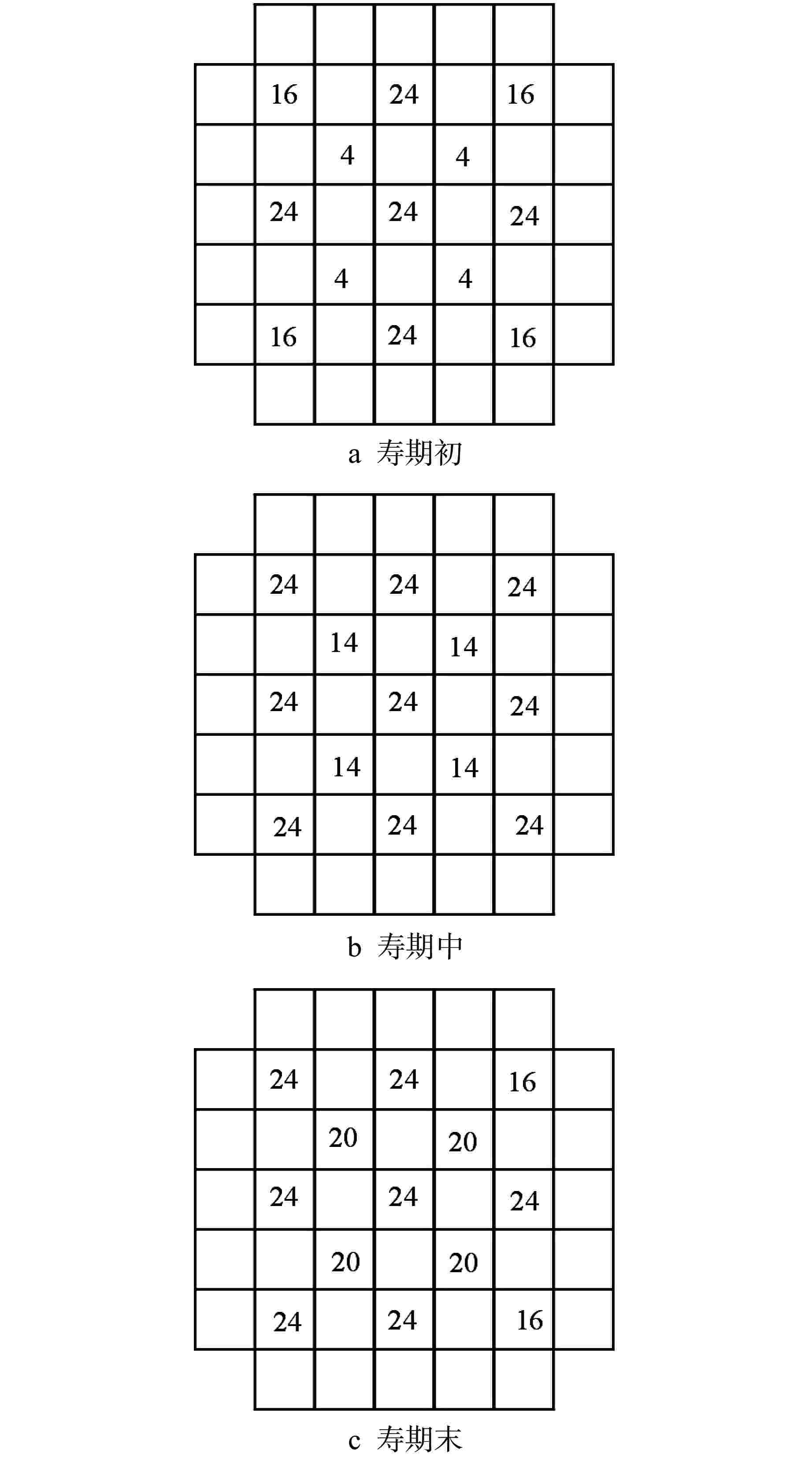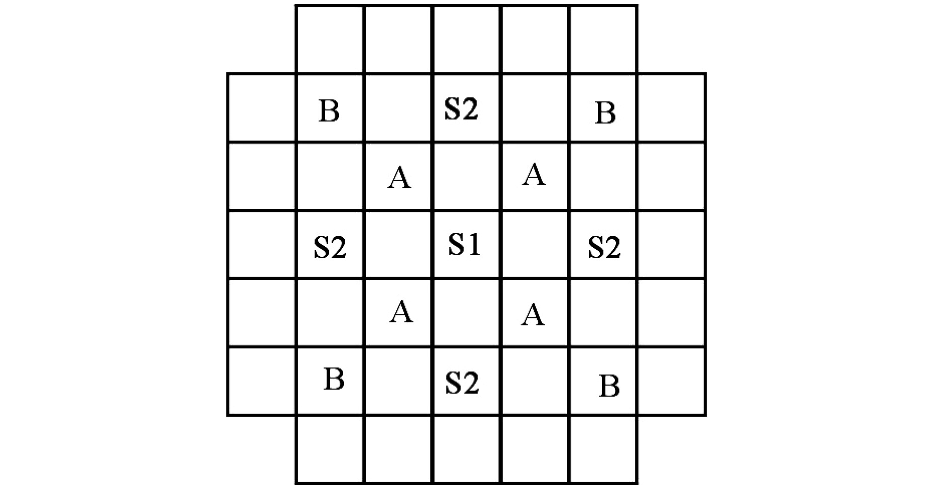表 1 控制棒价值计算结果 Table 1. Control Rod Value Calculation Results 状态 控制棒价值/pcm 全棒提 8888 S1插入 843 S2插入 2143 B插入 1882 A插入 2242 表 2 “卡棒”计算结果 Table 2. "Control Rod Stuck" Calculation Results 发生“卡棒”的棒组 堆芯Keff S1 0.9816 S2 0.9754 B 0.9742 A 0.9789