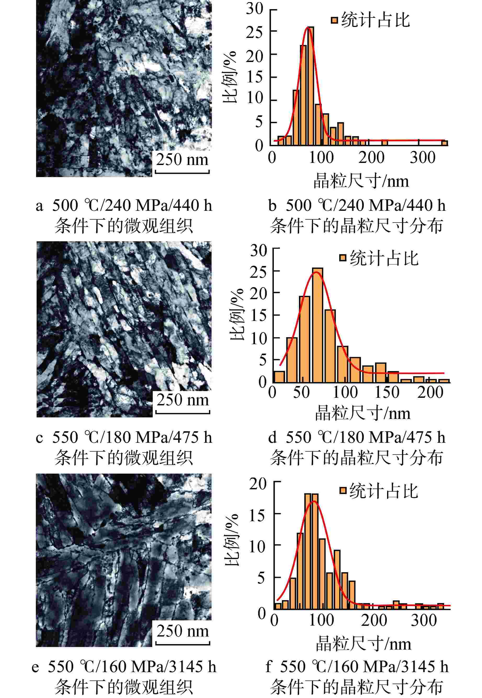 密度/m−3原始态 54.3±2.9 18.3±0.7 6.82×1019 500℃/240 MPa/440 h 57.2±1.5 22.6±1.4 6.16×1019 550℃/180 MPa/475 h 65.8±1.3 25.7±2.0 5.67×1019 550℃/160 MPa/3145 h 78.9±2.4 38.9±0.6 4.73×1019 -