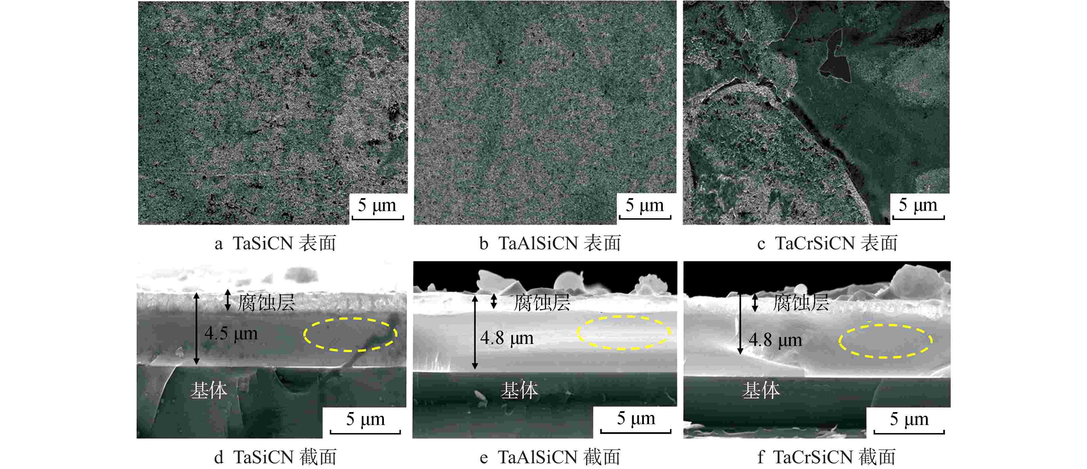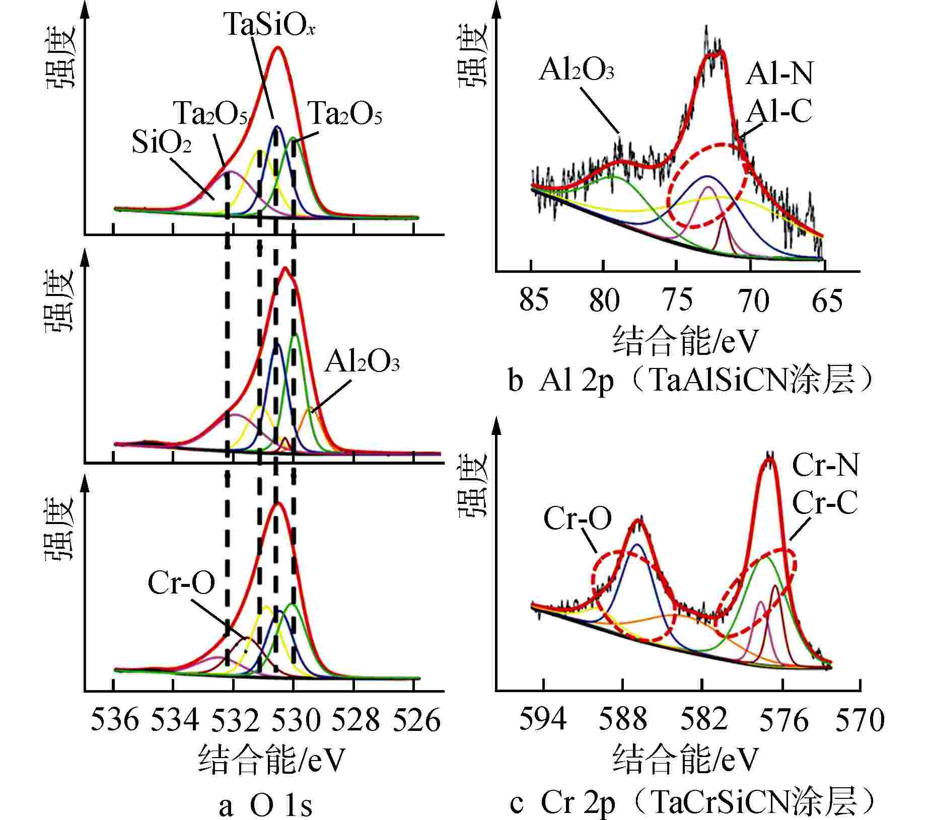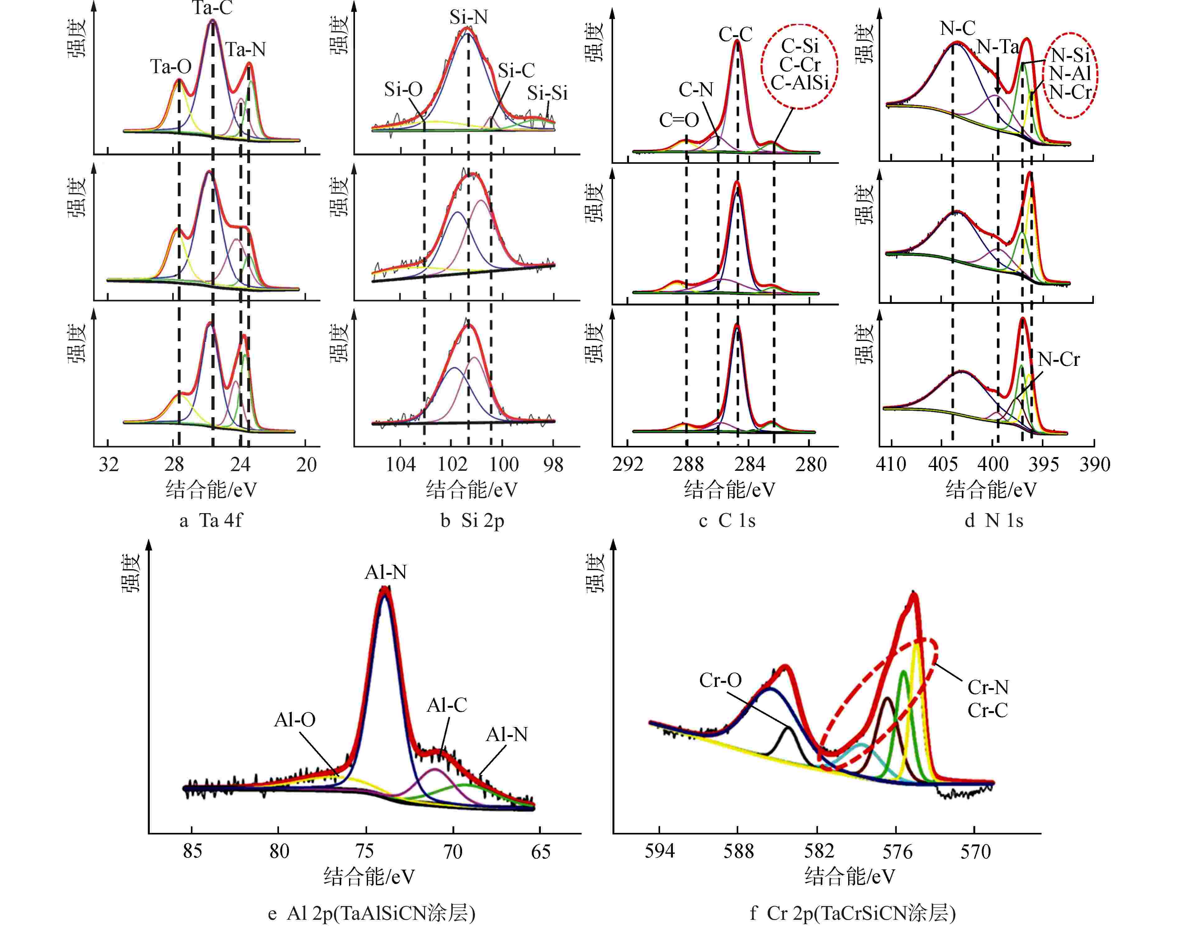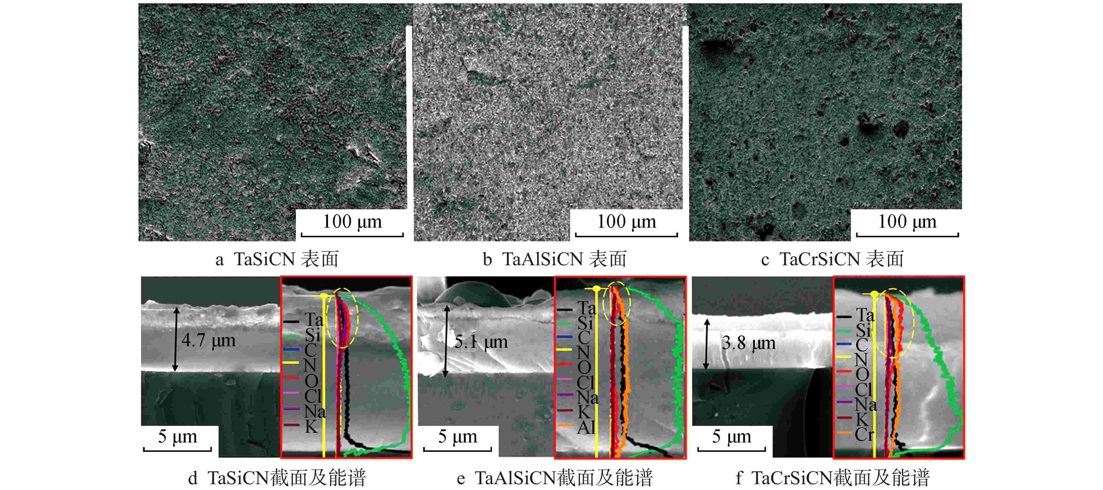 图 6 腐蚀4 h后涂层的XPS图谱 图6a能级谱图中从上到下依次为TaSiCN、TaAlSiCN、TaCrSiCN涂层 Figure 6. XPS Core Level Spectra of Coatings after 4 h Corrosion 表 1 TaSiCN、TaAlSiCN和TaCrSiCN涂层的EDS元素分析 Table 1. EDS Elemental Composition of TaSiCN, TaAlSiCN and TaCrSiCN Coatings 试样 气体流量/(mL·min−1) 元素原子百分比/% Ar N2 Ta Si C N Al Cr TaSiCN 48 6 26 6 40 29 0 0 TaAlSiCN 48 6 22 8 34 26 10 0 TaCrSiCN 48 6 21 9 33 24 0 13 表 2 TaSiCN、TaAlSiCN和TaCrSiCN涂层表面和截面内部的EDS元素分析 Table 2. EDS Element Analysis of Surface and Cross Section of TaSiCN, TaAlSiCN and TaCrSiCN Coatings 分析区域 元素原子百分比/% Ta Si C N O Al Cr Cl Na K 涂层表面 TaSiCN 18.1 4.4 20.7 4.3 44.2 0.6 6.8 0.9 TaAlSiCN 12.8 4.8 28.2 6.6 40.5 3.2 0.5 6.8 1.4 TaCrSiCN 17.9 4.9 25.5 13.3 24.7 9.6 0.1 3.8 0.2 涂层截面内部 TaSiCN 19.9 8.5 25.8 38.4 5.6 0 1.8 0 TaAlSiCN 21.6 6.3 26.1 32.2 3.8 9.8 0 0.2 0 TaCrSiCN 17.9 7.9 23.1 31.2 7.2 10.3 0 2.4 0