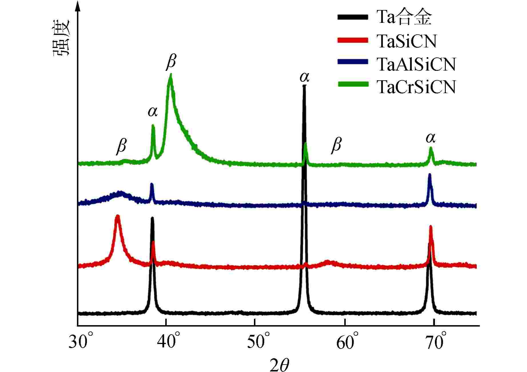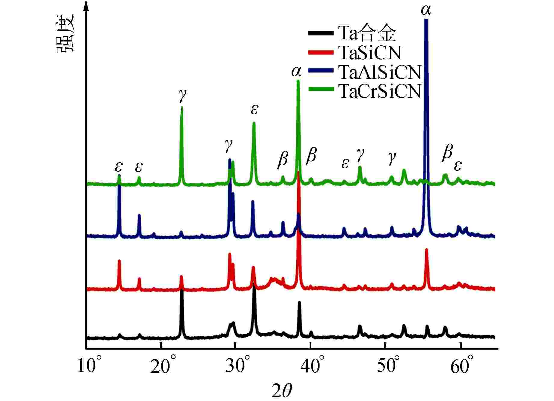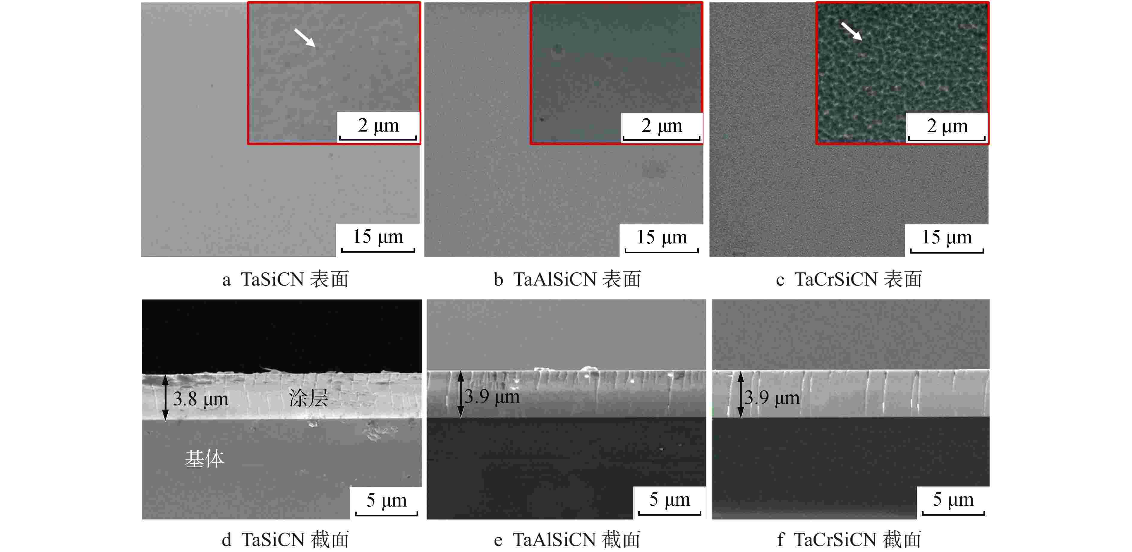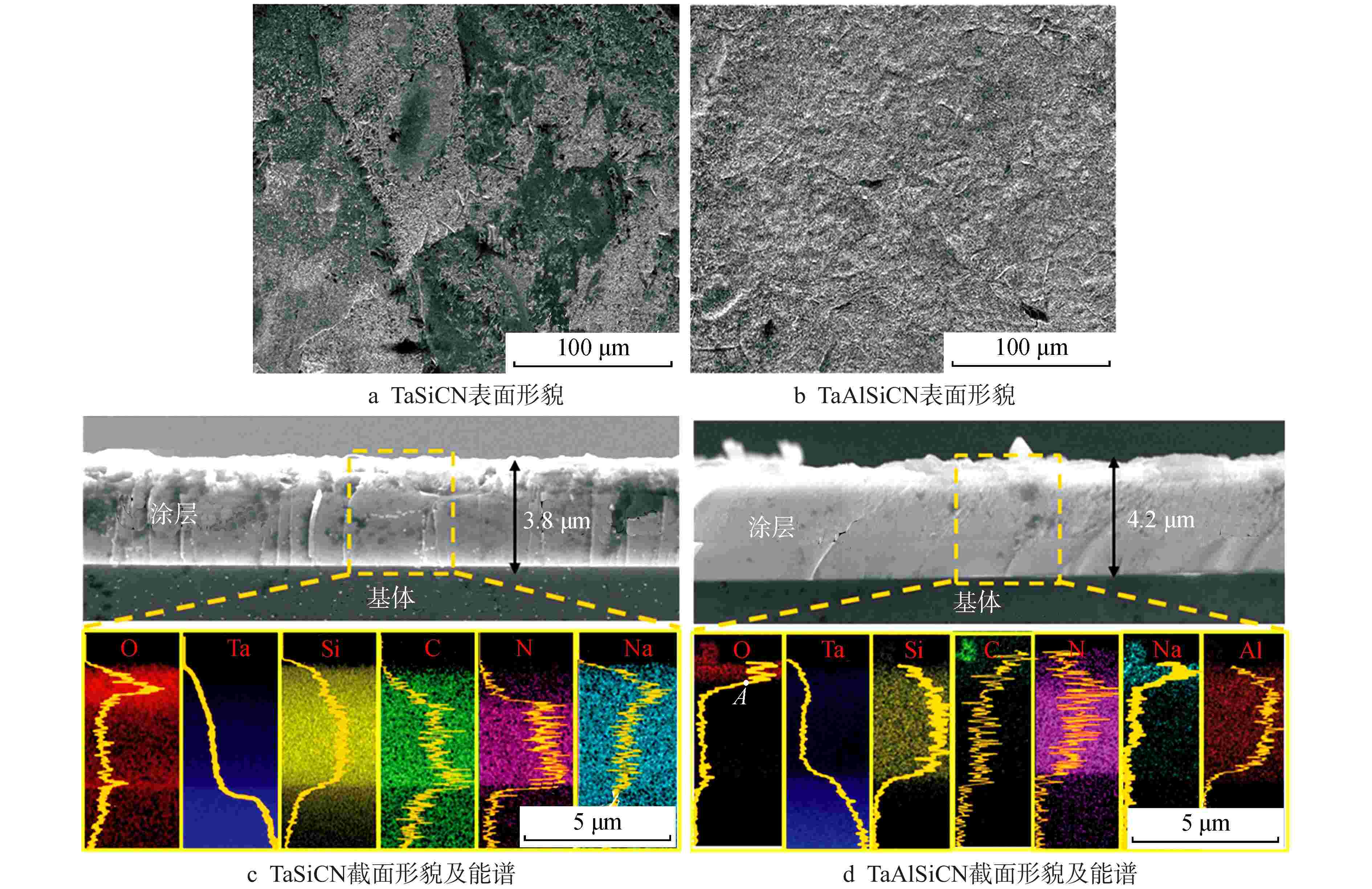 图 6 腐蚀4 h后涂层的XPS图谱 图6a能级谱图中从上到下依次为TaSiCN、TaAlSiCN、TaCrSiCN涂层 Figure 6. XPS Core Level Spectra of Coatings after 4 h Corrosion 表 1 TaSiCN、TaAlSiCN和TaCrSiCN涂层的EDS元素分析 Table 1. EDS Elemental Composition of TaSiCN, TaAlSiCN and TaCrSiCN Coatings 试样 气体流量/(mL·min−1) 元素原子百分比/% Ar N2 Ta Si C N Al Cr TaSiCN 48 6 26 6 40 29 0 0 TaAlSiCN 48 6 22 8 34 26 10 0 TaCrSiCN 48 6 21 9 33 24 0 13 表 2 TaSiCN、TaAlSiCN和TaCrSiCN涂层表面和截面内部的EDS元素分析 Table 2. EDS Element Analysis of Surface and Cross Section of TaSiCN, TaAlSiCN and TaCrSiCN Coatings 分析区域 元素原子百分比/% Ta Si C N O Al Cr Cl Na K 涂层表面 TaSiCN 18.1 4.4 20.7 4.3 44.2 0.6 6.8 0.9 TaAlSiCN 12.8 4.8 28.2 6.6 40.5 3.2 0.5 6.8 1.4 TaCrSiCN 17.9 4.9 25.5 13.3 24.7 9.6 0.1 3.8 0.2 涂层截面内部 TaSiCN 19.9 8.5 25.8 38.4 5.6 0 1.8 0 TaAlSiCN 21.6 6.3 26.1 32.2 3.8 9.8 0 0.2 0 TaCrSiCN 17.9 7.9 23.1 31.2 7.2 10.3 0 2.4 0