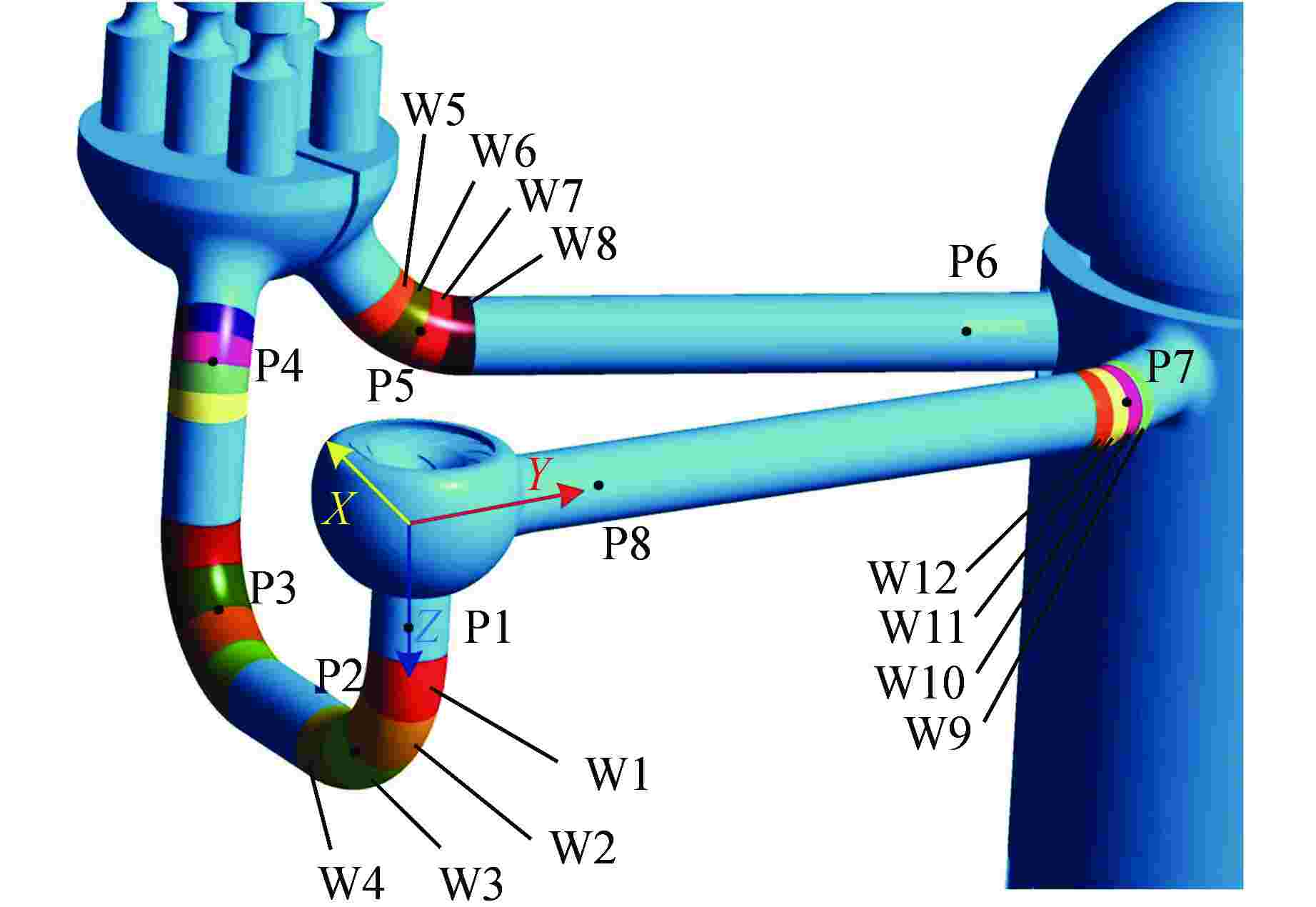 摘要: 为真实反映事故工况下反应堆冷却剂系统瞬态内流过渡过程及水力载荷冲击,针对“华龙一号”反应堆及一回路系统,建立了高精度三维闭式系统瞬态流动计算方法,得到了该过渡过程中反应堆及一回路系统管路内压力波震荡规律及瞬态水力载荷特性。研究表明:在核主泵转子卡滞结束时,核主泵出口处流量降低到稳定运行时的81.3%。在卡转子过渡过程中,系统管路内最大压力峰值位于核主泵入口截面处,为16.00 MPa,小压力谷值位于核主泵出口截面处,为15.01 MPa,最终系统内各监测点的压力趋于参考压力15.50 MPa。受反应堆冷却剂系统管路布置方式与核主泵卡转子事故的双重影响,各截面的流体速度呈现明显的不均匀分布,并产生了明显的涡流。系统各壁面水力载荷变化规律与系统压力脉动变化规律一致,最大载荷力峰值位于过渡段第一个弯头处的W3壁面处,为3.163×106 N;最小载荷力谷值位于反应堆压力容器入口处弯头的W12壁面处,为9.125×105 N。本数值预测方法可为主泵卡转子事故工况下反应堆冷却剂系统管路的设计与安全性评估提供技术支持。Abstract: In order to truly reflect the transient internal flow transition process and hydraulic load impact of the reactor coolant system under accident conditions, a high-precision three-dimensional closed system transient flow calculation method was established for the HPR1000 reactor and its primary system, and the pressure wave oscillation law and transient hydraulic load characteristics of the pipeline of the reactor and primary system during the transition process were obtained. The results show that: in the end of the reactor coolant pump rotor seizure, the flow rate at the reactor coolant pump outlet decreased to 81.3% of that in stable operation. During the transition process of the rotor seizure, the maximum pressure peak value in the system pipeline is located at the inlet section of the reactor coolant pump, which is 16.00 MPa; the minimum pressure valley value is located at the outlet section of the reactor coolant pump, which is 15.01 MPa. Finally, the pressure of each monitoring point in the system tends to the reference pressure of 15.50 MPa. Under the dual influence of the piping layout of reactor coolant system and the rotor seizure accident of reactor coolant pump, the fluid velocity of each section shows obvious uneven distribution, and obvious eddy currents occurs. The variation rule of hydraulic load on each wall of the system is consistent with the variation rule of system pressure pulsation. The maximum load force peak is located at the W3 wall at the first elbow of the transition section, which is 3.163×106 N; the minimum load force valley value is located at the W12 wall of the elbow at the inlet of the reactor pressure vessel, which is 9.125×105 N. This numerical prediction method can provide technical support for the design and safety assessment of the reactor coolant pipeline under the condition of the reactor coolant pump rotor seizure.