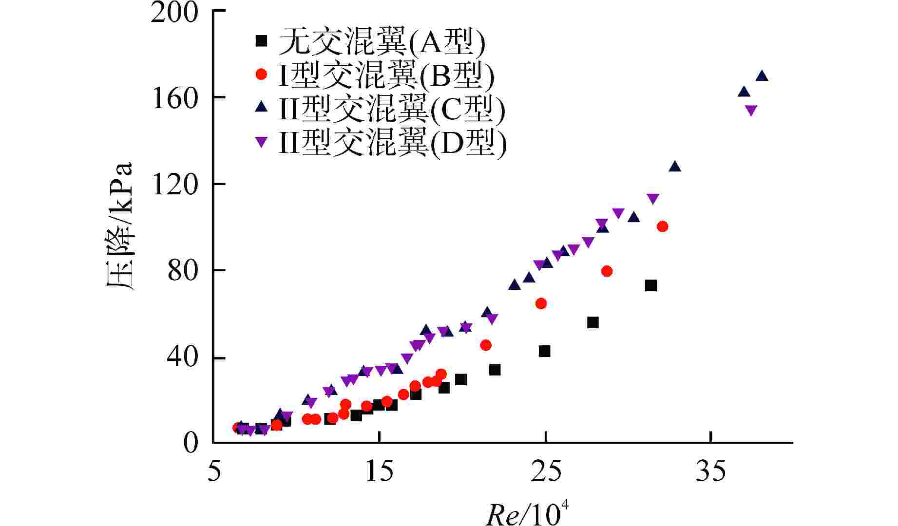 定位格架编号 交混翼结构 ΔT/℃ ΔT/(Tout−Tin) A 无交混翼 36.4 0.91 B I型交混翼 11.1 0.28 C II型交混翼 7.5 0.19 D II型交混翼 8.8 0.22 -