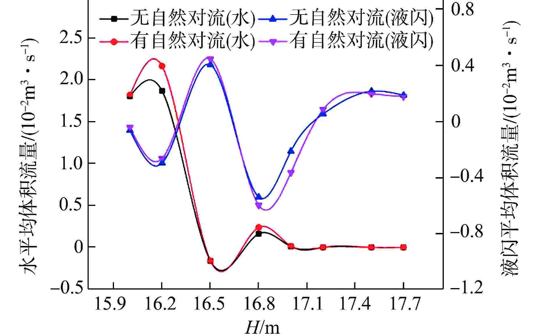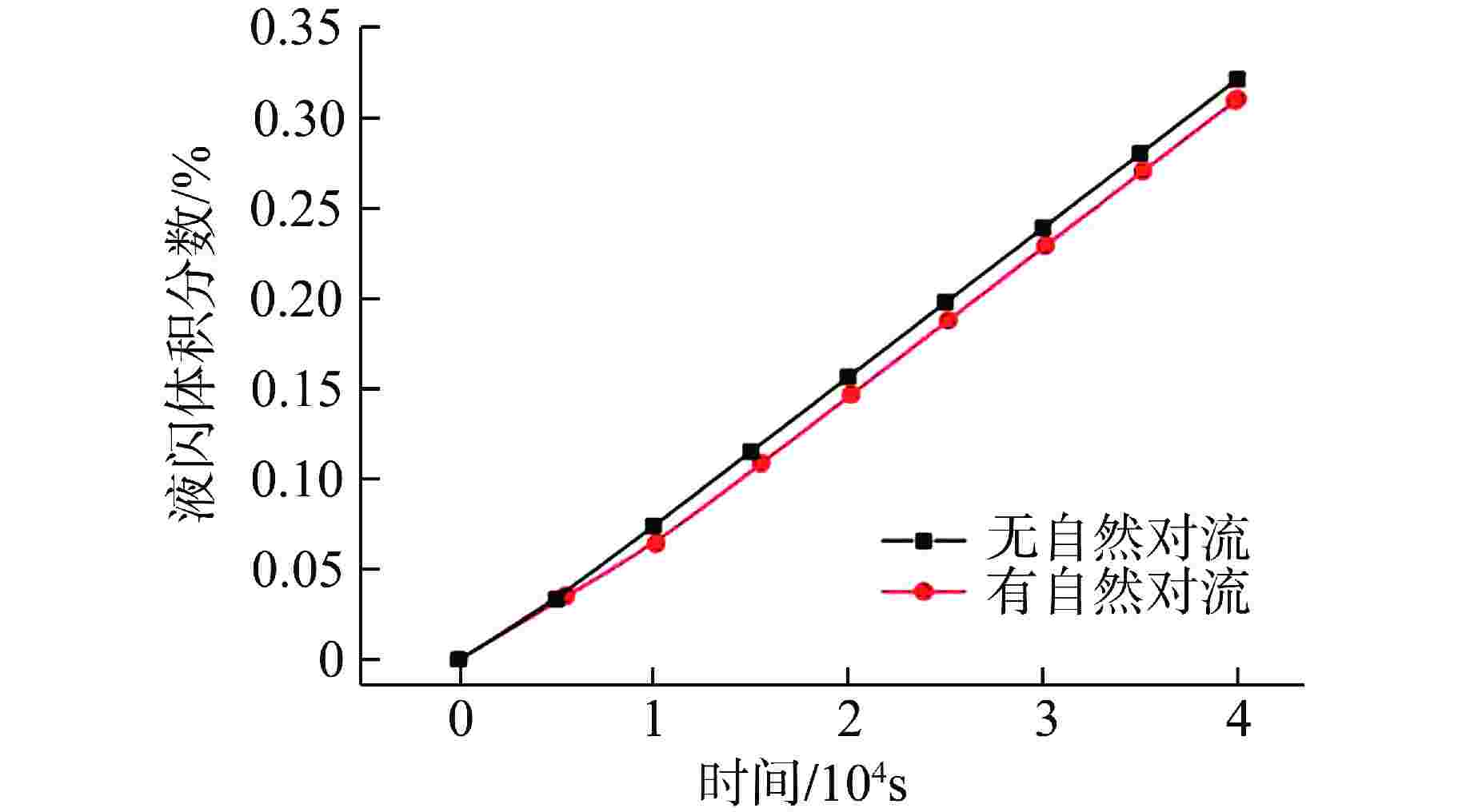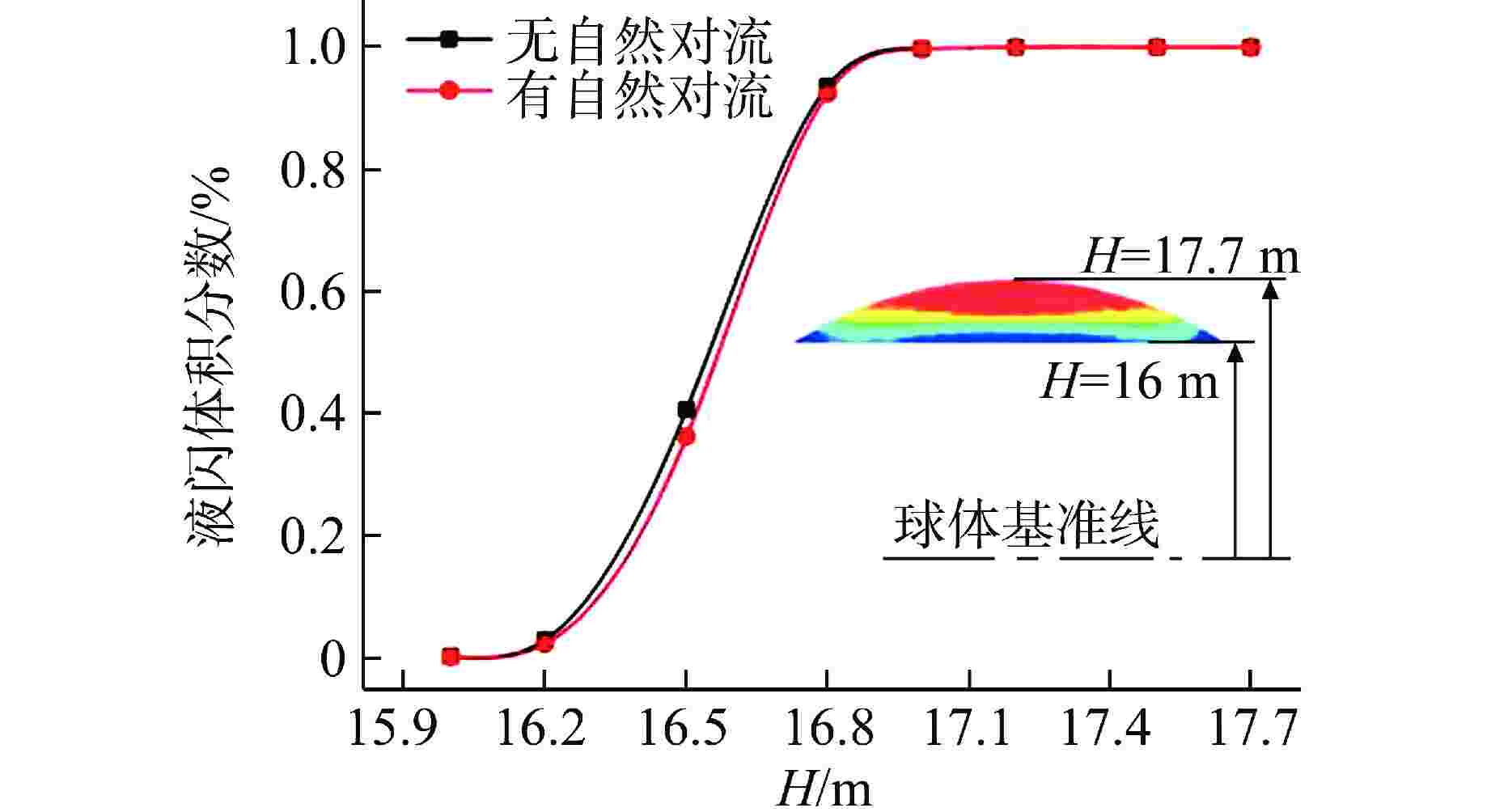 工况设置 工况一(无自然对流) 工况二(有自然对流) 相的数量 两相 两相 初始液闪体积分数 0 0 液闪密度/(kg·m−3) 不变 变化 入口温度/℃ 24 24 球壁面温度/℃ 24 20~22.74 计算工况 瞬态 瞬态 -