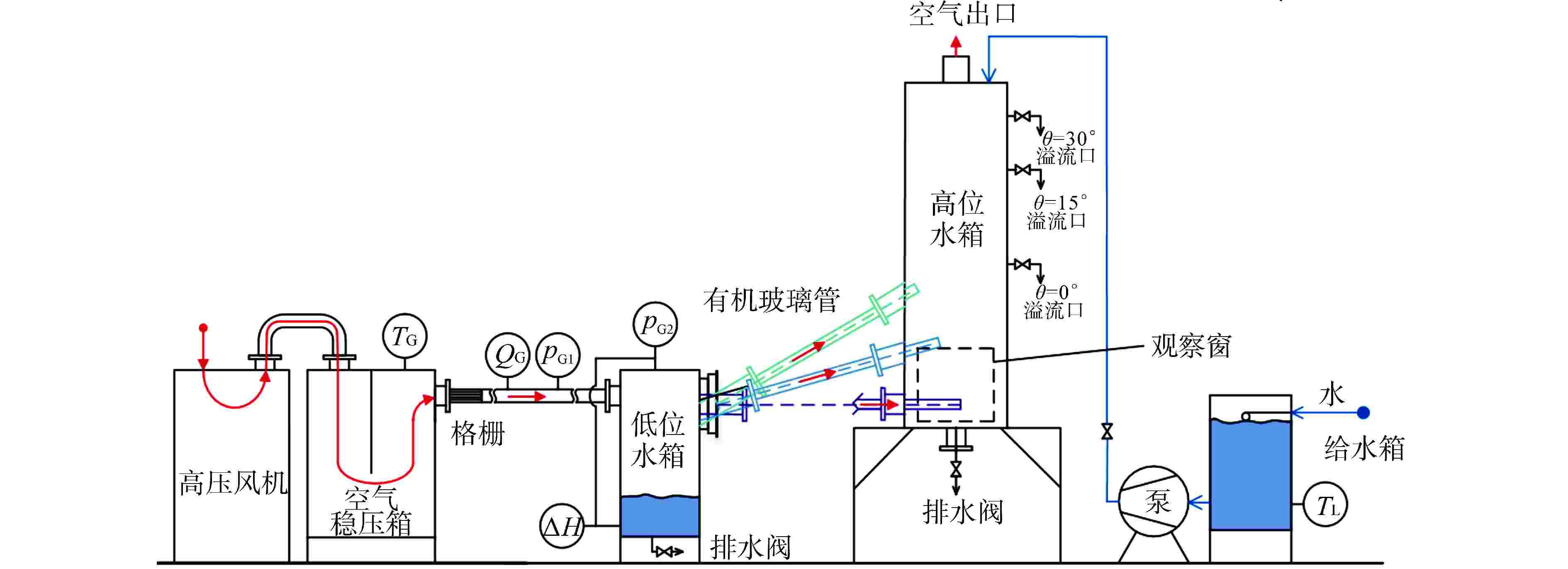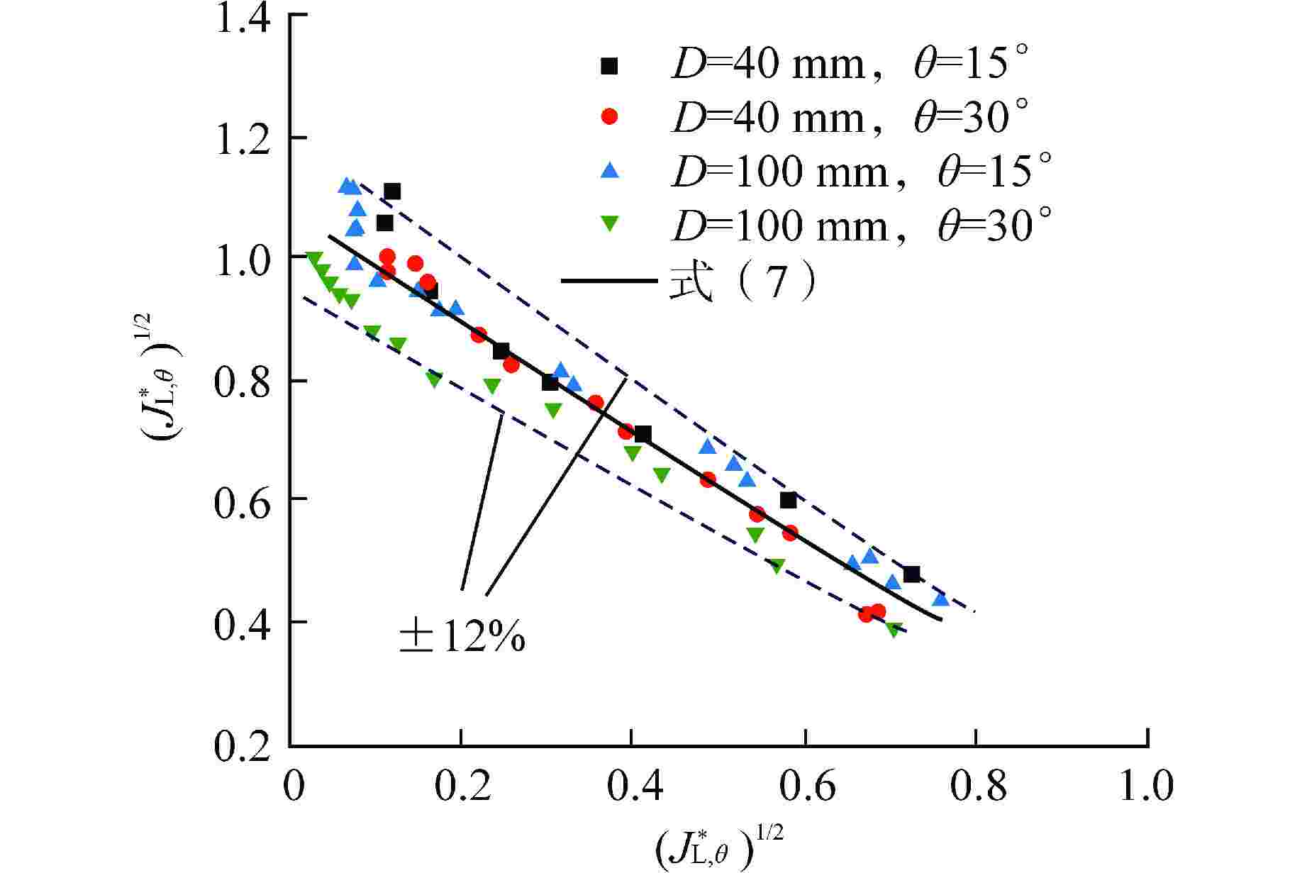 $ \begin{aligned} n = \; & 1{\text{.8149}} \times {\text{1}}{{\text{0}}^{\text{1}}} - {\text{1}}{\text{.9471}}\theta {\text{ + 6}}{\text{.7058}}\times \\[-3pt] & {\text{1}}{{\text{0}}^{ - {\text{2}}}}{\theta ^{\text{2}}} - {\text{5}}{\text{.3227}} \times {\text{1}}{{\text{0}}^{ - {\text{4}}}}{\theta ^{\text{3}}}\end{aligned} $θ=2°, 5°, 10°, 20°, 40°, 60°, 70°, 80°, 90° 空气/水 Chen等[19] D=20 $ F{r_{{\rm{G}}}}^{1/4} = 0.98 - 2.61{(F{r_{{\rm{L}}}} \cdot O{h_{{\rm{L}}}})^{1/4}} $