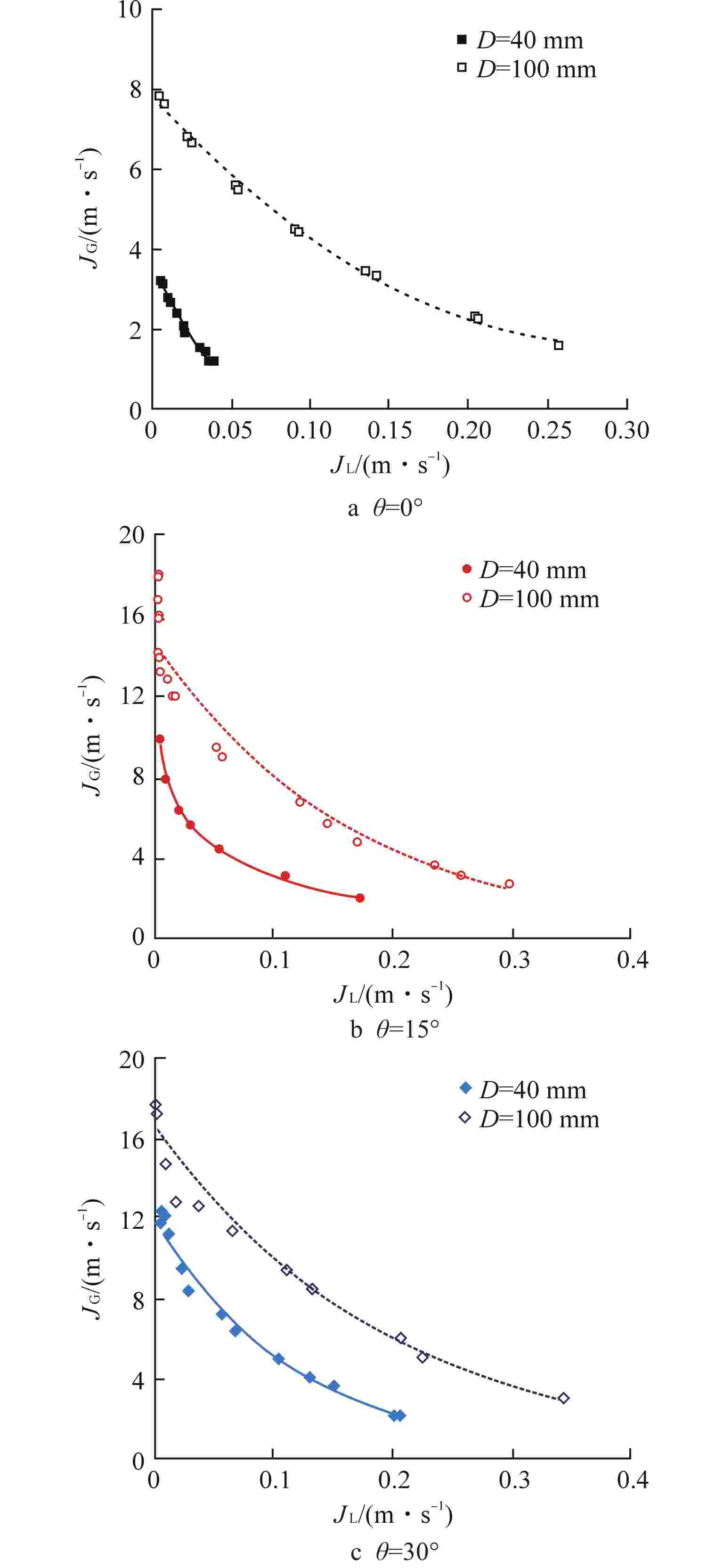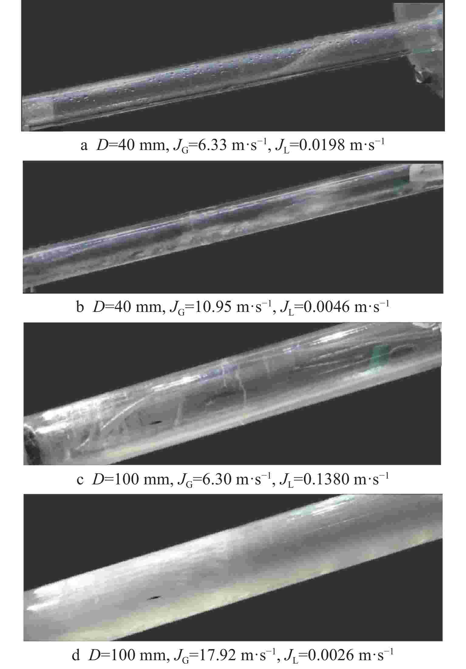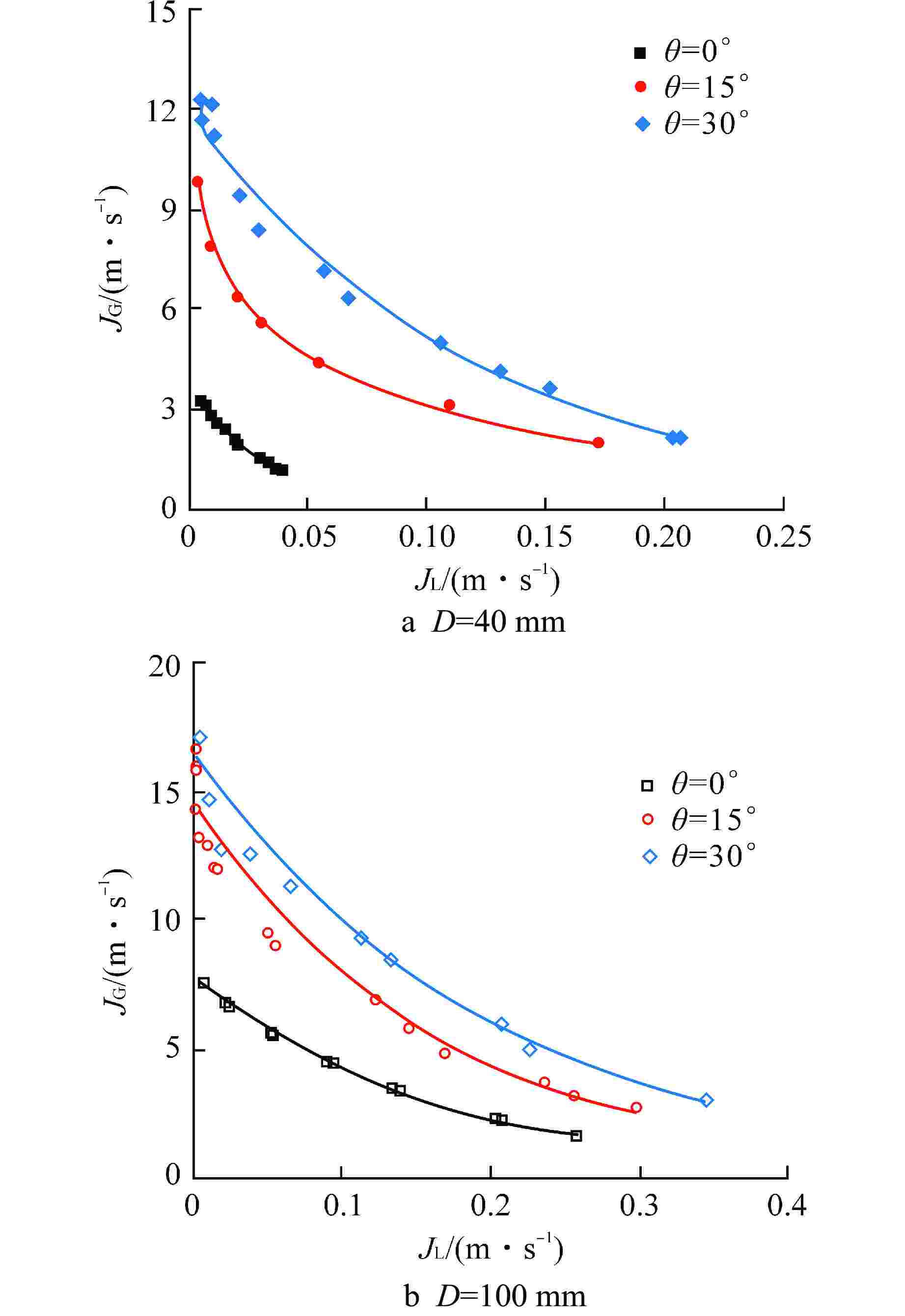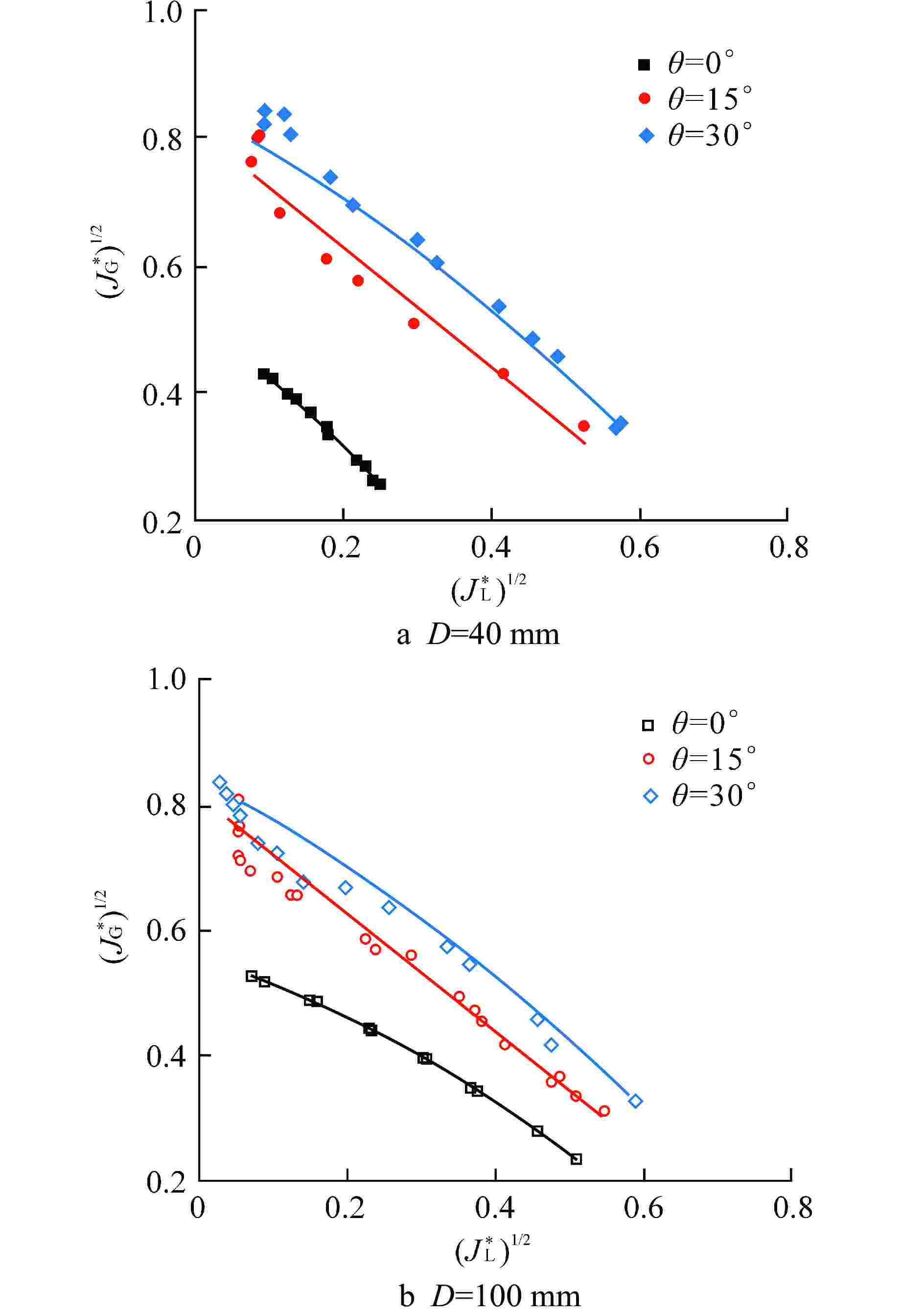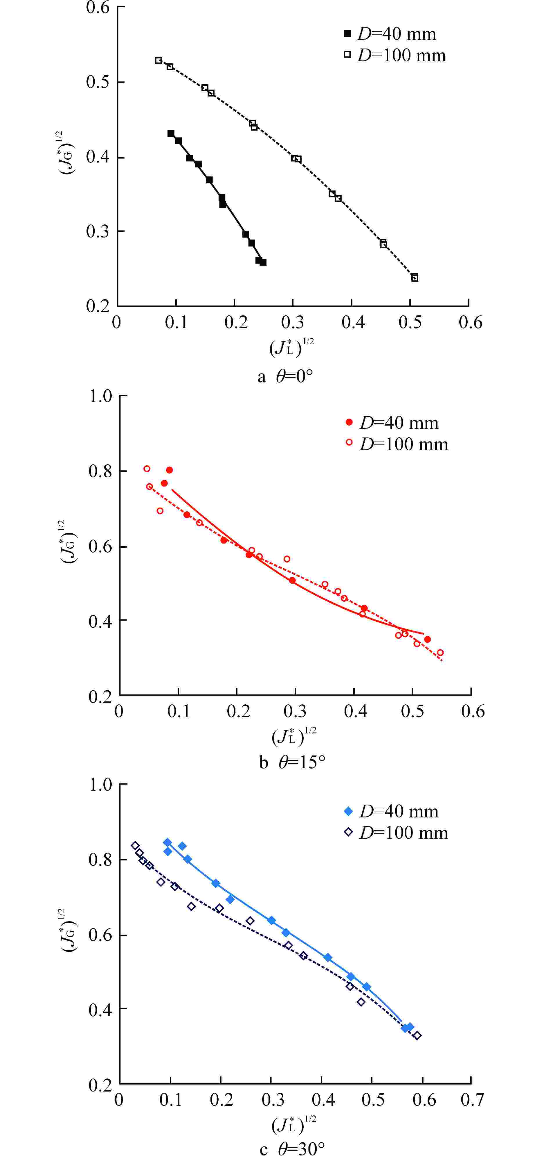 $ F{r_{\text{G}}} = \dfrac{{{\rho _{\text{G}}}J_{{\rm{G}}}^2}}{{gD\sin \theta ({\rho _{\text{L}}} - {\rho _{\text{G}}})}} $; $ F{r_{{\rm{L}}}} = \dfrac{{{\rho _{\text{G}}}J_{{\rm{L}}}^2}}{{gD\sin \theta ({\rho _{\text{L}}} - {\rho _{\text{G}}})}} $;