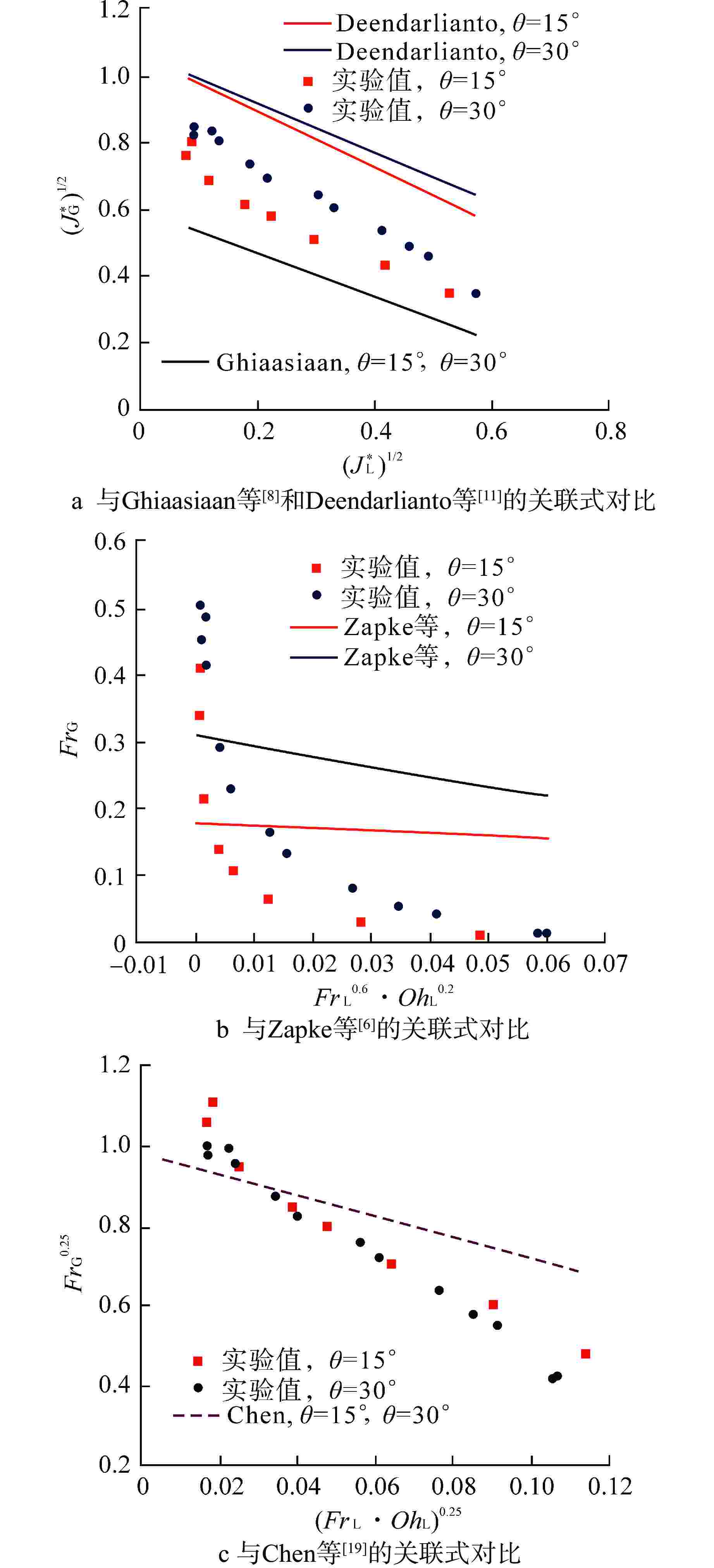 $ F{r_{{\rm{G}}}} = \dfrac{{{\rho _{\text{G}}}J_{{\rm{G}}}^2}}{{g{D_{{\mathrm{e}}}}({\rho _{\text{L}}} - {\rho _{\text{G}}})}} $; $ F{r_{\text{L}}} = \dfrac{{{\rho _{\text{L}}}J_{\text{L}}^{\text{2}}}}{{g{D_{{\mathrm{e}}}}({\rho _{\text{L}}} - {\rho _{\text{G}}})}} $; $ O{h_{{\rm{L}}}} = \sqrt {\dfrac{{\mu _{\text{L}}^2}}{{{\rho _{\text{L}}}{D_{{\mathrm{e}}}}\sigma }}}$