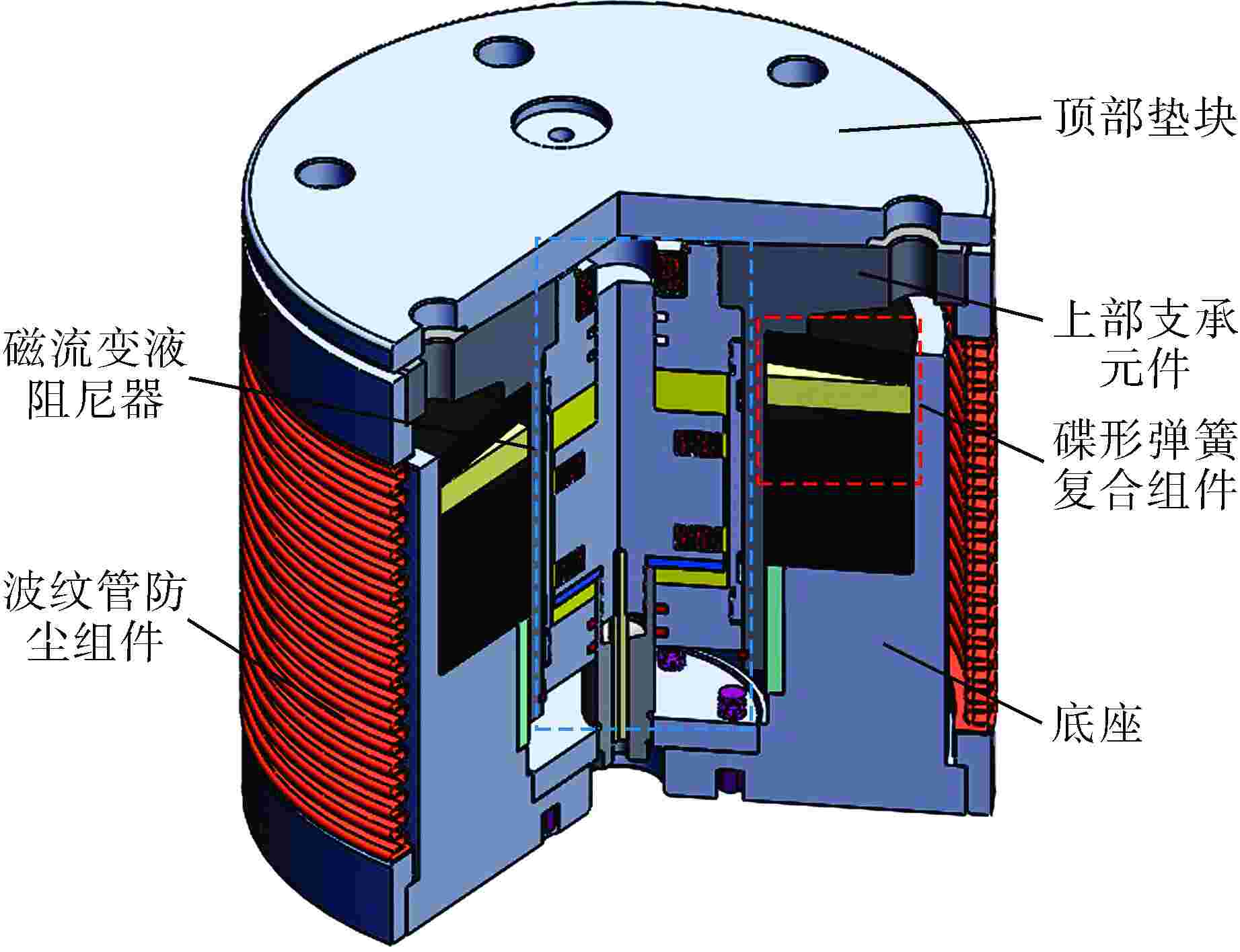 摘要: 采用碟形弹簧与磁流变液相结合的方式,针对核动力系统重型设备设计了一种大承载隔振器。该隔振器采用磁流变液阻尼器作为主要阻尼部件,采用小刚度和大刚度碟形弹簧复合组件作为主要承载结构。通过对碟形弹簧复合组件进行分析设计,确定复合组件的结构参数,构造隔振器样品。对隔振器样品进行动静刚度和阻尼比性能测试,结果表明该隔振器的额定承载达到11 t,额定承载下固有频率约为6.2 Hz,在主要隔振频率范围内的动刚度和阻尼比性能较为稳定。但动刚度和阻尼比受振动幅度影响较大,当振动幅度由0.05 mm提高至0.2 mm时,动刚度由约100 kN/mm降低至约45 kN/mm,阻尼比由约0.07提高至约0.19。本文研究可为后续工程应用提供技术参考和支撑。Abstract: A large-load isolator is designed for heavy equipment of nuclear power system by combining disc spring with magnetorheological liquid phase. The magnetorheological fluid damper is used as the main damping component, and the composite component of small stiffness and large stiffness disc spring is used as the main bearing structure. Through the analysis and design of the disc spring composite component, the structural parameters of the composite component are determined, and the sample isolator is formed accordingly. The spring rate ratio and damping ratio of the isolator samples were tested. The results show that the rated load of the isolator reaches 11 tons and the natural frequency is about 6.2 Hz. The dynamic stiffness and damping ratio performance of the isolator are relatively stable in the range of main vibration isolation frequencies. However, the dynamic stiffness and damping ratio are greatly affected by the amplitude. When the vibration amplitude increases from 0.05 mm to 0.2 mm, the dynamic stiffness decreases from about 100 kN/mm to about 45 kN/mm, and the damping ratio increases from about 0.07 to about 0.19. The research in this paper can provide technical reference and support for subsequent engineering applications.