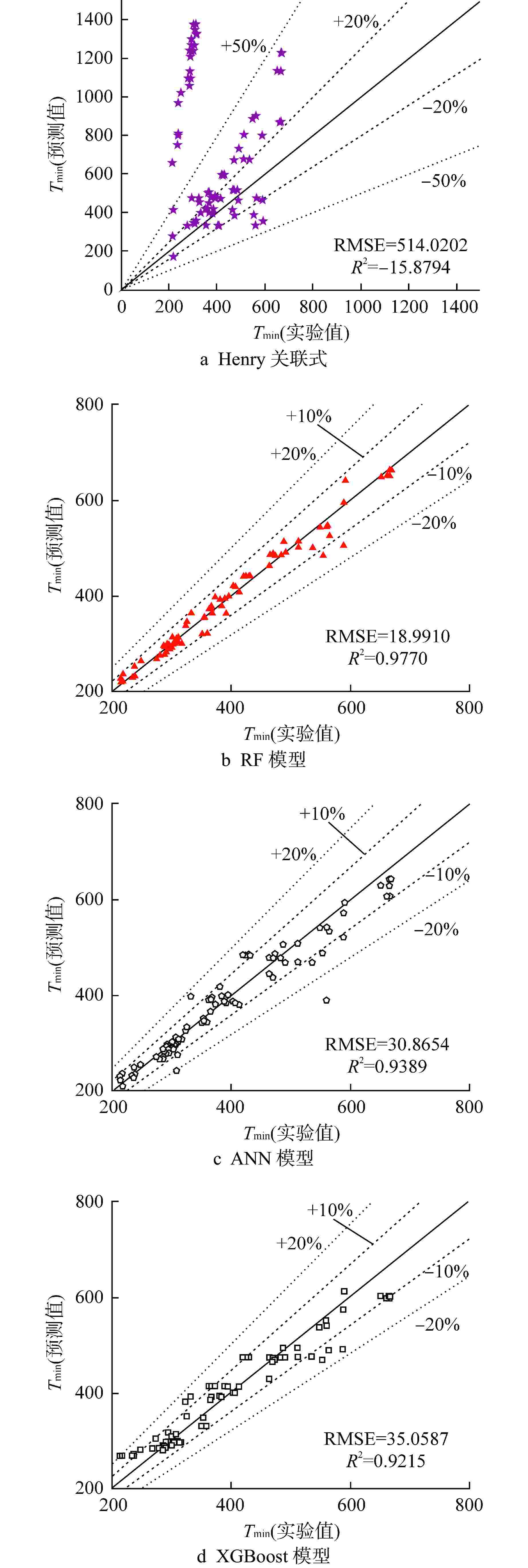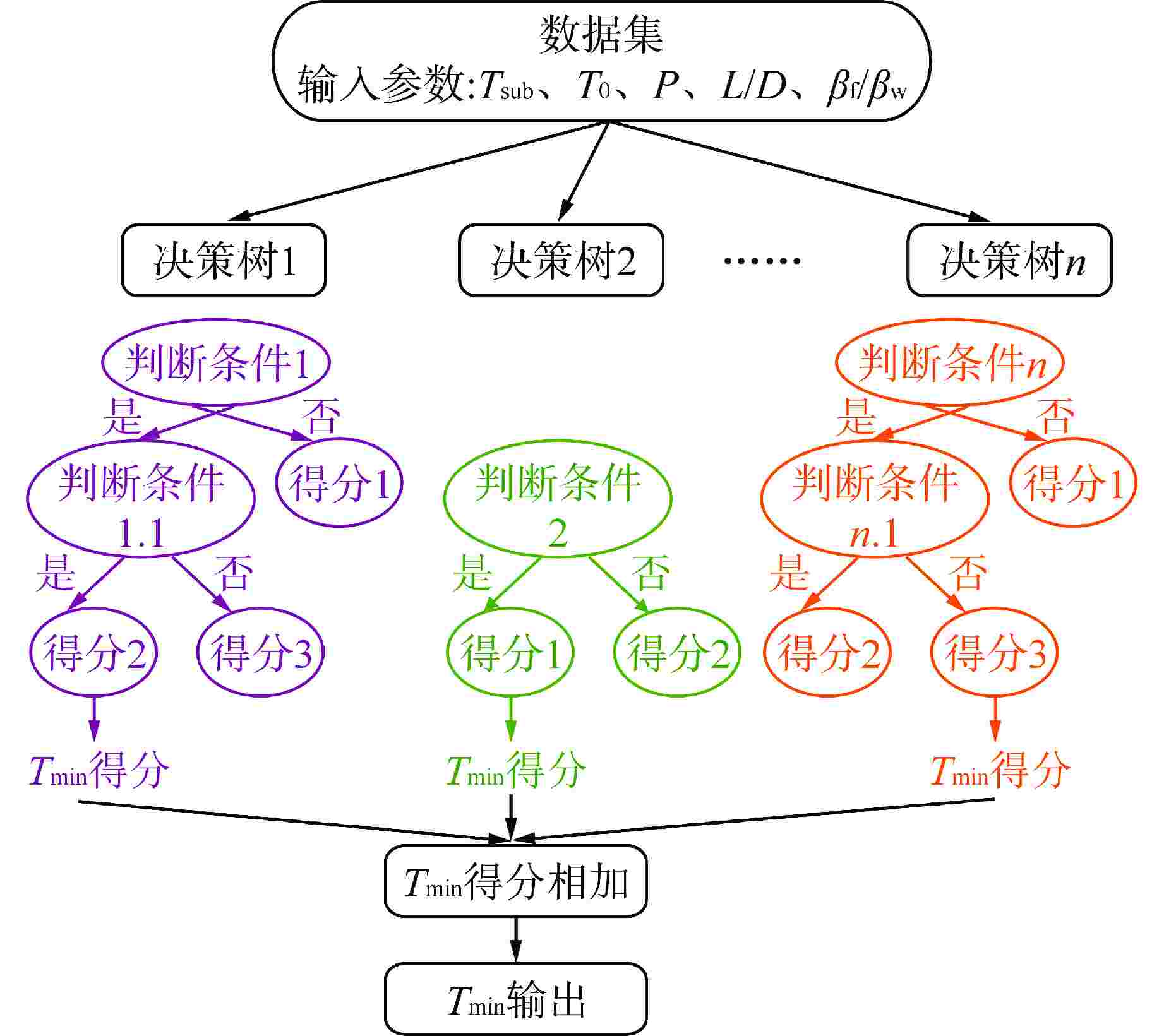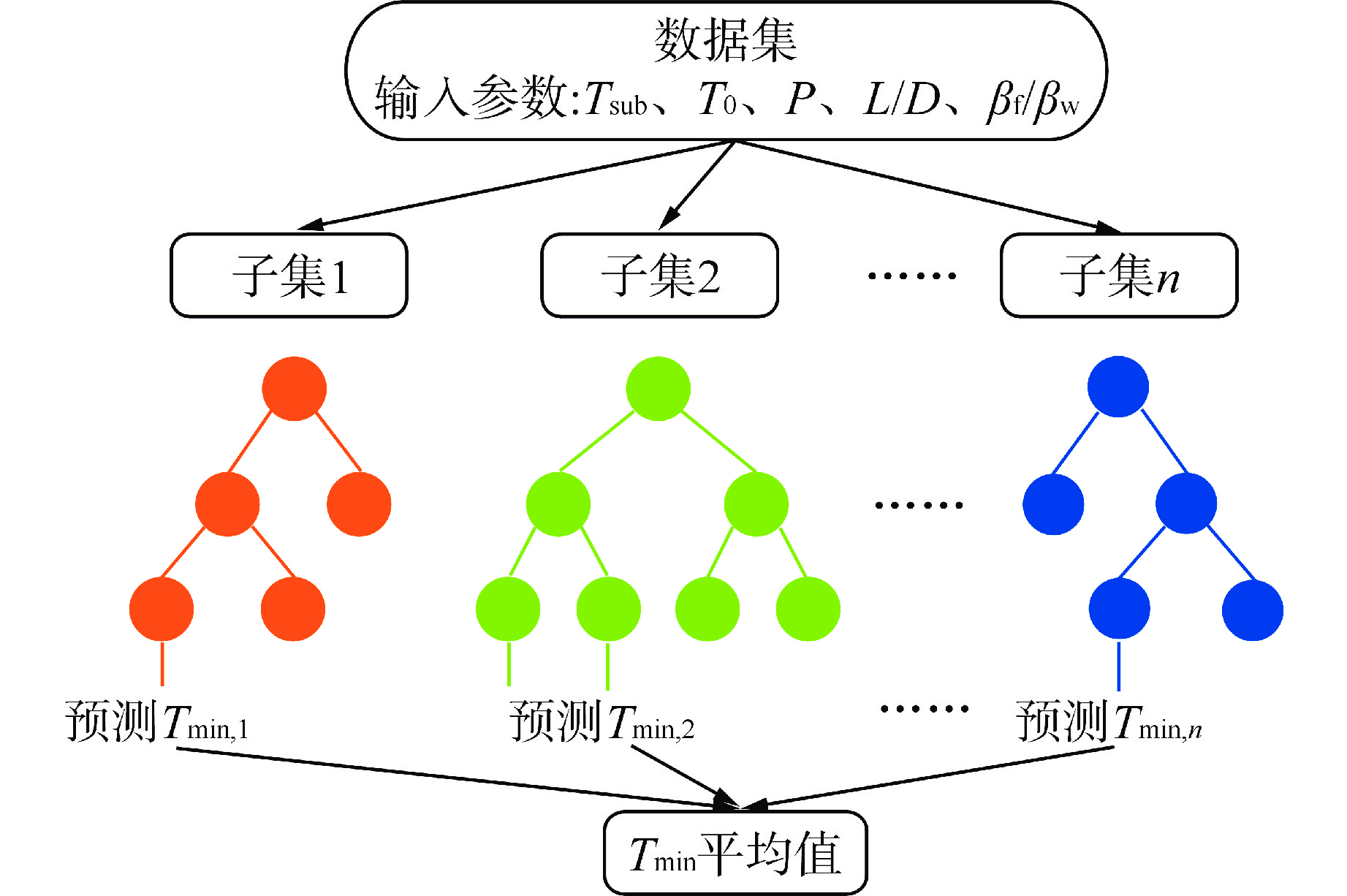 表 1 文献中的Tmin数据集 Table 1. Tmin Dataset in Literature 作者 Tsub/℃ T0/℃ P/MPa L/D βf/βw 包壳材料 数据点数量 Li等[7] 0~40.0 750 0.1 5 0.057 不锈钢 5 Lee and Kim[8] 0 600 0.1 5 0.002~0.057 铜,不锈钢,锆合金 3 Yeom等[9-10] 0~30.0 650 0.1~0.623 5.1~5.15 0.115~0.531 锆合金,氧化锆 35 Ho等[11] 0~30.0 600 0.1 4.67 0.012 黄铜 2 Sakurai等[3] 0 526 0.1~2.063 16.67~41.6 0.015 铂 121 Peterson and Bajorek[12] 0~30.85 675 0.1~3.003 6.35~6.68 0.017~0.119 锆合金,碳钢,不锈钢 129 Ebrahim等[13] 2.0~20.0 450~650 0.1 26.7 0.032~0.066 锆合金,镍铁合金,不锈钢 84 Xiong等[14] 0~20.0 600 0.1 5.75 0.03 铁铬铝合金 5 Lee等[4] 0 400 0.1 6 0.002~0.057 铜,不锈钢 2 Hurley and Duarte[15] 2.0~12.0 510 0.1 31.58 0.026~0.053 镍铜合金,镍铁合金,不锈钢 11 张琪琪等[16] 5.0~20.0 620 0.1 6.5 0.057 不锈钢 4 王泽锋等[17] 5.0~20.0 600 0.1 5.75 0.102 锆合金 5 Xiong等[18] 5.0~25.0 600 0.1 6.5 0.03~0.102 锆合金,铁铬铝合金 10 表 2 不同决策树数量条件下RF模型预测性能对比 Table 2. Comparison of Prediction Performance of RF Model under Different Decision Tree Numbers 决策树数量 RMSE R2 10 20.1431 0.9725 20 19.9435 0.9746 30 19.7747 0.9750 40 19.8531 0.9748 50 19.3697 0.9760 60 18.9910 0.9770 70 19.2617 0.9763 80 19.3298 0.9761 90 19.5394 0.9756 100 19.6504 0.9753 表 3 不同隐藏层架构条件下ANN模型预测性能对比 Table 3. Comparison of Prediction Performance of ANN Model under Different Hidden Layer Architectures 架构 RMSE R2 5-60-1 34.7980 0.9221 5-40-40-1 33.5517 0.9277 5-50-50-1 31.7392 0.9354 5-60-60-1 31.0522 0.9383 5-40-40-40-1 32.0389 0.9339 5-50-50-50-1 30.8654 0.9389 5-60-60-60-1 31.0644 0.9374 表 4 不同弱学习器数量条件下XGBoost模型预测性能对比 Table 4. Comparison of Prediction Performance of XGBoost Model under Different Weak Learner Numbers 弱学习器数量 RMSE R2 50 36.12307 0.9166 100 35.05868 0.9215