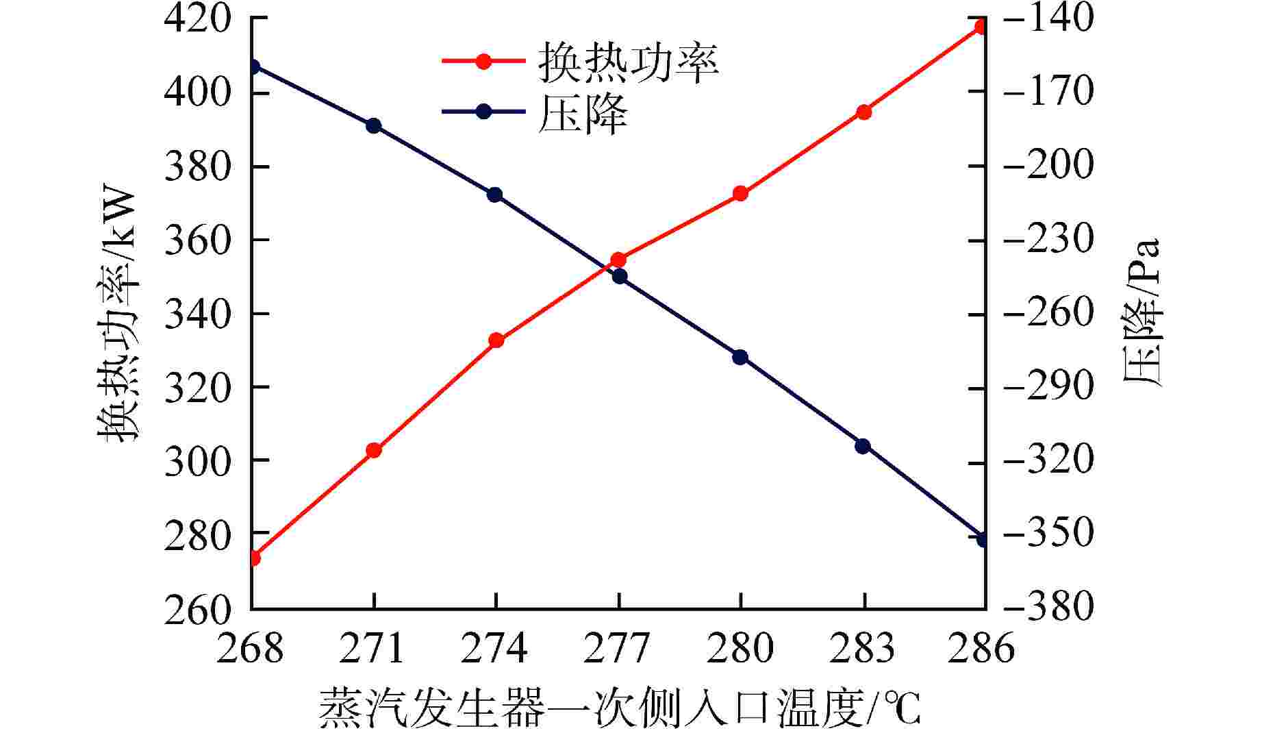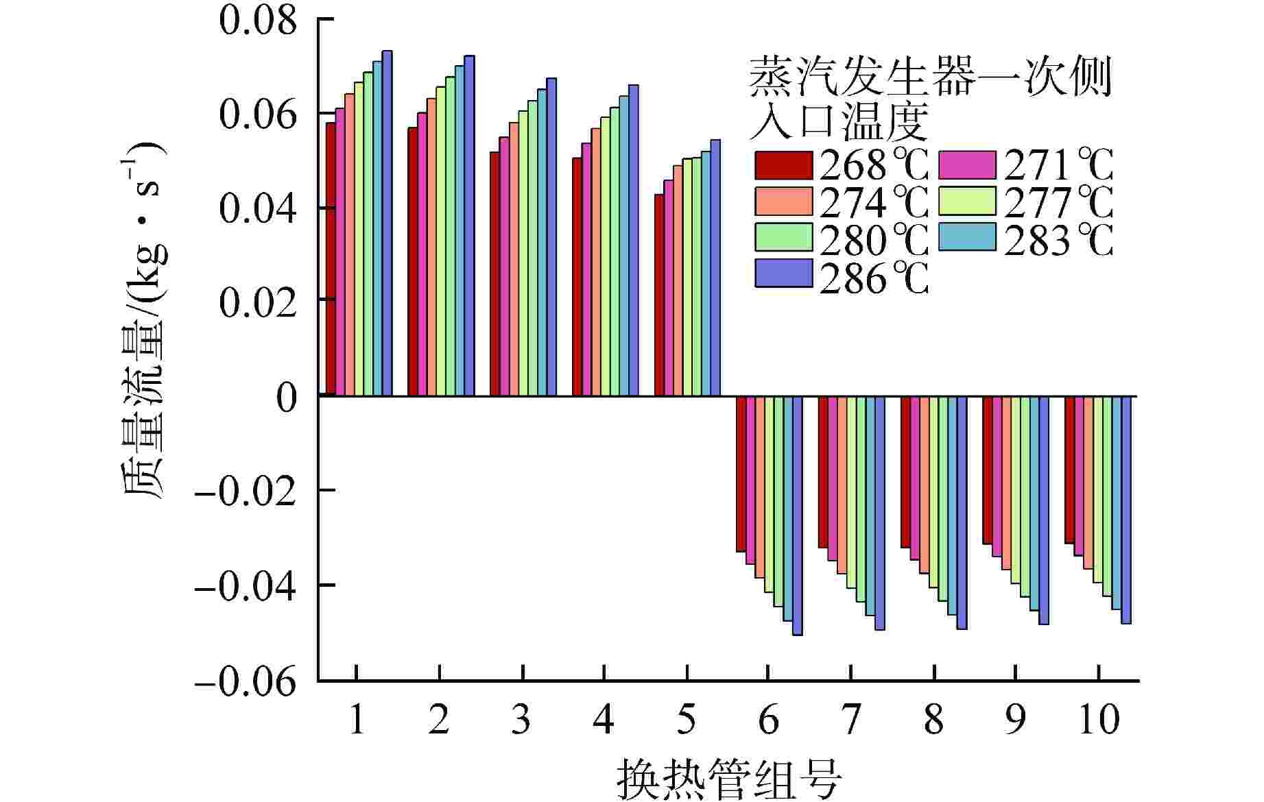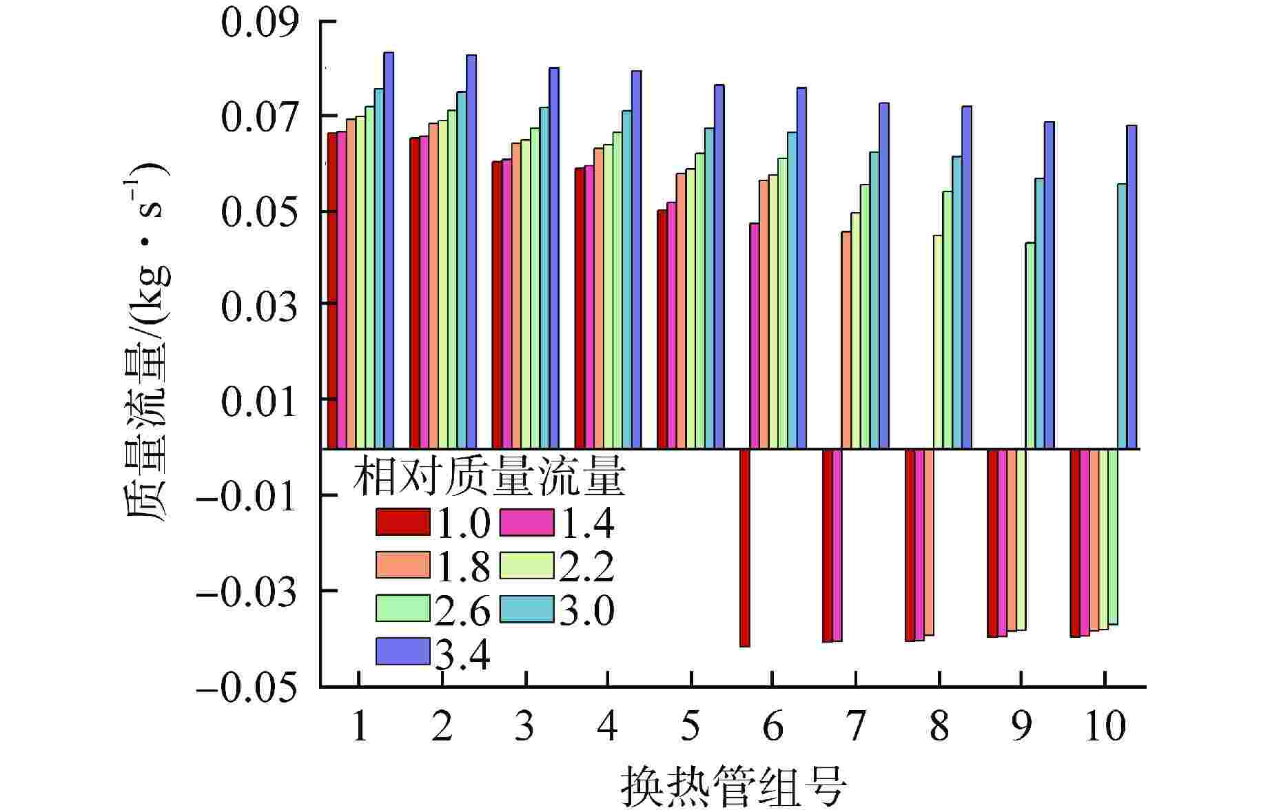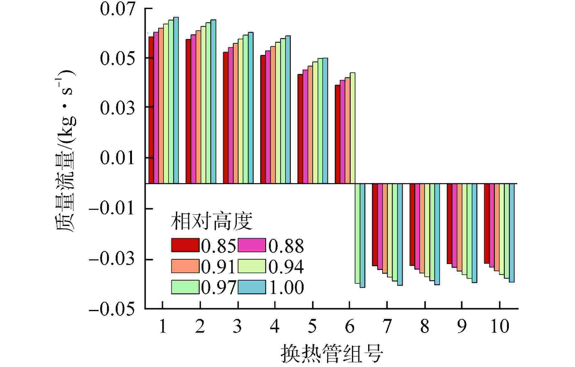 参数名 计算值 实验值 相对偏差/% 质量流量/(kg·s−1) 1.16 1.11 4.5 蒸汽发生器两端压降/Pa −244.6 −262.0 6.6 反应堆功率/kW 354.3 350 1.2 表 3 流量分配计算结果