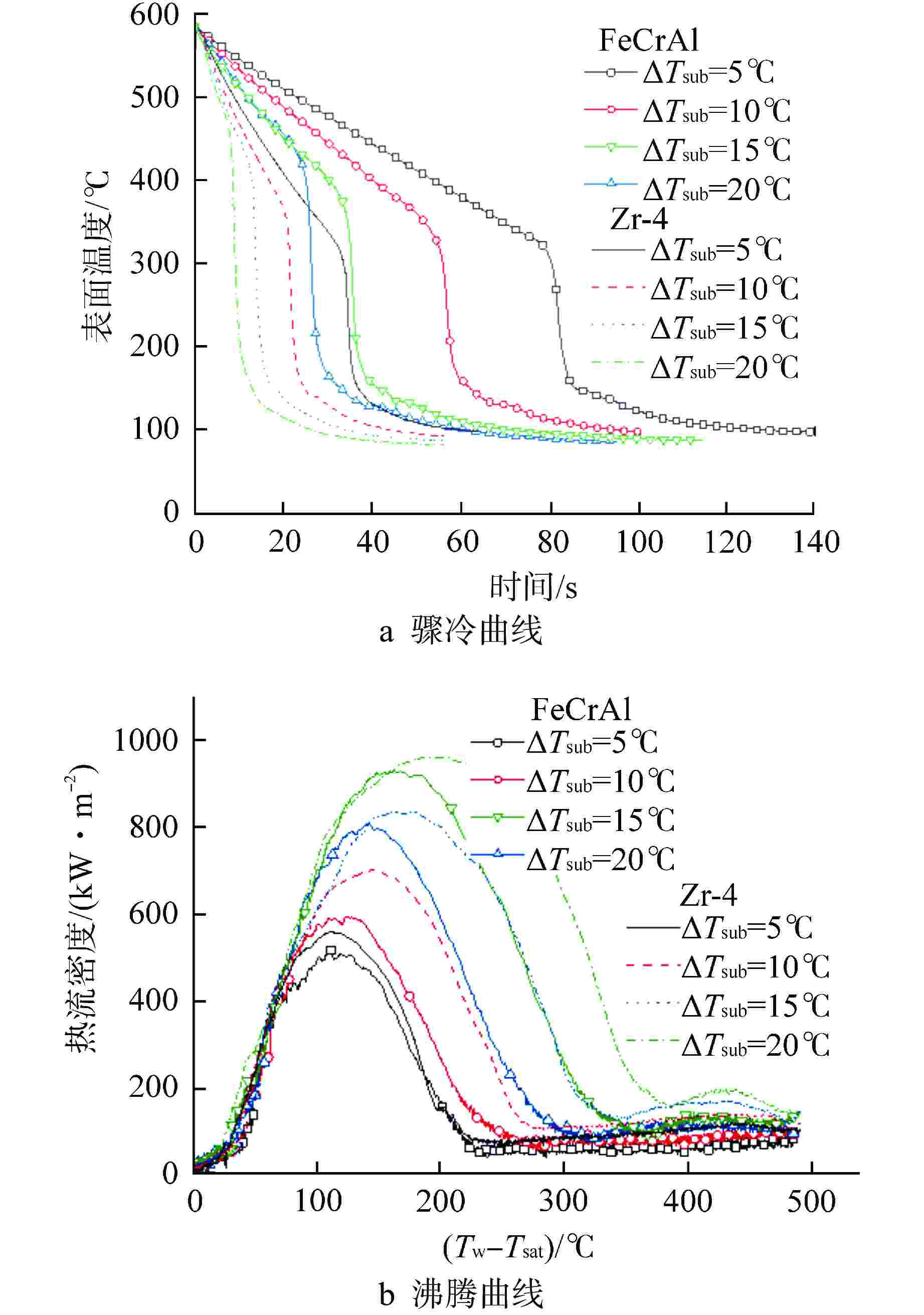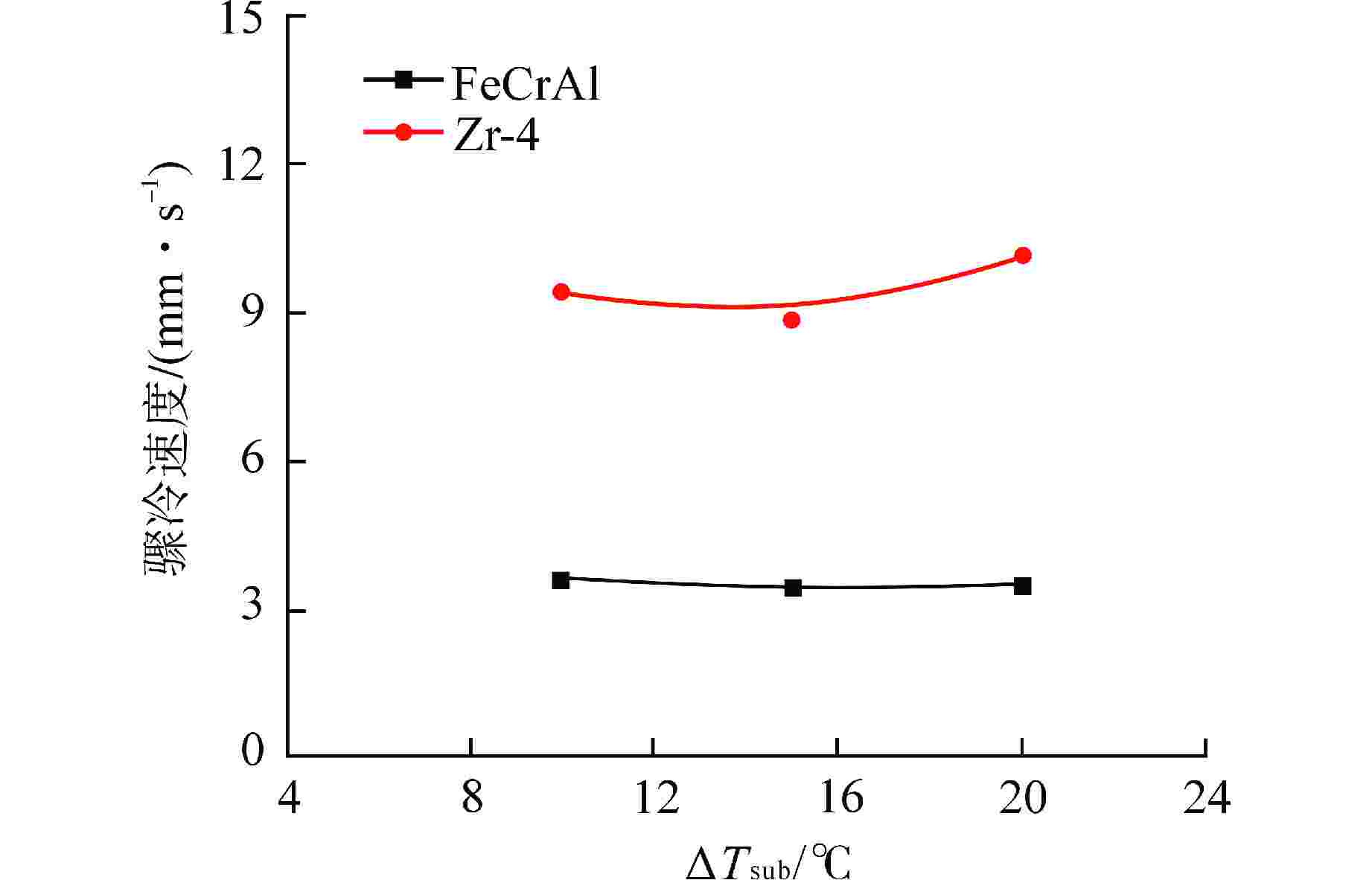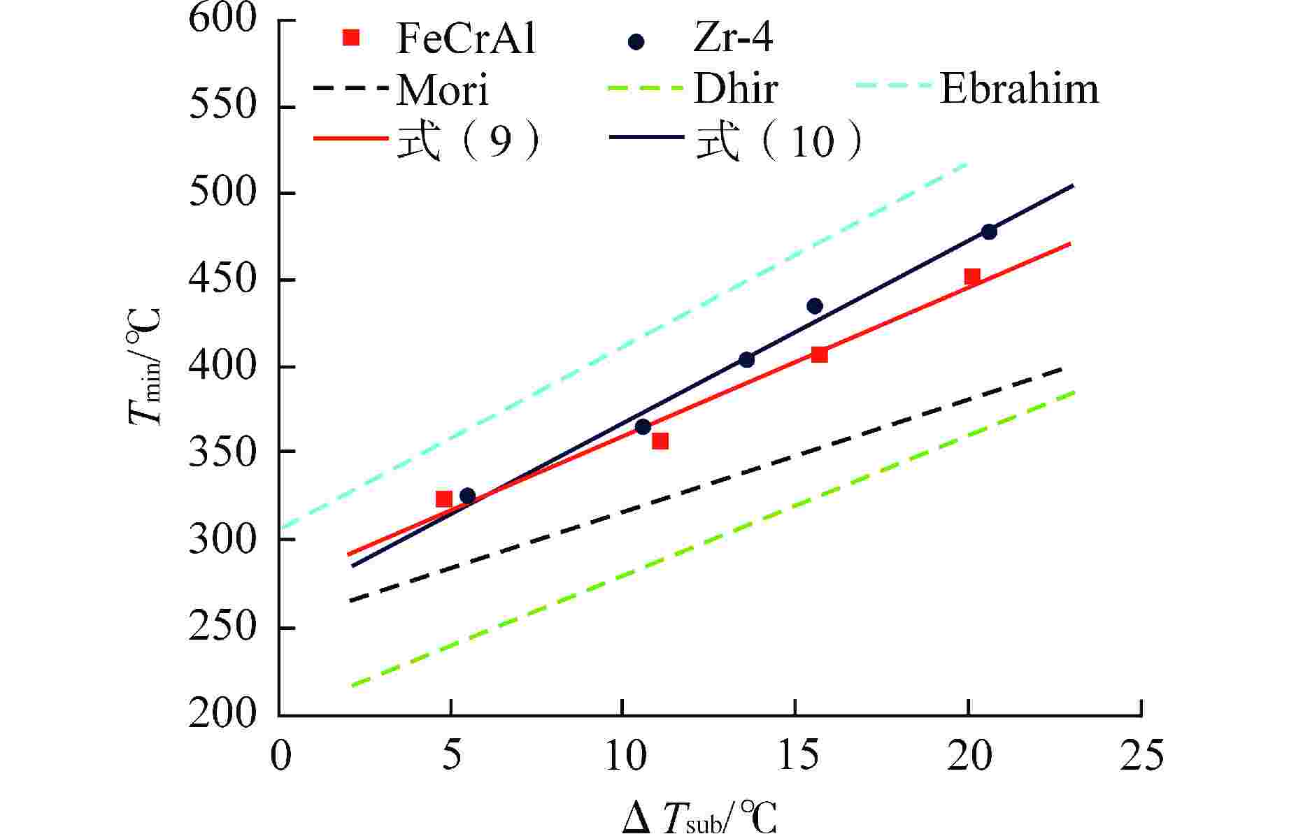 (J·kg−1·K−1)粗糙度/μm 接触角 FeCrAl 7100 13 460 0.2 93.4˚ Zr-4 6550 13.4 286 0.2 103.8˚ 表 2 最小膜态沸腾温度与过冷度的线性关系式