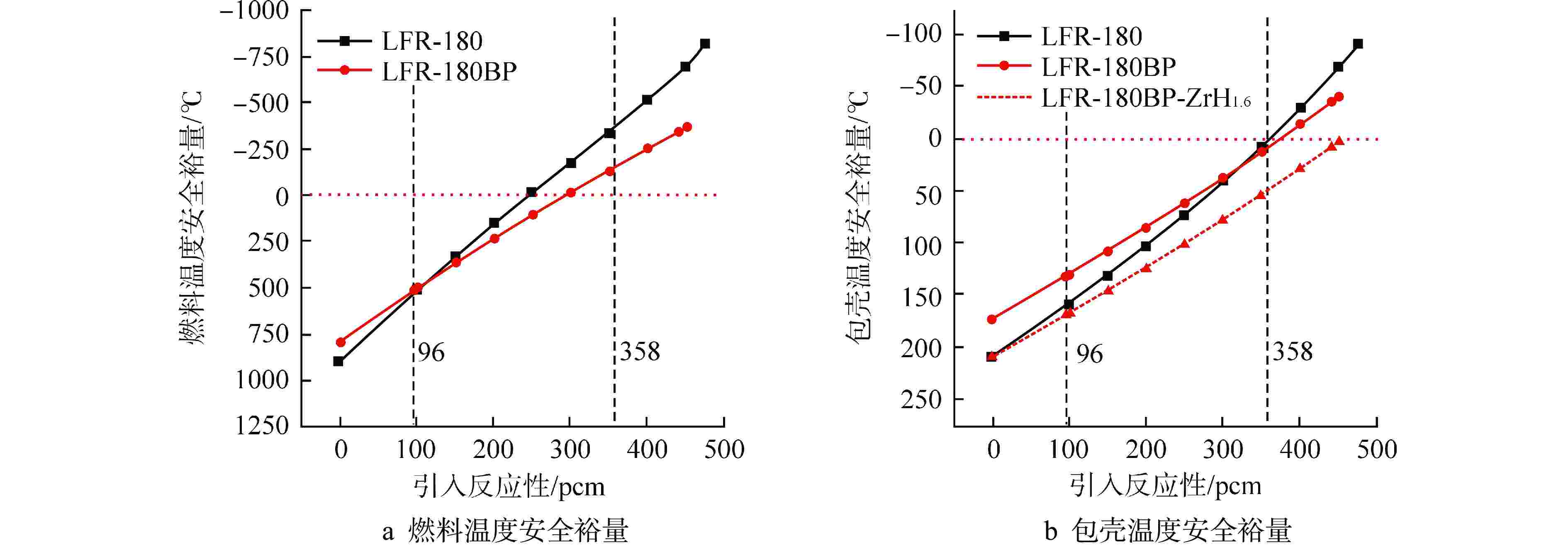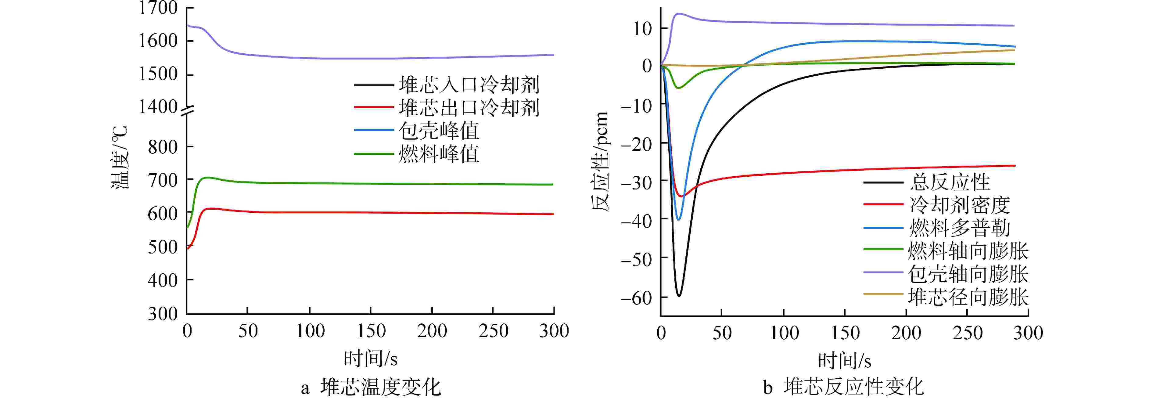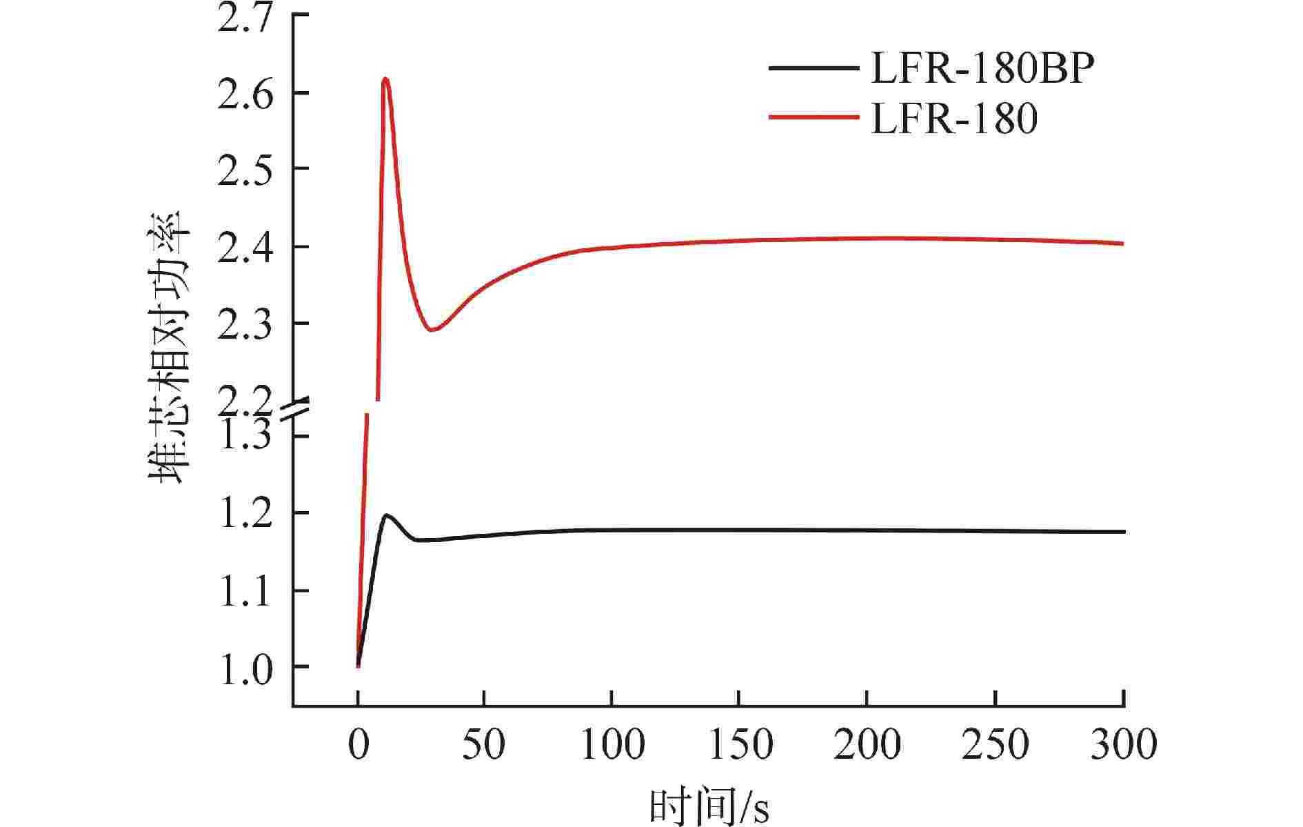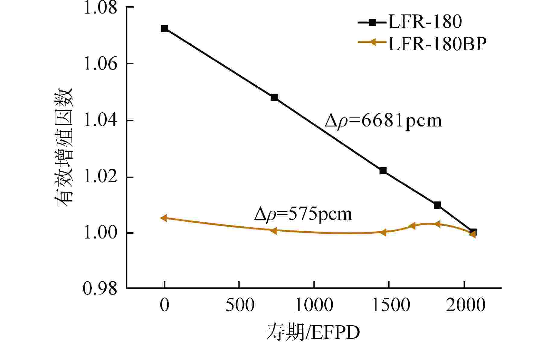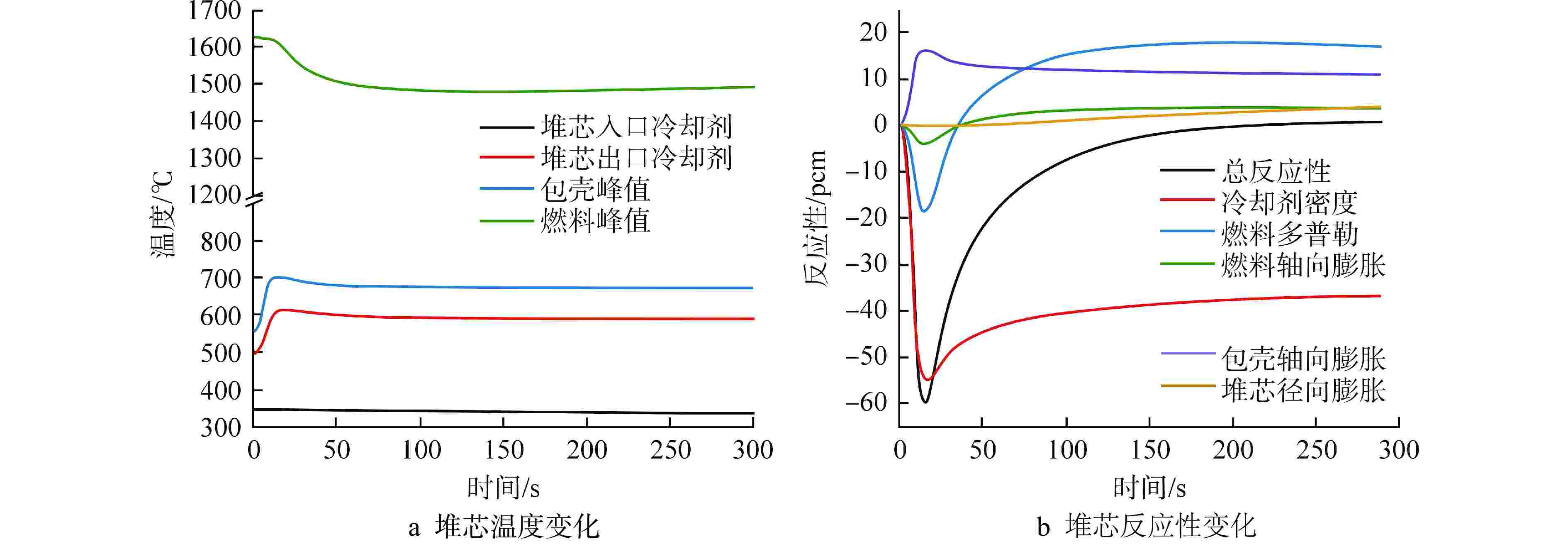 参数 LFR-180 LFR-180BP BOL EOL BOL EOL 缓发中子份额/pcm 777 658 776 674 寿期反应性波动/pcm 6681 575 堆芯空泡价值/pcm −16515±25 −16380±25 −10425±25 −9796±25 冷却剂密度反应性反馈系数/(pcm·K−1) −0.68±0.02 −0.60±0.03 −0.43±0.03 −0.37±0.03 多普勒常数/pcm 燃料 −476±27 −481±31 −834±31 −1011±30 结构材料 −24±26 −57±26 −82±30 −23±30 堆芯径向膨胀反应性反馈系数/(pcm·K−1) −0.45±0.04 −0.44±0.04 −0.50±0.04 −0.48±0.04 燃料包壳轴向膨胀反应性反馈系数/(pcm·K−1) 0.18±0.02 0.14±0.03 0.17±0.03 0.12±0.03 燃料轴向膨胀反应性反馈系数/(pcm·K−1) −0.18±0.05 −0.17±0.05 −0.28±0.05 −0.19±0.05 -