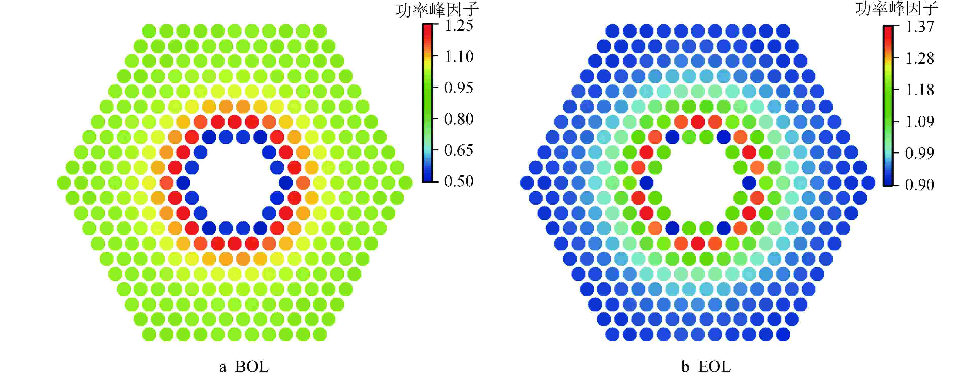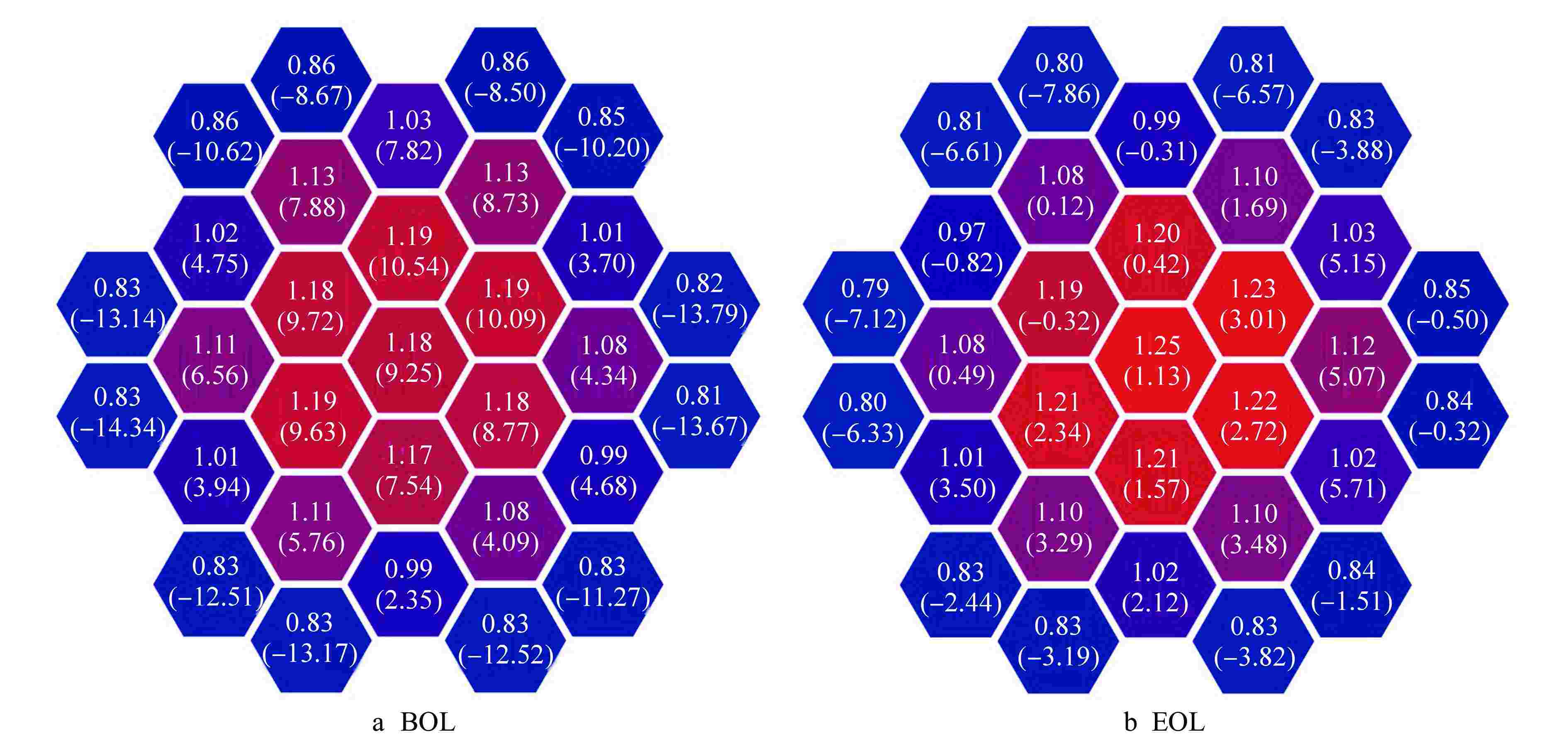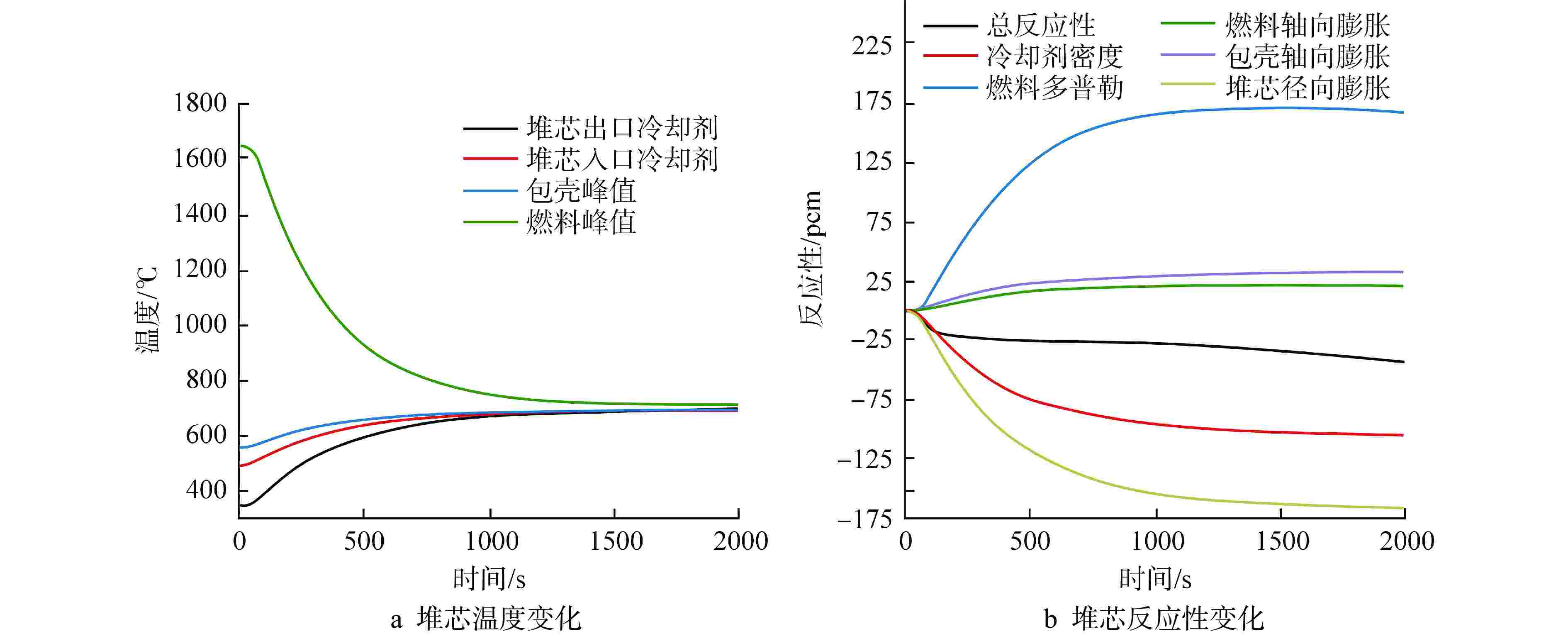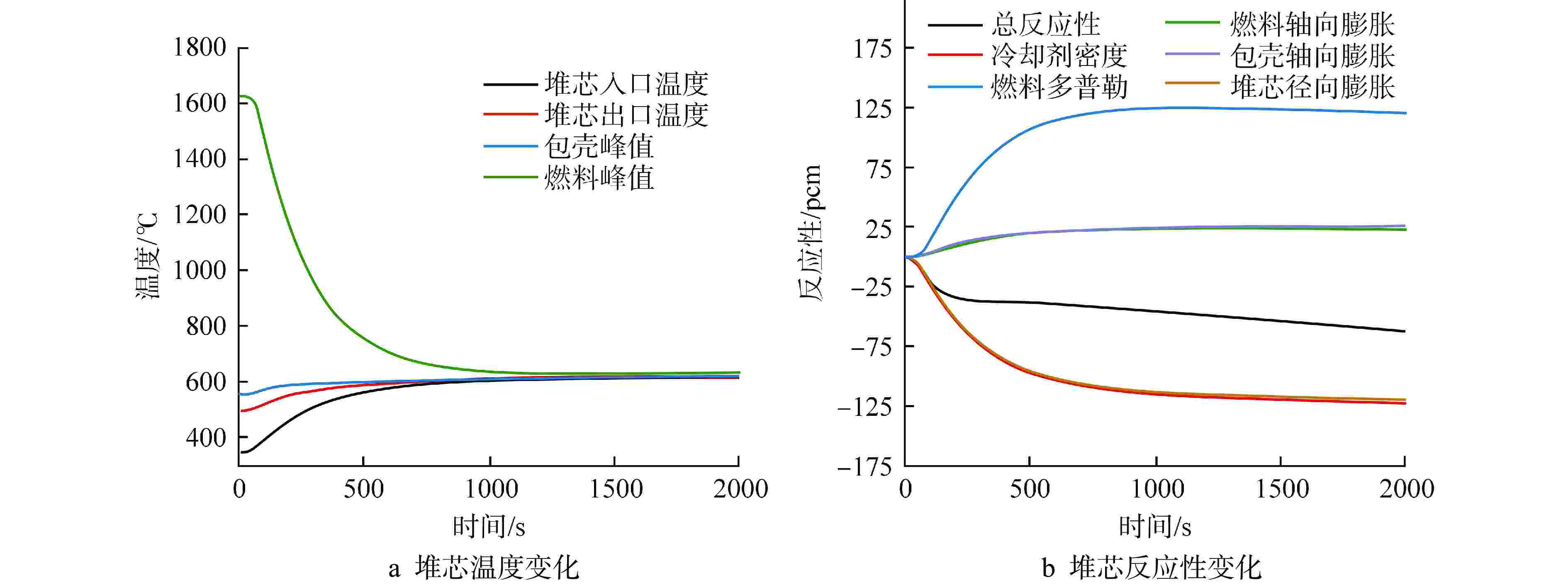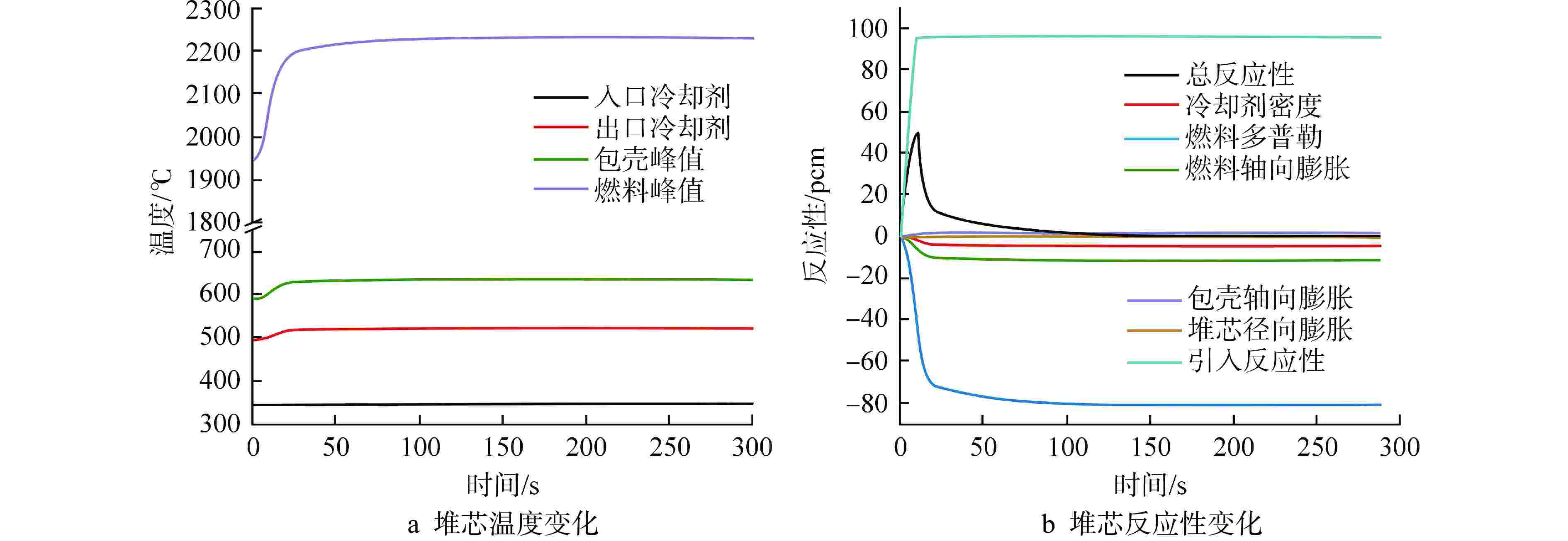 参数 LFR-180 LFR-180BP BOL EOL BOL EOL 缓发中子份额/pcm 777 658 776 674 寿期反应性波动/pcm 6681 575 堆芯空泡价值/pcm −16515±25 −16380±25 −10425±25 −9796±25 冷却剂密度反应性反馈系数/(pcm·K−1) −0.68±0.02 −0.60±0.03 −0.43±0.03 −0.37±0.03 多普勒常数/pcm 燃料 −476±27 −481±31 −834±31 −1011±30 结构材料 −24±26 −57±26 −82±30 −23±30 堆芯径向膨胀反应性反馈系数/(pcm·K−1) −0.45±0.04 −0.44±0.04 −0.50±0.04 −0.48±0.04 燃料包壳轴向膨胀反应性反馈系数/(pcm·K−1) 0.18±0.02 0.14±0.03 0.17±0.03 0.12±0.03 燃料轴向膨胀反应性反馈系数/(pcm·K−1) −0.18±0.05 −0.17±0.05 −0.28±0.05 −0.19±0.05 -