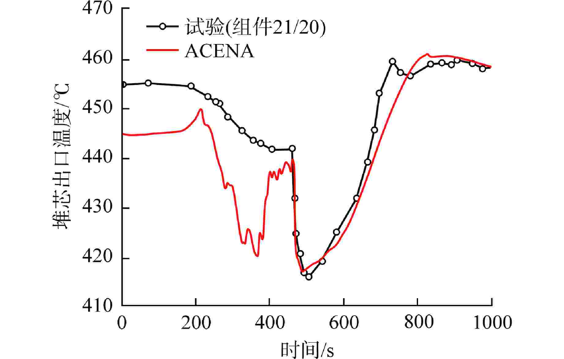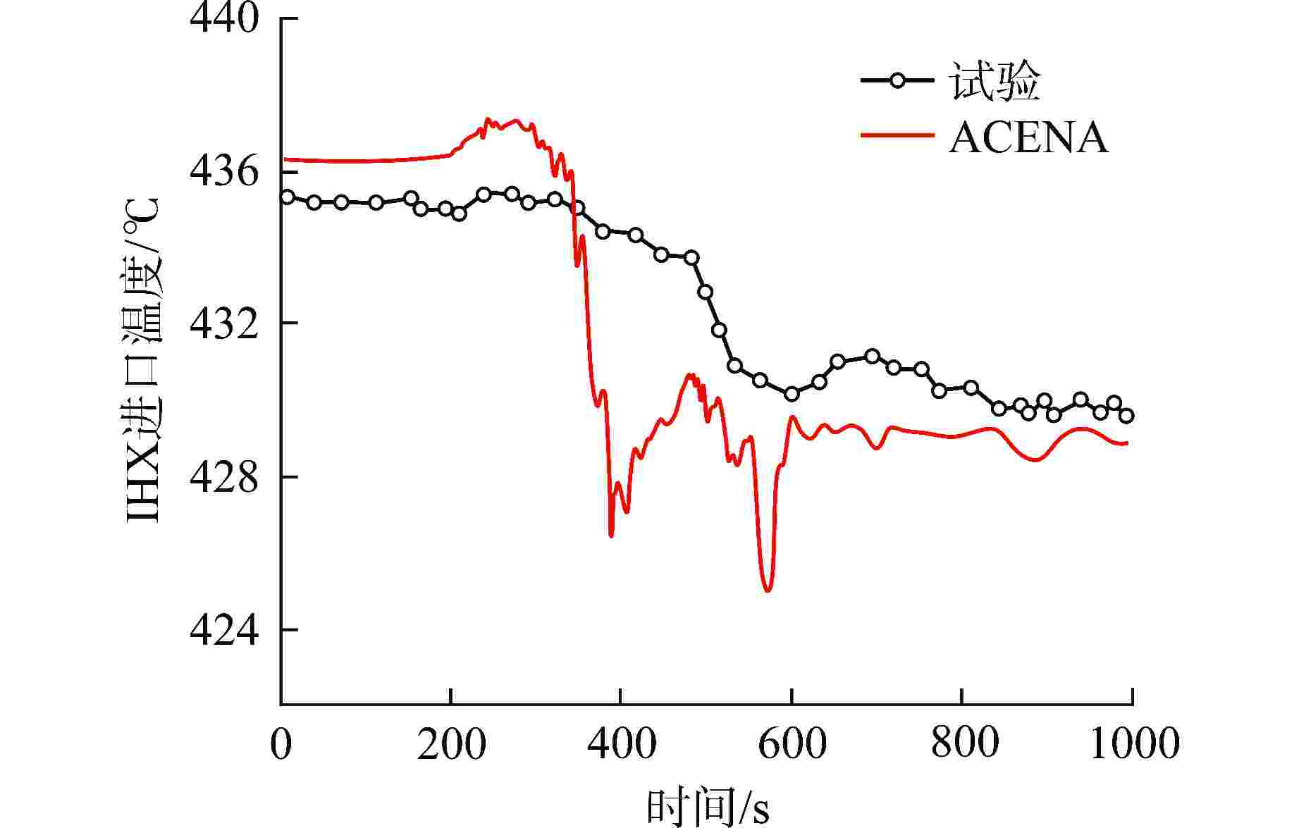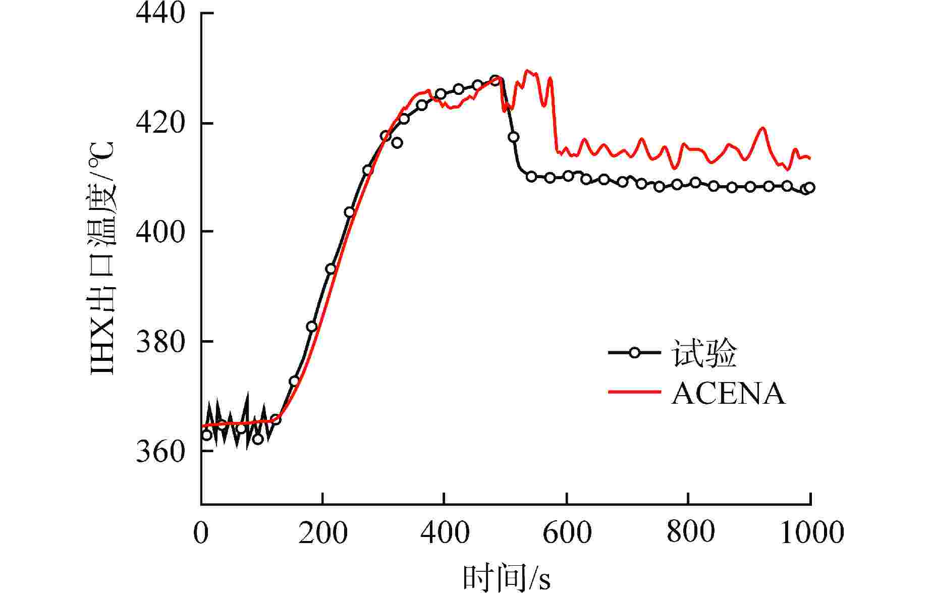 参数 试验值 ACENA 绝对偏差 堆芯进口温度/℃ 358 364.1 6.1 堆芯出口温度/℃ 432 436.3 4.3 IHX一次侧进口温度/℃ 432 436.3 4.3 IHX一次侧出口温度/℃ 360 365.5 5.5 冷池温度/℃ 358 362.0 4.0 堆芯质量流量/(kg·s−1) 1284 1282.8 −1.2 -