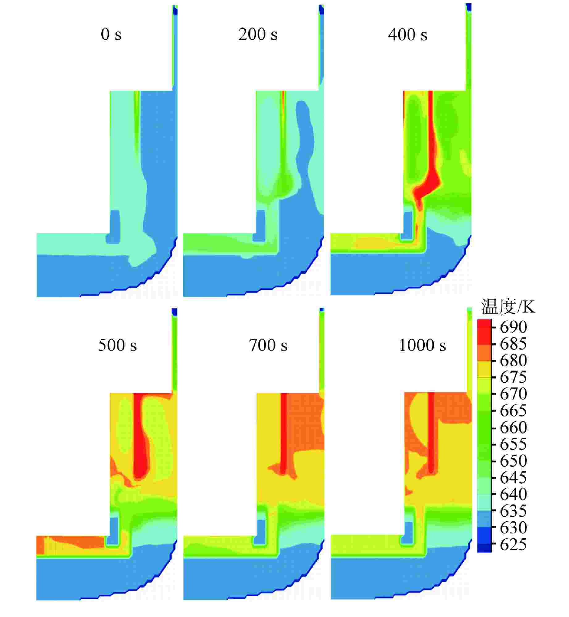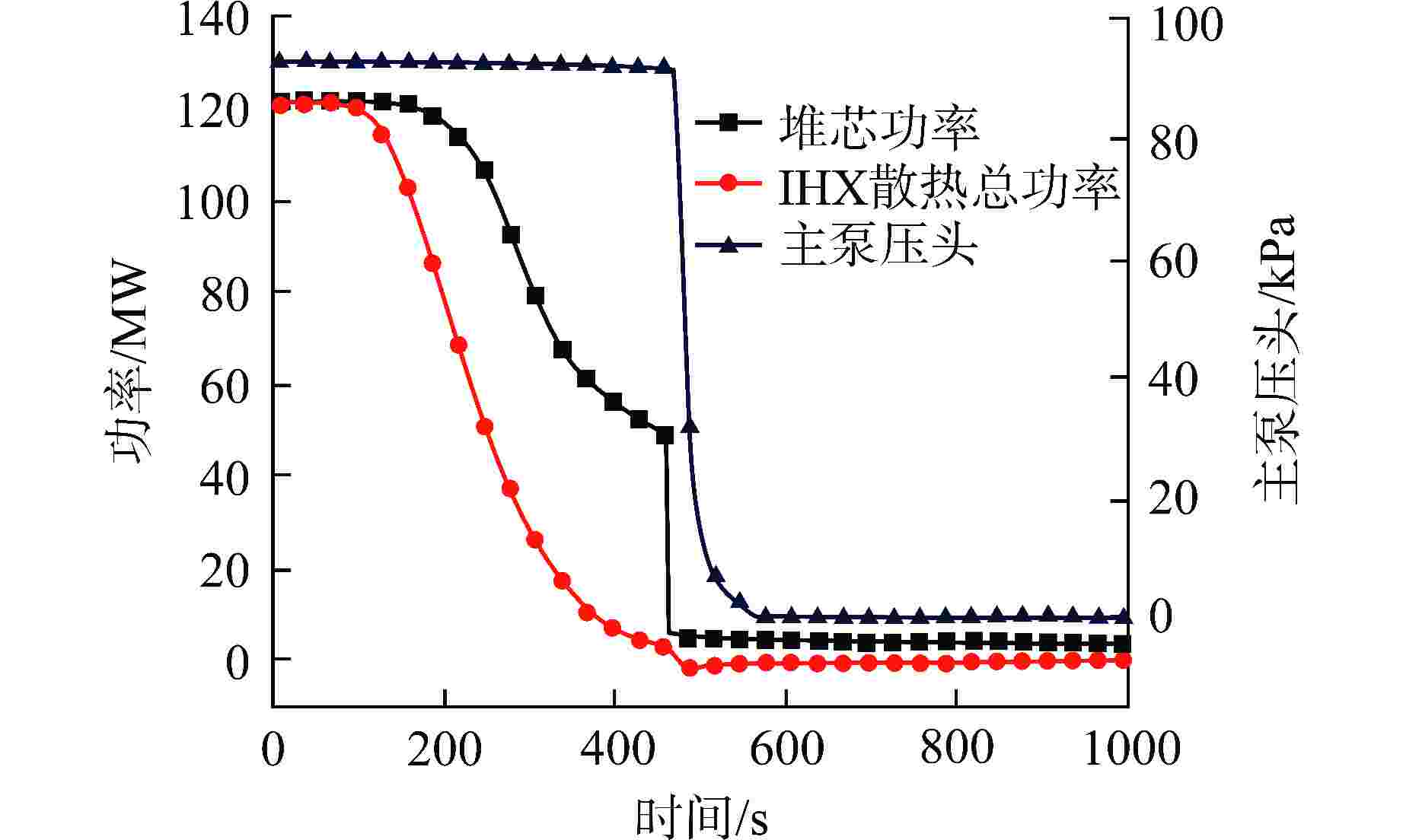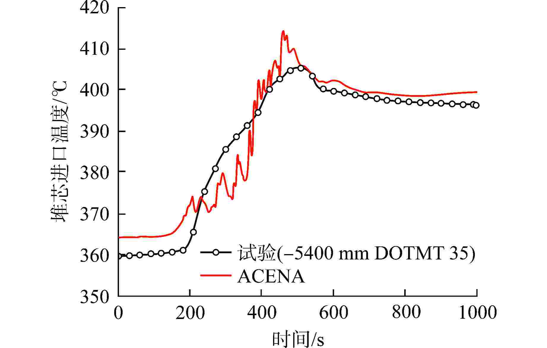 参数 试验值 ACENA 绝对偏差 堆芯进口温度/℃ 358 364.1 6.1 堆芯出口温度/℃ 432 436.3 4.3 IHX一次侧进口温度/℃ 432 436.3 4.3 IHX一次侧出口温度/℃ 360 365.5 5.5 冷池温度/℃ 358 362.0 4.0 堆芯质量流量/(kg·s−1) 1284 1282.8 −1.2 -