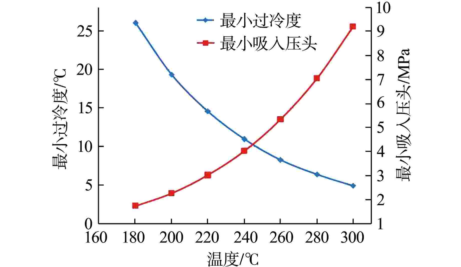 温度/℃ 最小吸入压头/MPa 对应饱和温度/℃ 最小过冷度/℃ 180 1.76 206.01 26.01 200 2.28 219.34 19.34 220 3.02 234.59 14.59 240 4.03 250.95 10.95 260 5.34 268.32 8.32 280 7.05 286.41 6.41 300 9.21 304.93 4.93 -