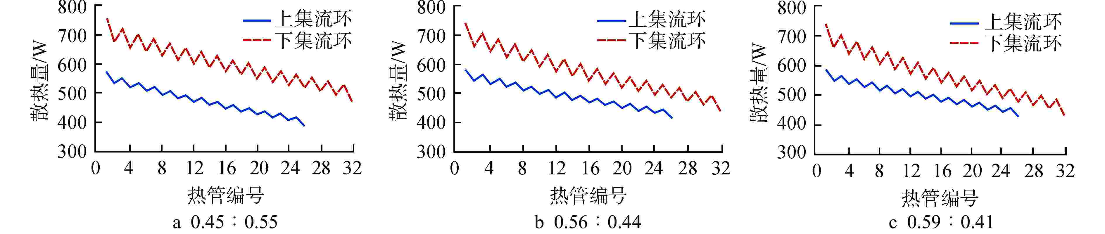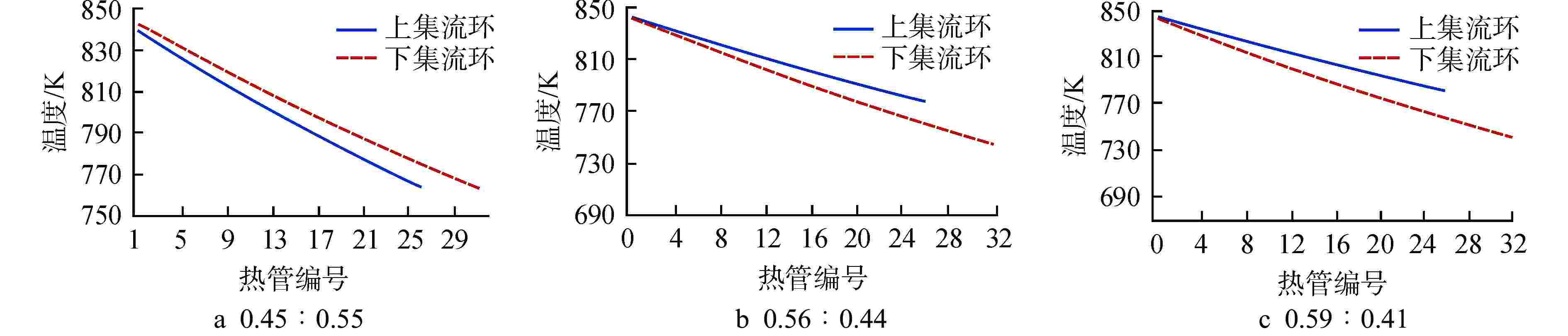 分流比 0.45∶0.55 0.56∶0.44 0.59∶0.41 上集流环温降/K 77.71 64.23 61.37 下集流环温降/K 83.11 96.89 101.44 上集流环热管散热量/kW 12.292 12.841 12.962 下集流环热管散热量/kW 19.173 18.336 18.068 上集流环外壁散热量/kW 0.0812 0.0843 0.0850 下集流环外壁散热量/kW 0.0954 0.0916 0.0904 -