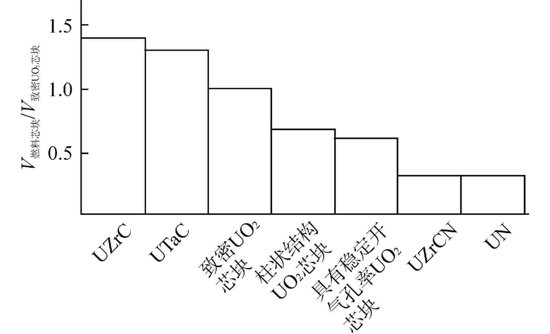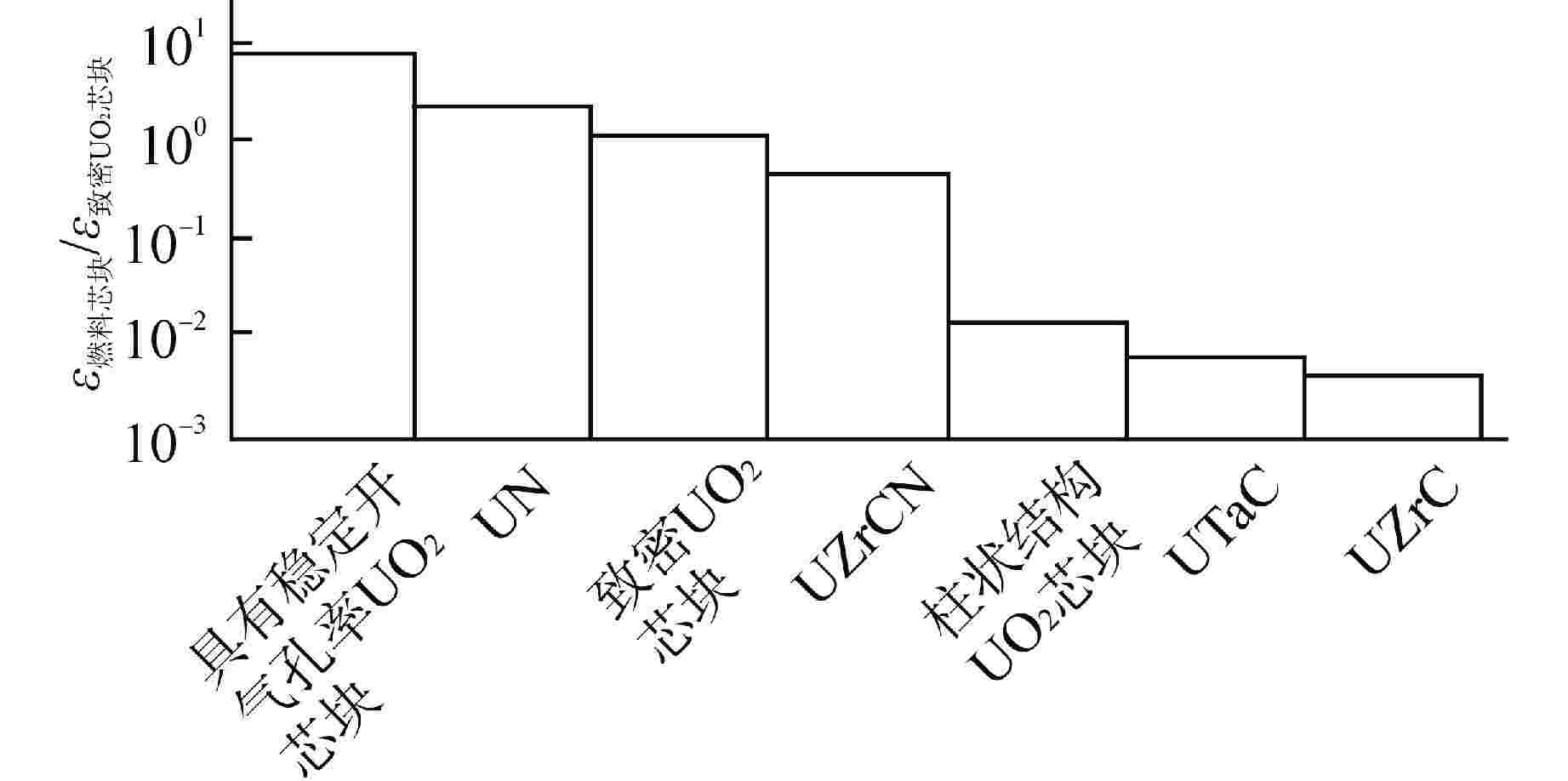 芯块性能 对不同运行工况的影响 正常运行 功率跃升 冷却剂丧失事故 全厂断电事故 反应性引入事故 熔点 ↑ ↑ ↑ ↑ ↑ 热导率 ↑ ↑ ↑ — — 比热容 — — ↑ ↑ ↓ 热膨胀系数 — ↓ — — ↓ 蠕变速率 — ↑ — — — 强度 — ↓ — — ↓ 辐照肿胀 ↓ ↓ ↓ ↓ ↓ 注: ↑表示需要提高的性能;↓表示该性能需要降低;—表示该项性能对该事故工况下不敏感 -